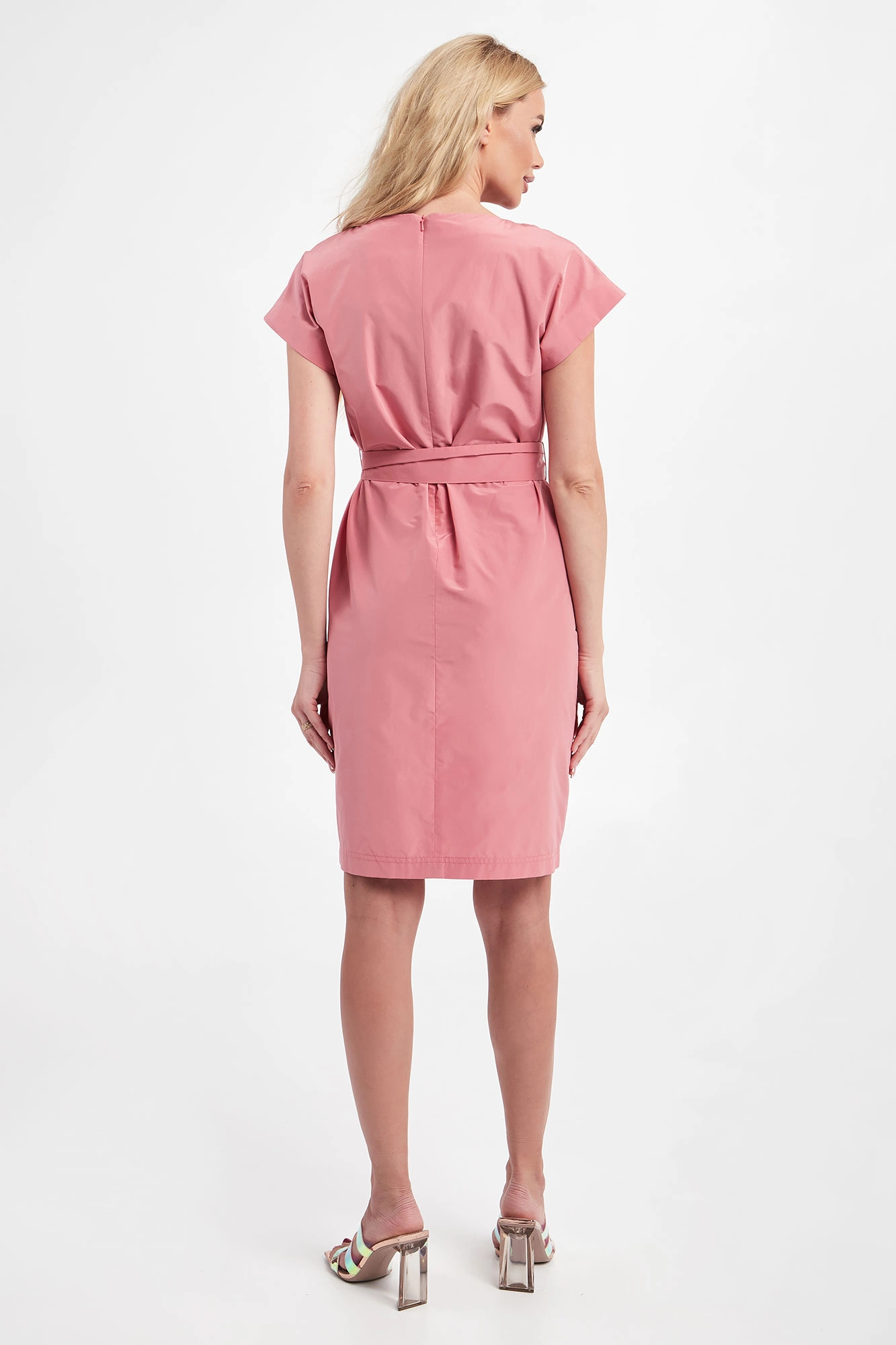 Sukienka marki Weekend Max Mara w różowym kolorze. Wykonana z bawełnianej tafty. Fason regular fit, długość mini. Obniżona linia ramion, krótkie rękawy. Marszczony dekolt typu o-neck. Dół wykończony lamówką. Zapinana za pomocą tylnego zamka. Dodatkowo w talii pasek w kolorze sukienki.