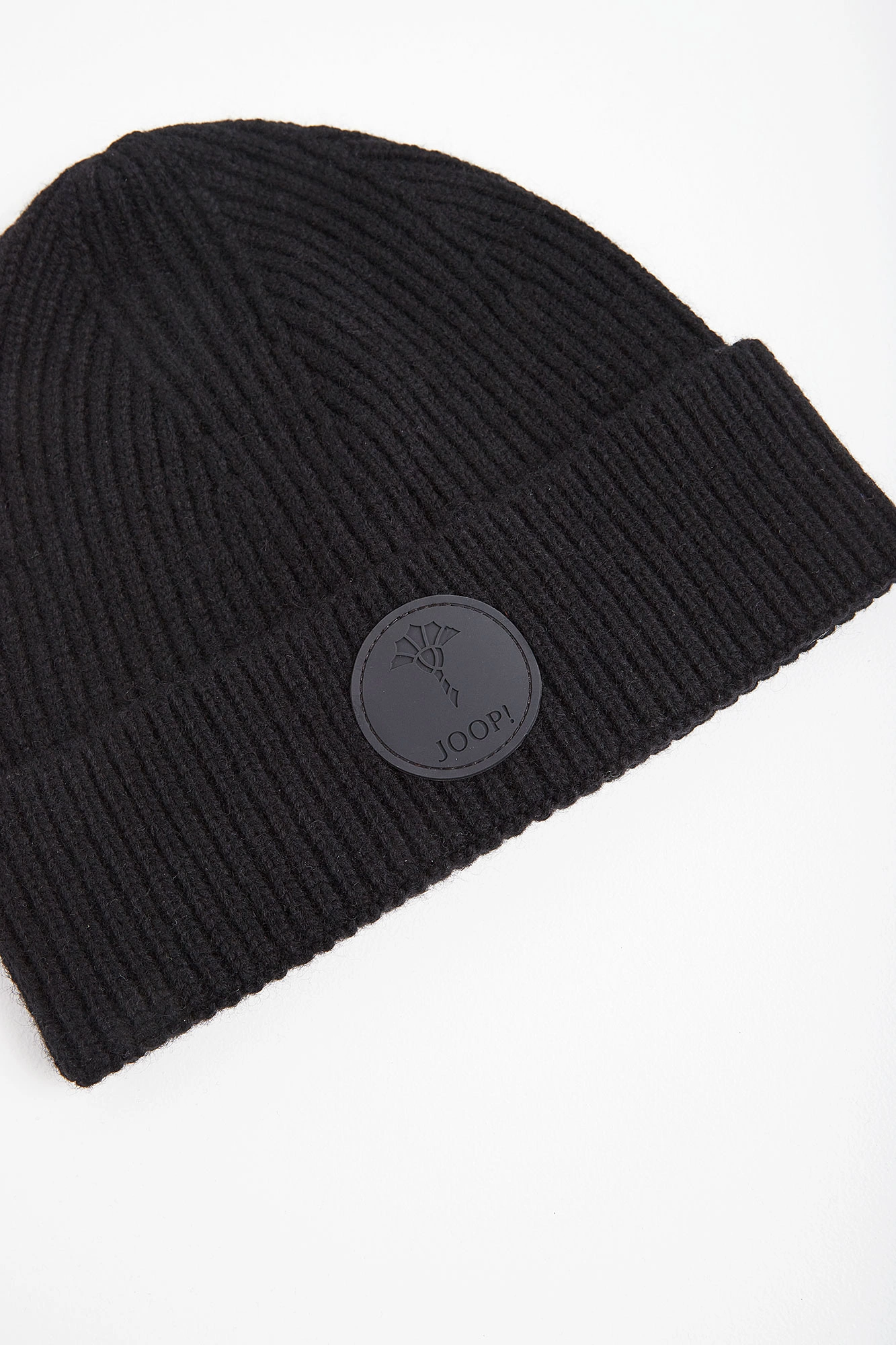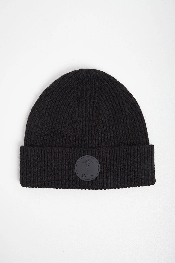 Wełniana czapka marki Joop! w czarnym kolorze. Na całości prążki. Z przodu gumowana naszywka z logo. Zakończona podwijanym ściągaczem. Niezwykle miękka i ciepła.