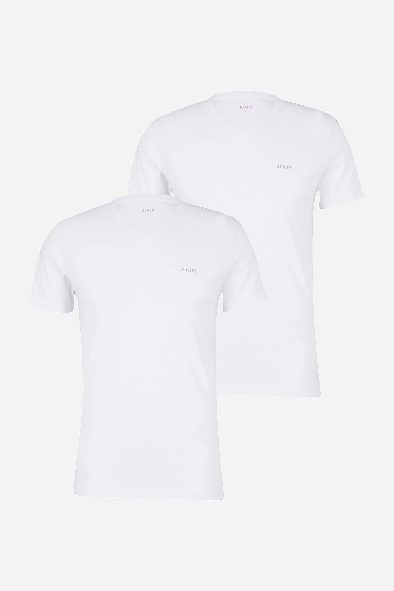 Dwupak t-shirtów w białym kolorze marki Joop! Klasyczny krój o dopasowanym fasonie. Dekolt typu v-neck. Z przodu niewielkie logo w szarym kolorze. Wykonane z bawełnianej tkaniny z dodatkiem elastanu. Krótkie rękawy, dekolt i dół zakończone lamówką. Klasyczne i wygodne.