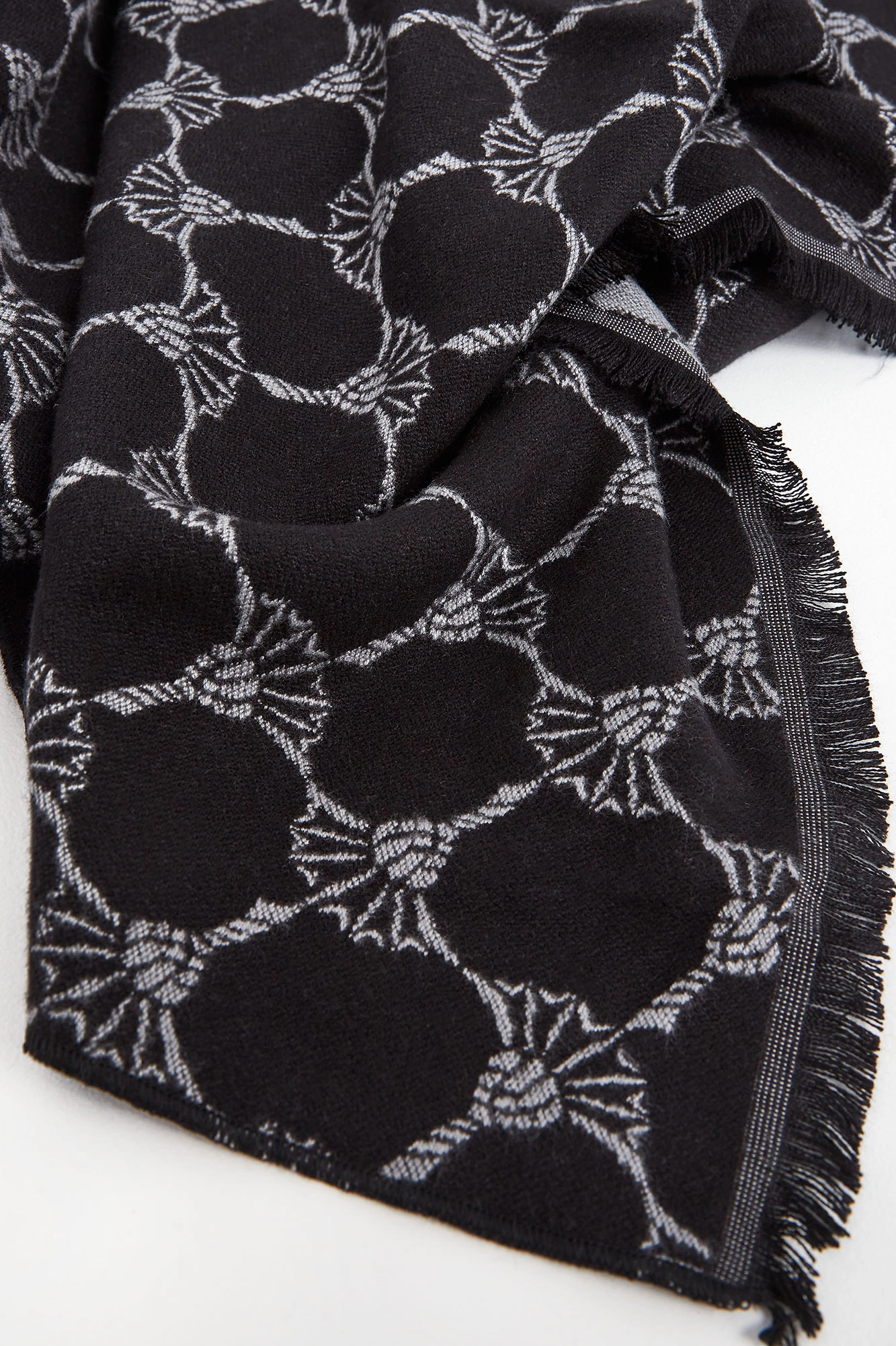 Szalik marki Joop! w czarnym kolorze. Na całości jasnoszary wzór z monogramem. Zakończony frędzlami. Z boku srebrna, sygnowana zawieszka. Wykonany z czystej wiskozy.