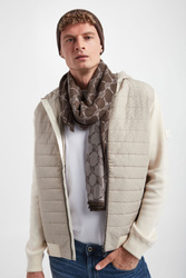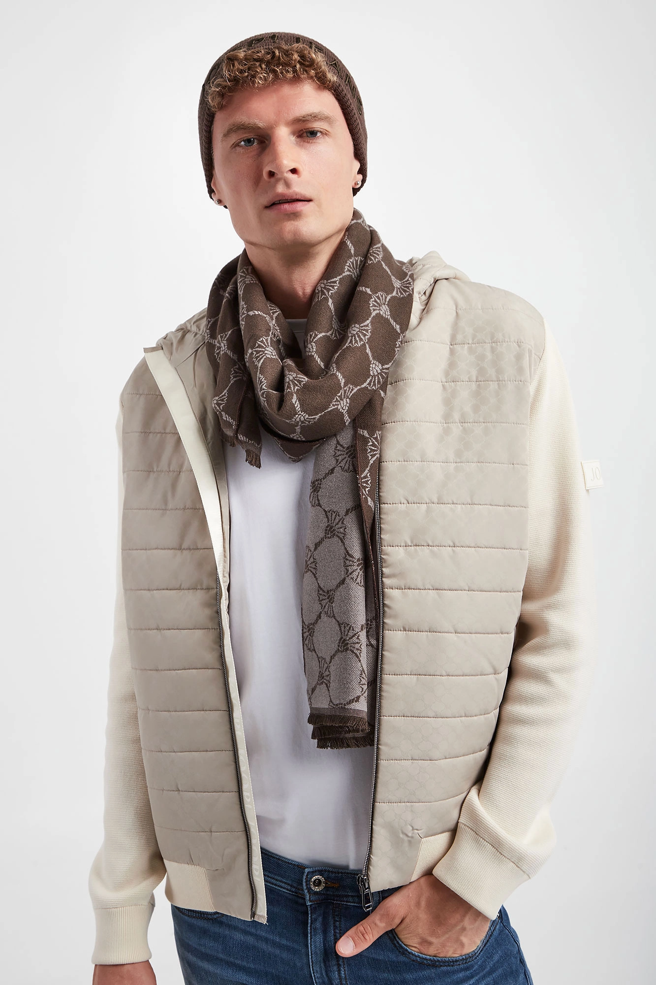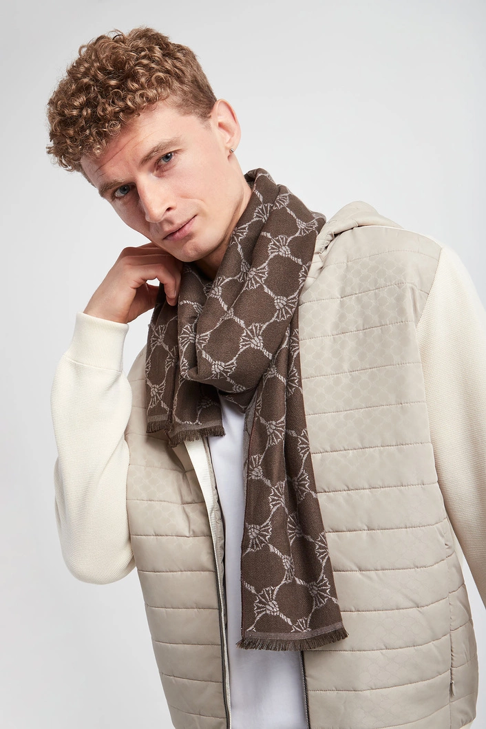 Wiskozowy szalik marki Joop! w kolorze khaki. Na całości wzór w postaci multiplikacji logo marki w jasnoszarym kolorze. Druga strona odwrotna pod względem kolorystycznym. Na brzegu mała, sygnowana zawieszka. Brzegi wykończone na surowo.