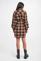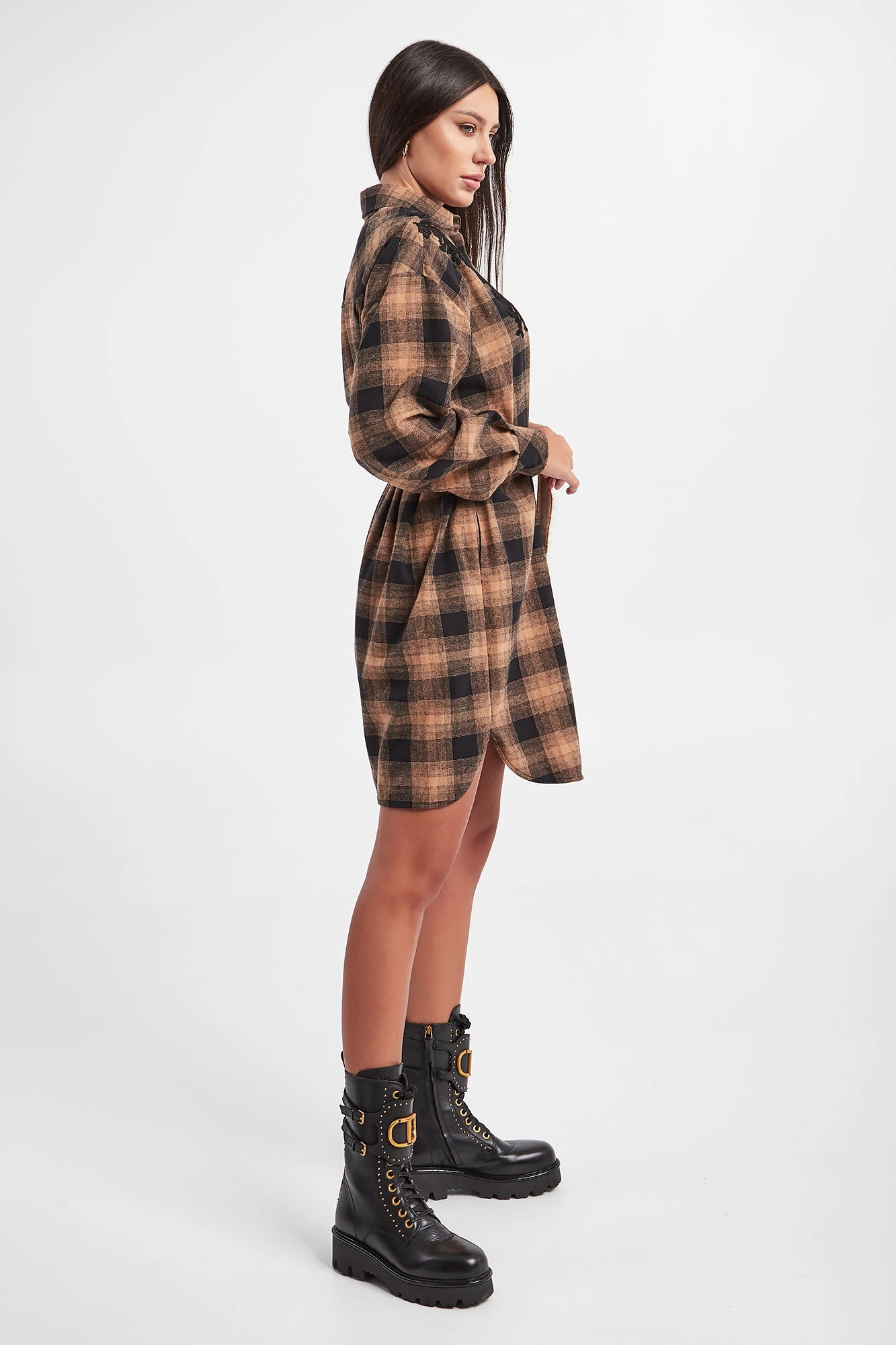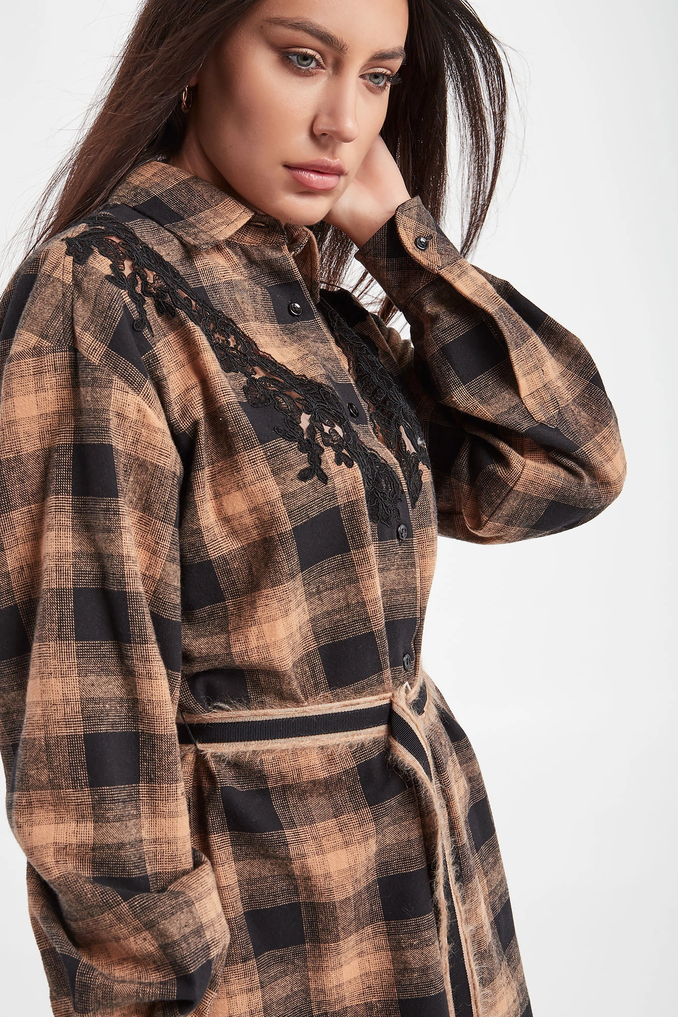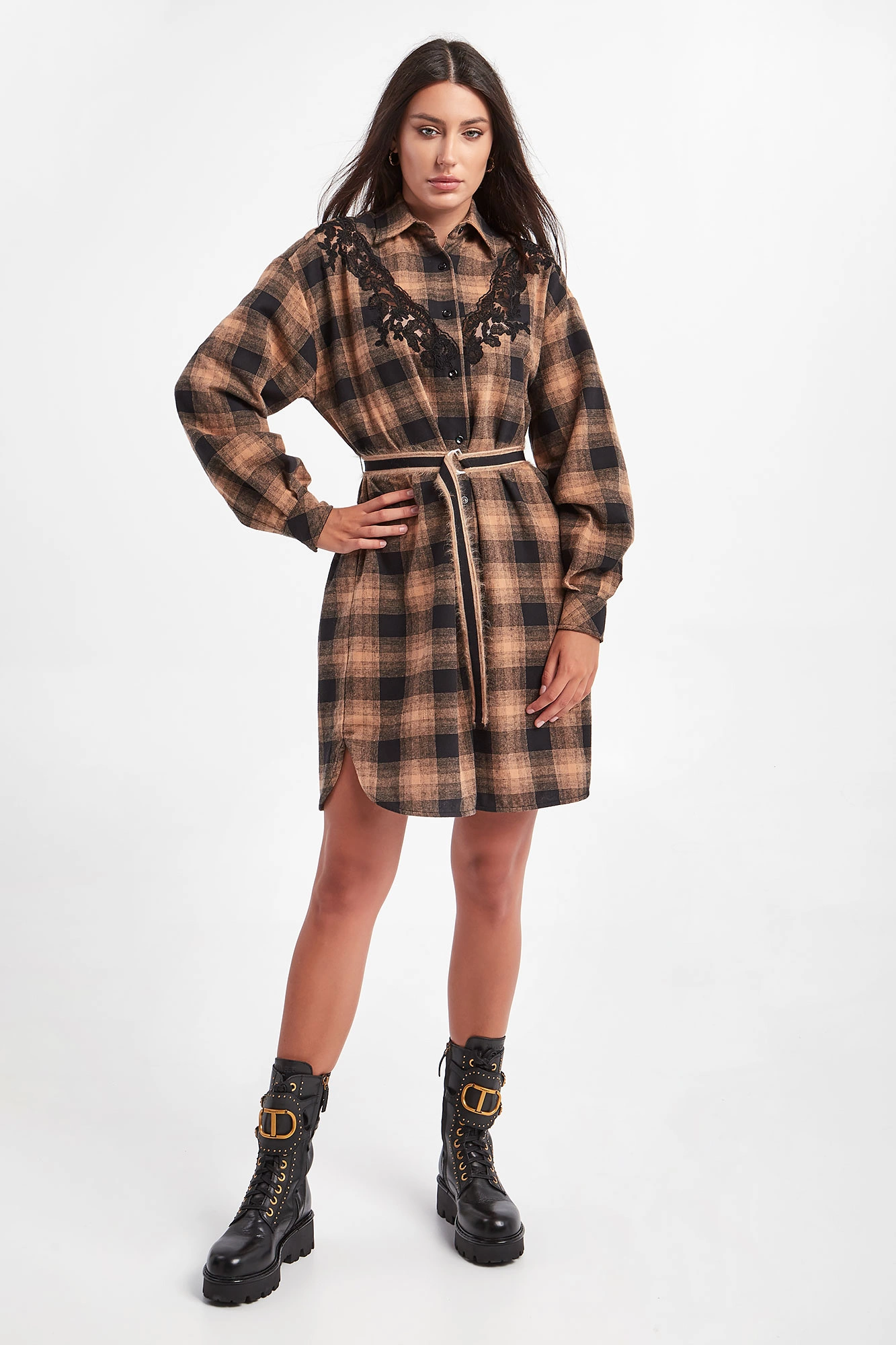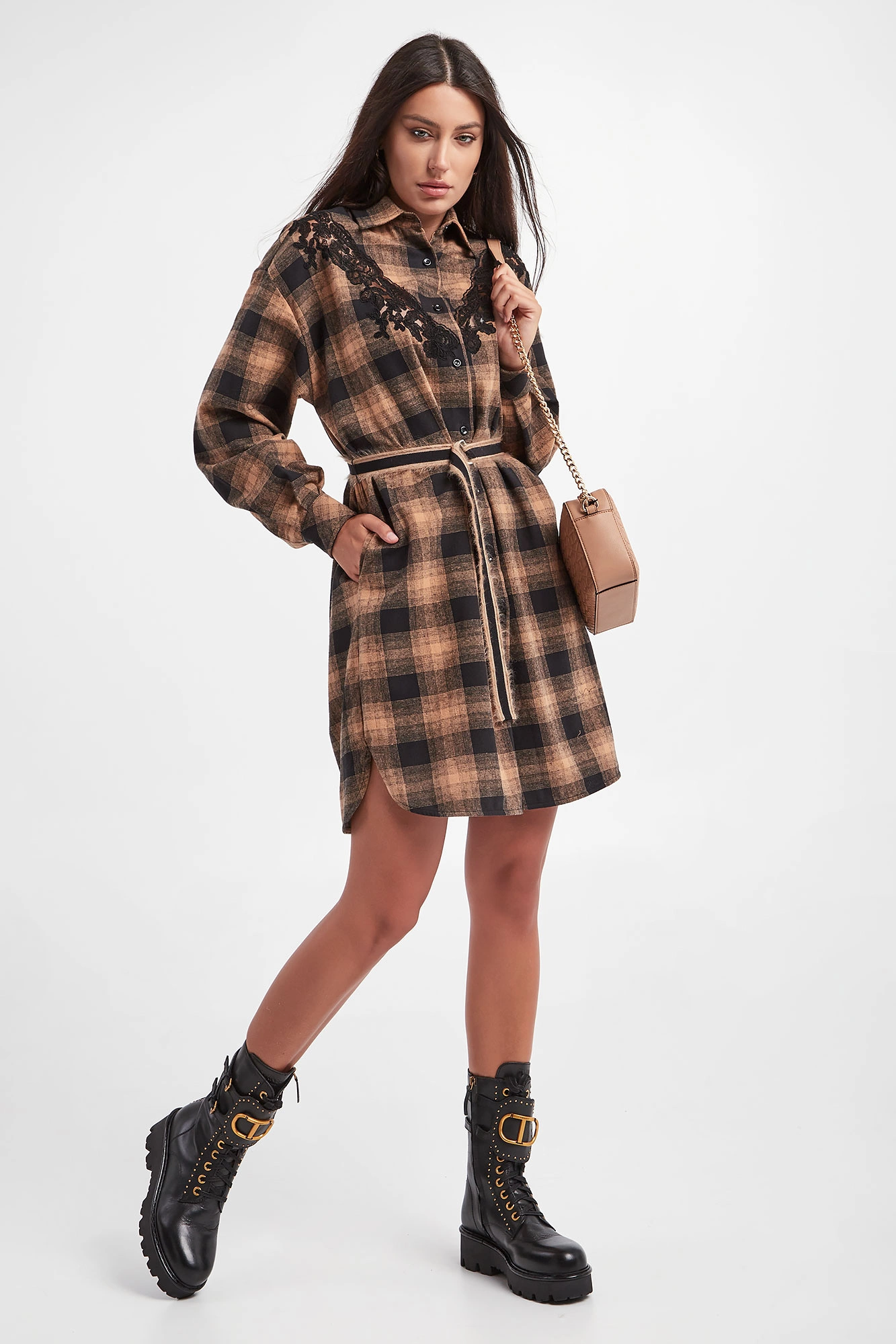 Sukienka marki Ermanno Firenze w brązowo-czarnym kolorze. Na całości nadruk w postać kratki. Typu szmizjerka. Dekolt wykończony klasycznym kołnierzem. Z przodu ozdobna koronka i haft w czarnym kolorze. Zapinana za pomocą guzików. Długie rękawy zakończone mankietem zapinanym na guziki. W talii szlufki i pasek zapinany za pomocą metalowej klamry. Fason typu regular fit o długości mini. Wykonana z bawełnianej tkaniny.