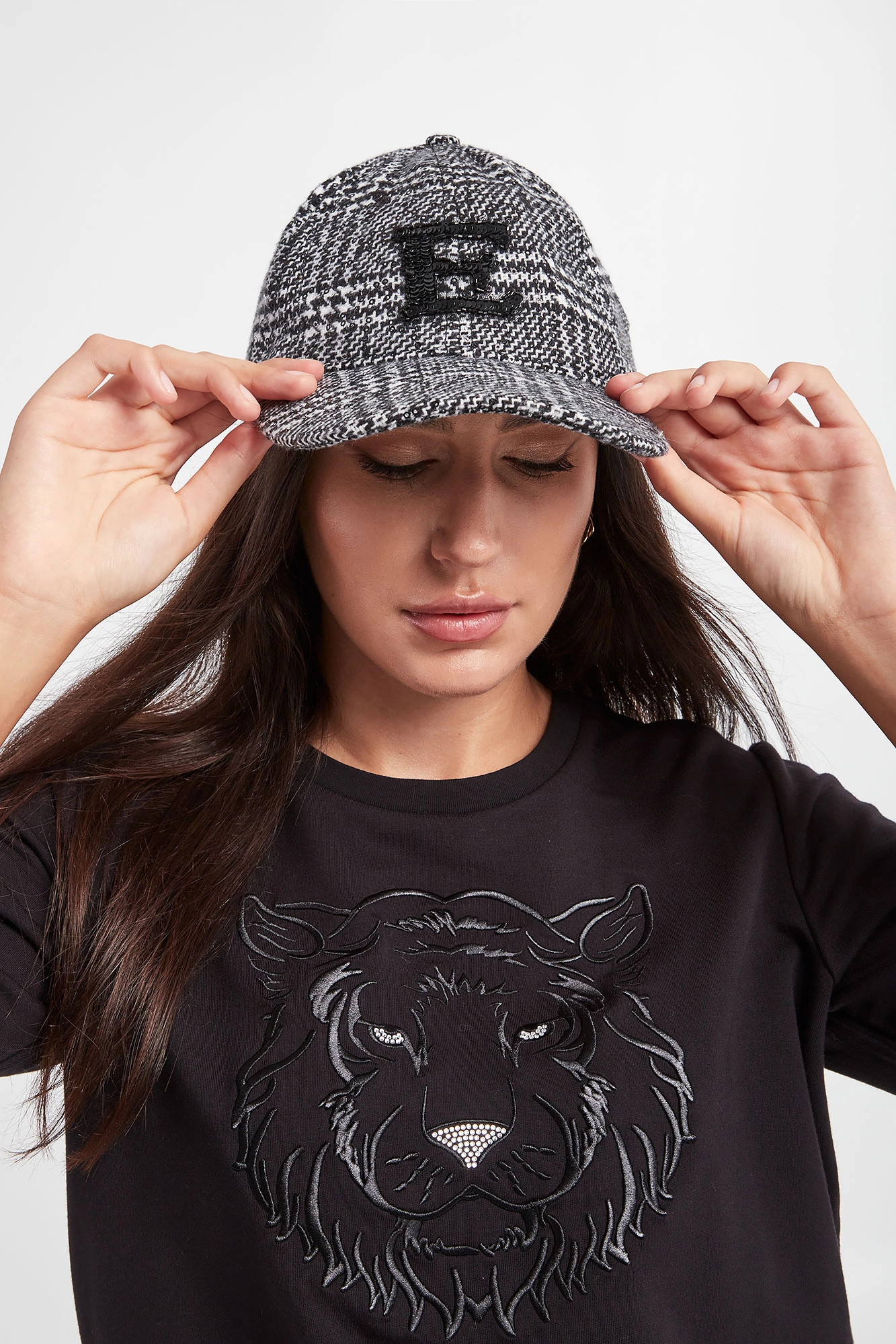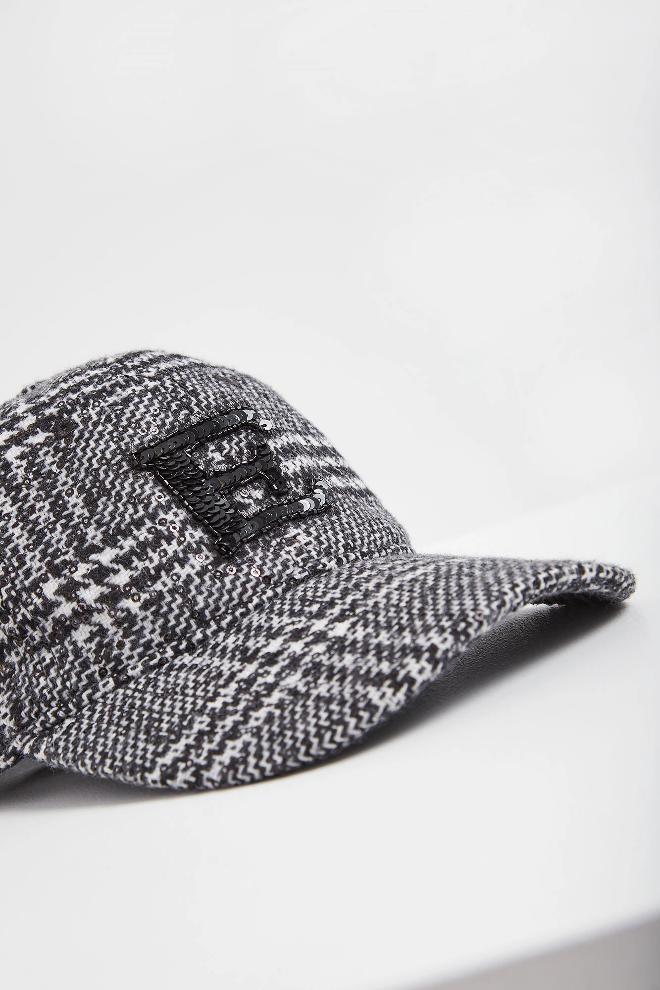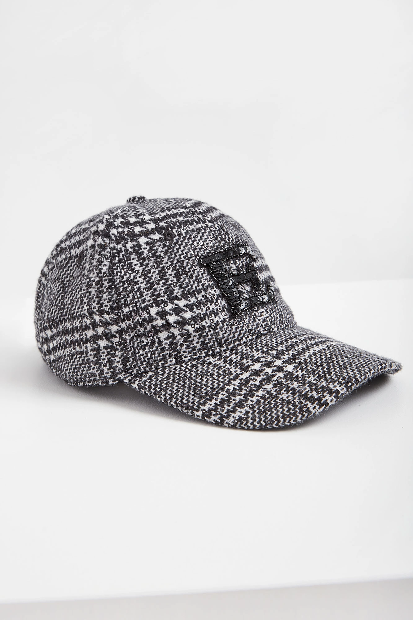 Czapka z daszkiem marki Ermanno Frienze. Na całości biało-czarna krata glencheck i nieregularnie przyszyte cekiny. Na froncie aplikacja w kształcie litery E z cyrkonii i koralików w czarnym kolorze. Z tyłu haft w postaci nazwy marki. Regulowana z tyłu.