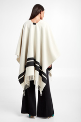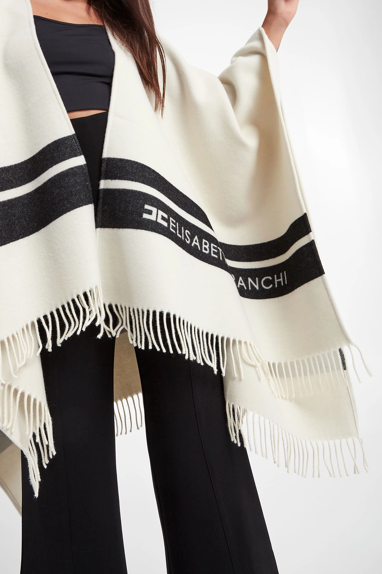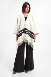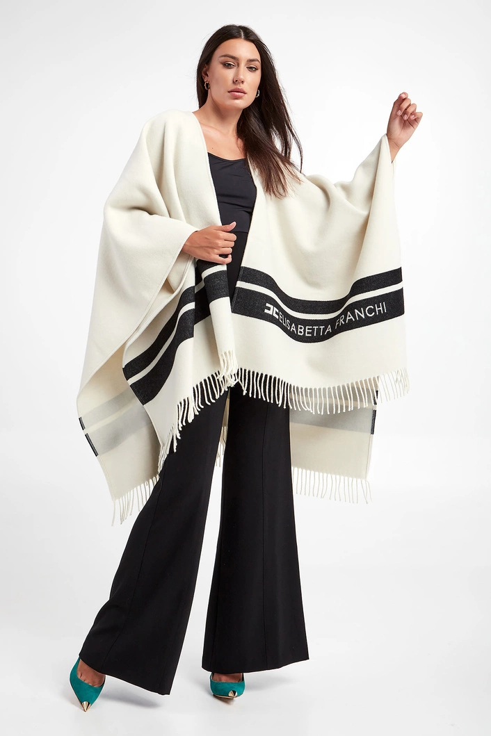 Wełniane ponczo marki Elisabetta Franchi w kremowym kolorze. Model w rozmiarze one size. Na końcach czarne paski w nazwą i logo marki oraz ozdobne frędzelki. Ciepłe i wygodne dopełnienie stylizacji.