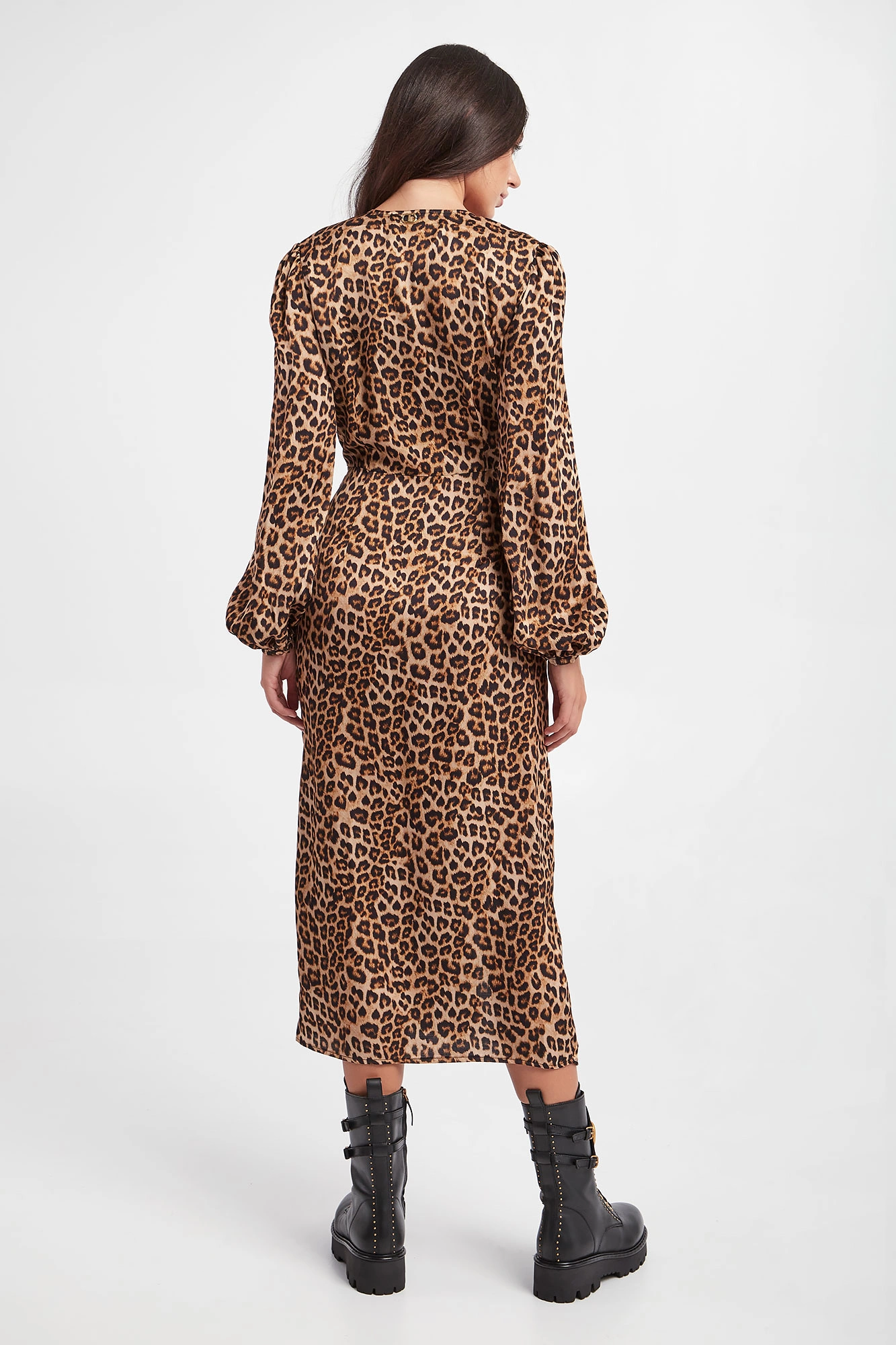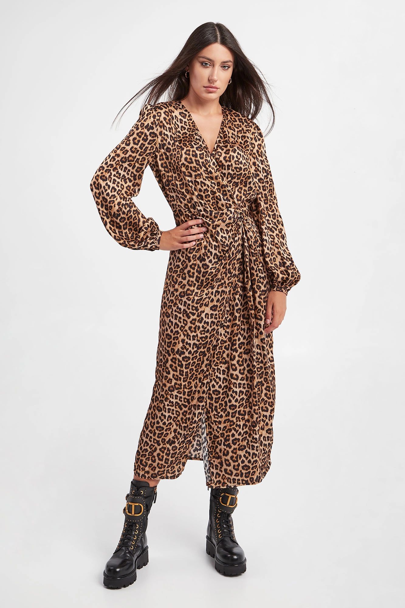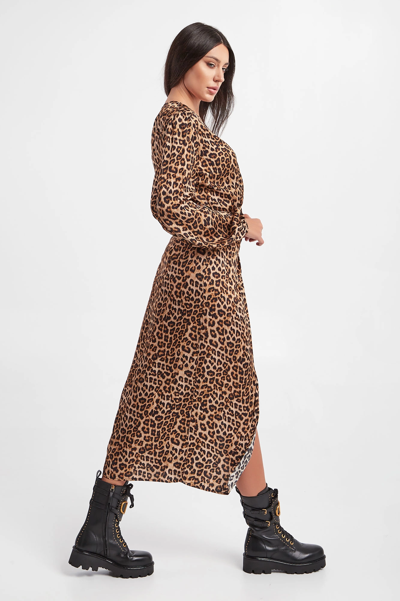Satynowa sukienka marki Twinset w beżowym kolorze. Na calości brązowo-czarny, zwierzęcy wzór. Fason slim fit, długość midi, kopertowy krój. Dekolt typu v-neck, długie, delikatnie bufiaste rękawy rękawy zakończone wąskim, zapinanym mankietem. W talii odcięcie oraz marszczenie. Na linii karku złota, logowana zawieszka. Zapinana na boczny zamek.