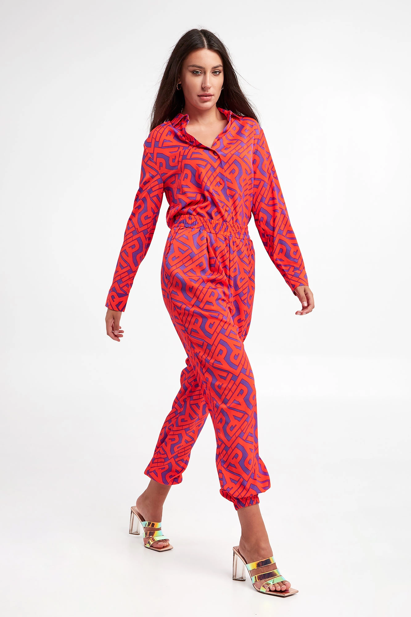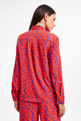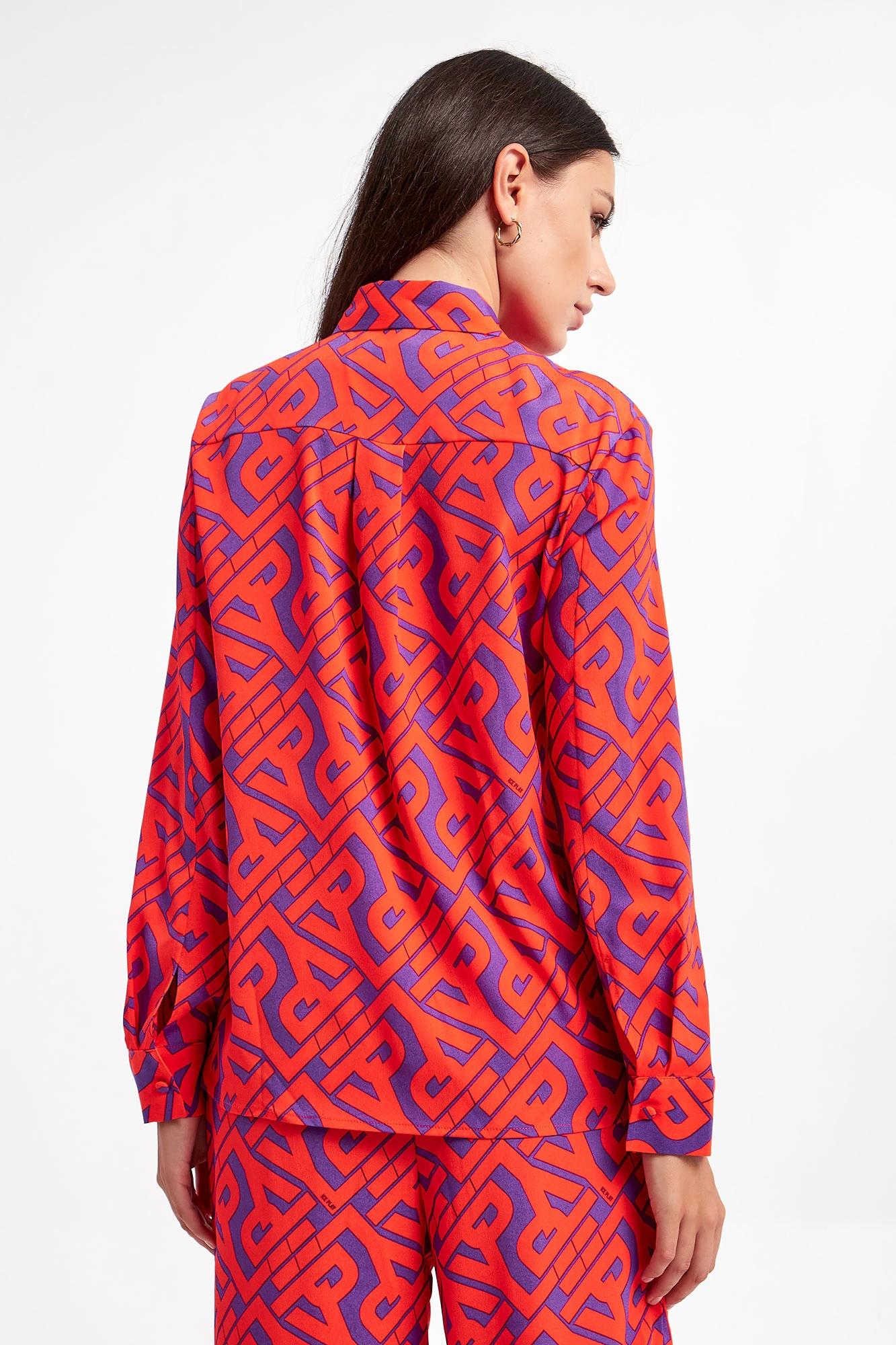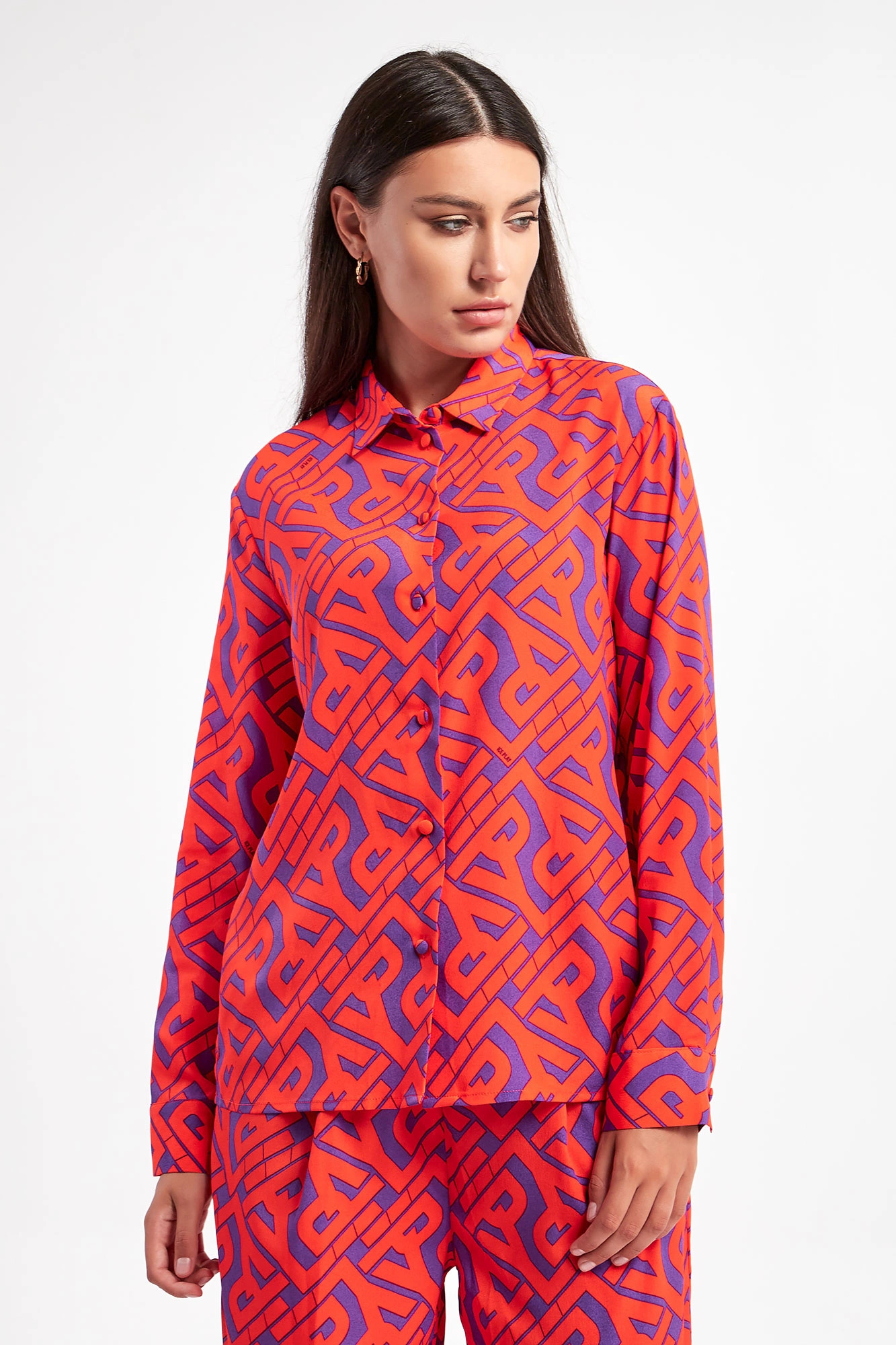 Koszula marki Ice Play w pomarańczowym kolorze. Na całości wzór w postaci logo marki w fioletowym kolorze. Z tyłu karczek oraz zakładka. Zapinana na guziki powlekane materiałem. Dekolt zakończony klasycznym kołnierzykiem. Rękawy wykończone mankietami zapinanymi na guzik.