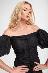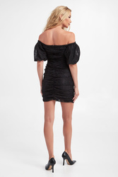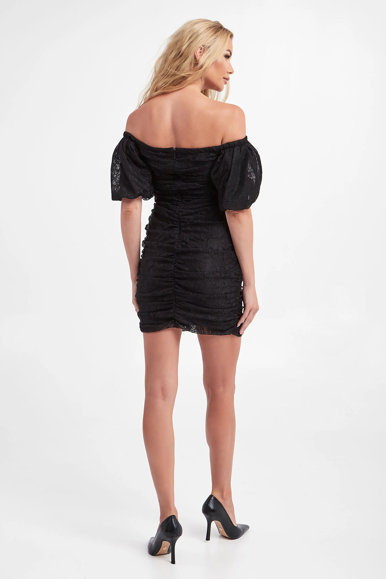 Sukienka marki Pinko w czarnym kolorze. W całości wykonana z koronki. Wewnątrz podszewka. Z przodu marszczenie. Z tyłu zapinana na kryty zamek. Dekolt hiszpański oraz krótkie bufiaste rękawki. Fason typu slim fit o długości mini.