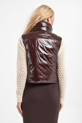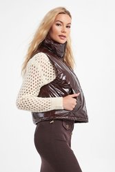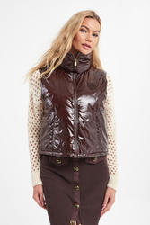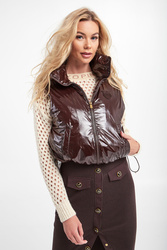 Kamizelka ze stójką marki Pinko w kolorze brązowym. Wykonana z połyskującej tkaniny. Regularny fason. Zapinana na zamek ze złotą zawieszką. Model z dwiema kieszeniami zapinanymi na napy. Na froncie aplikacja z logo marki. Dół wykończony ściągaczem ze stoperami, umożliwiającymi regulację.