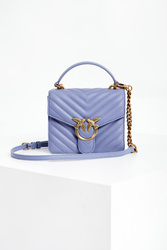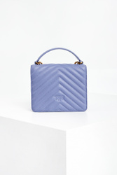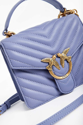Skórzana torebka Love Mini Top Handle Chevron marki Pinko w kolorze niebiesko-fioletowym. Na całości pikowania. Zapinana klapa ozdobiona metalowym, złotym logo "Love Birds". Jednokomorowa. Z tyłu haft z logo. Do noszenia w ręku lub na regulowanym, czarnym pasku ze wstawkami złotego łańcucha.