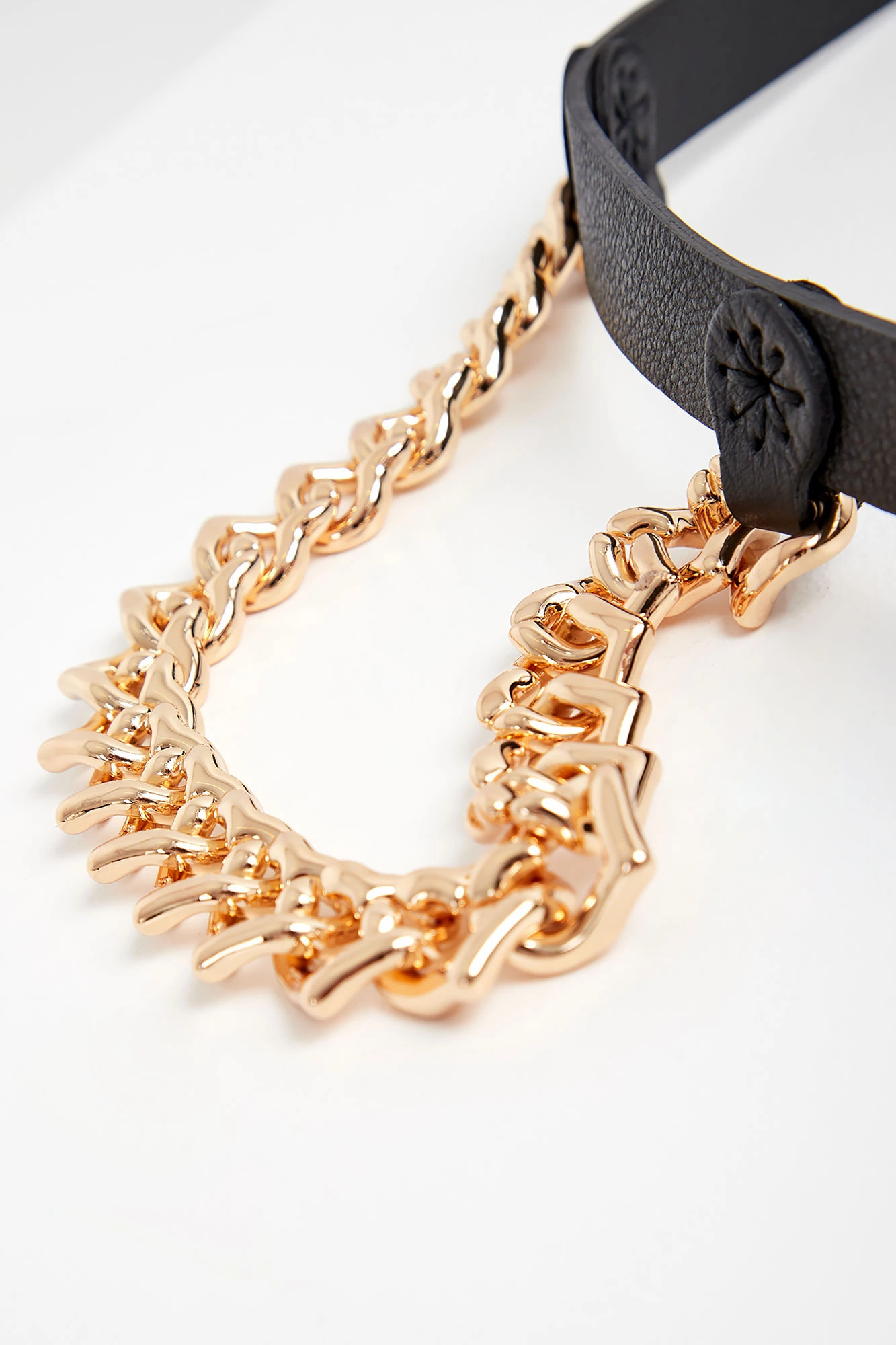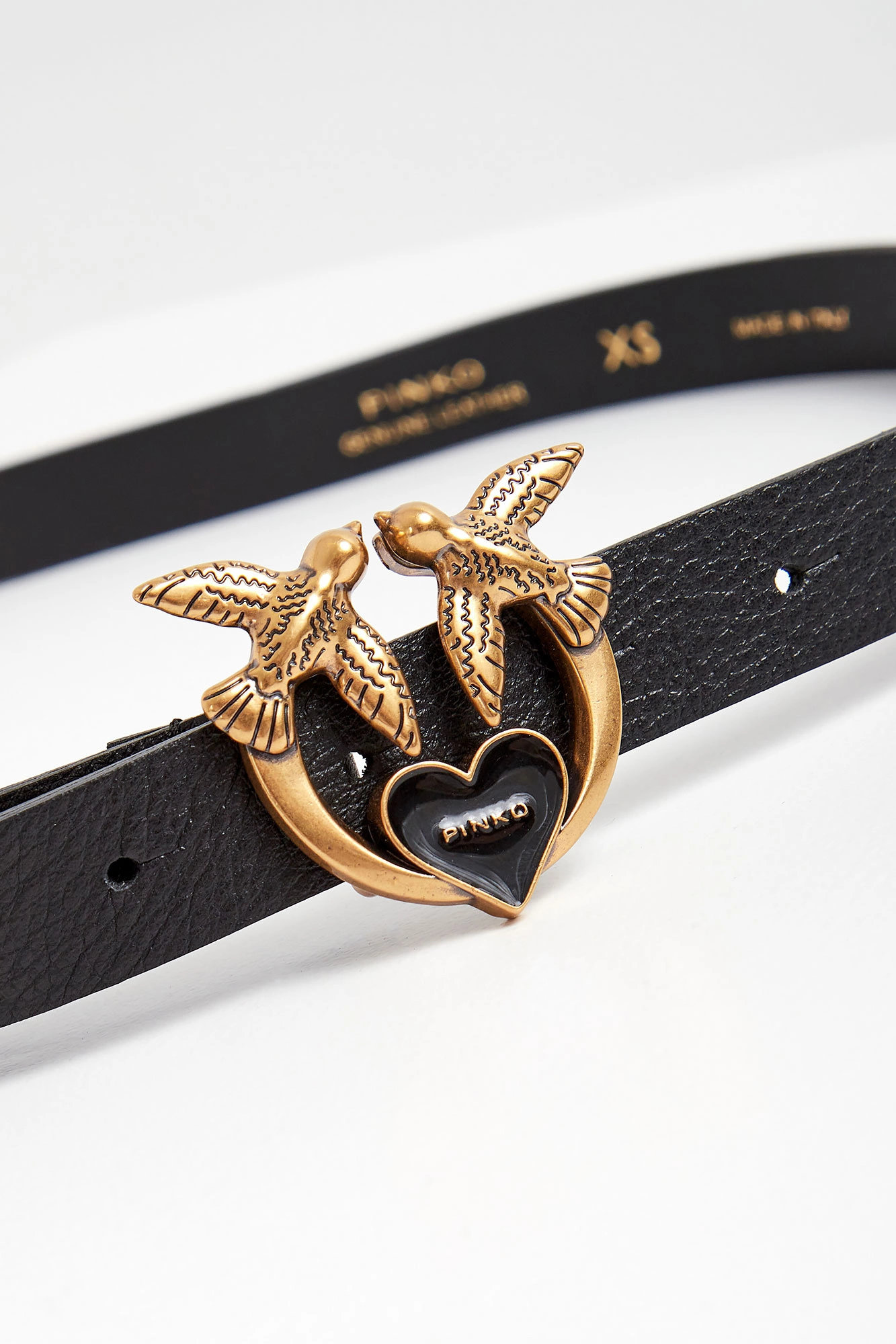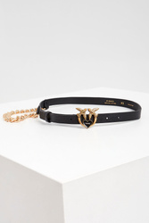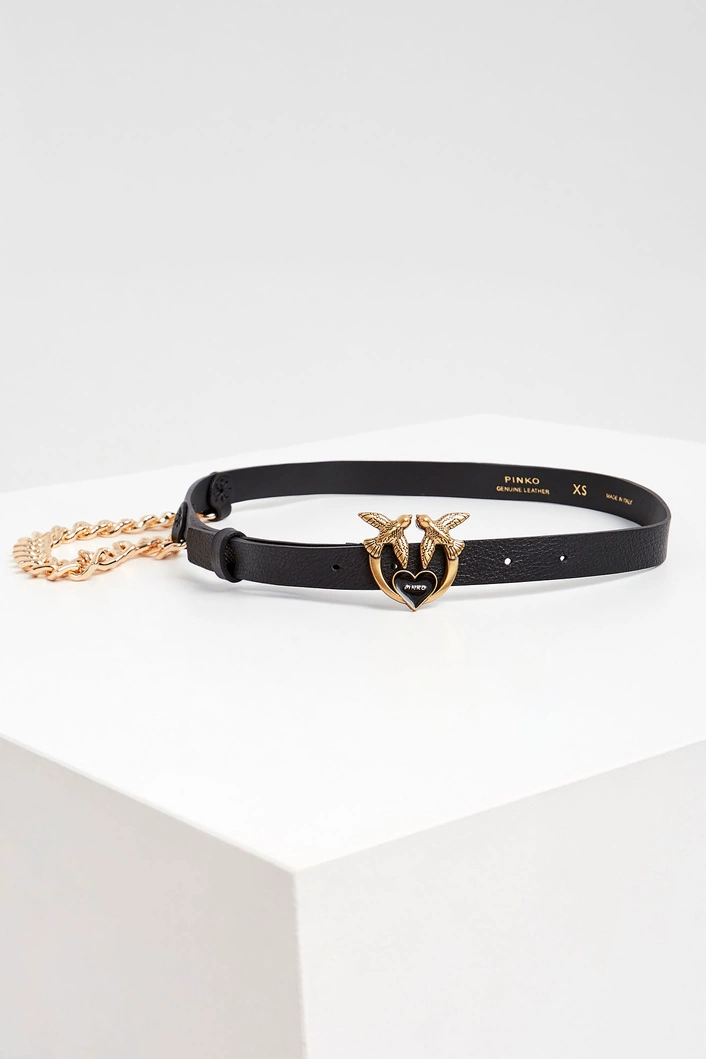 Skórzany pasek marki Pinko w czarnym kolorze. Zapinany za pomocą klamry z logo "Love Birds" w złotym kolorze. W zestawie ozdobny, szeroki łańcuch w złotym kolorze. Wykonany z naturalnej skóry.