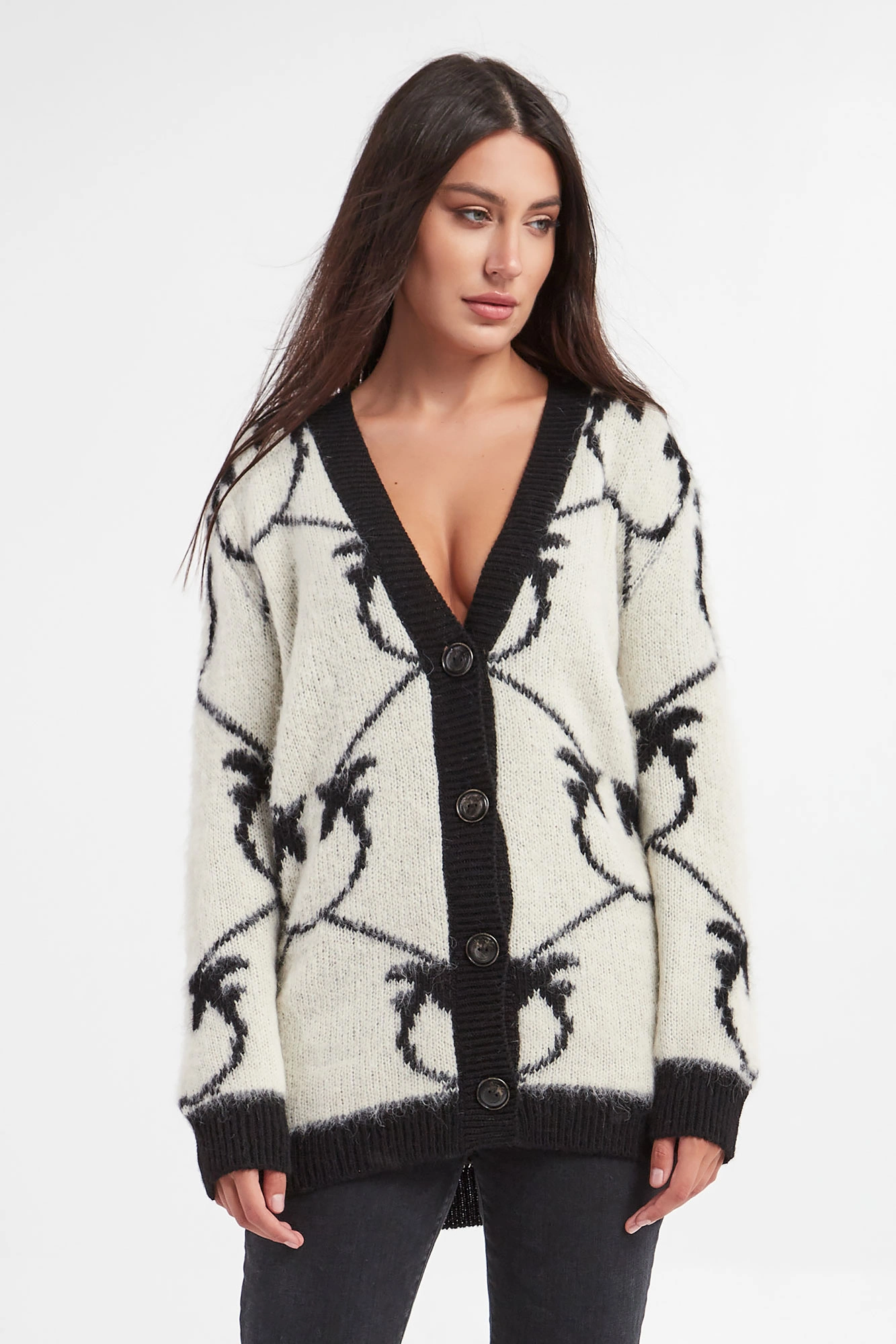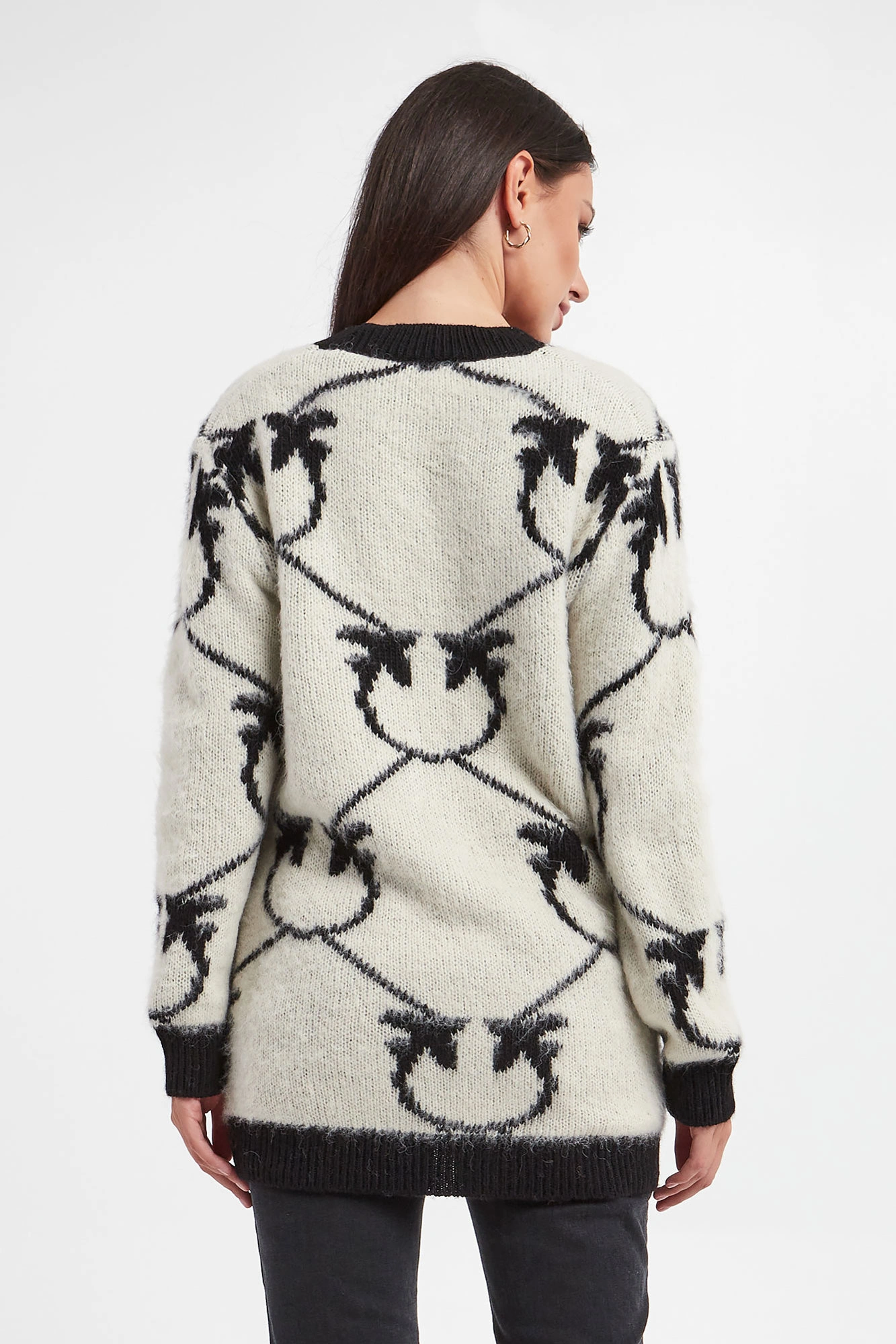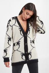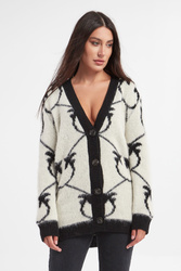 Kardigan marki Pinko w kolorze ecru. Zapinany na duże, sygnowane, czarne guziki. Na całości duży wzór w postaci logo marki w czarnym kolorze. Dekolt, dół i długie rękawy wykończone czarnym ściągaczem prążkowanym. Kardigan o przyjemnym w dotyku, włochatym wykończeniu. Fason typu relaxed.