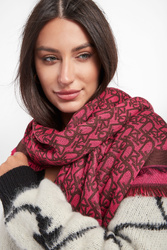 Wełniany szal marki Pinko, model Sarata. W brązowo-różowym kolorze. Na całości nadruk w postaci nazwy marki. Wykończone ozdobnym strzępieniem. Wykonany z mieszanki wełny i modalu.