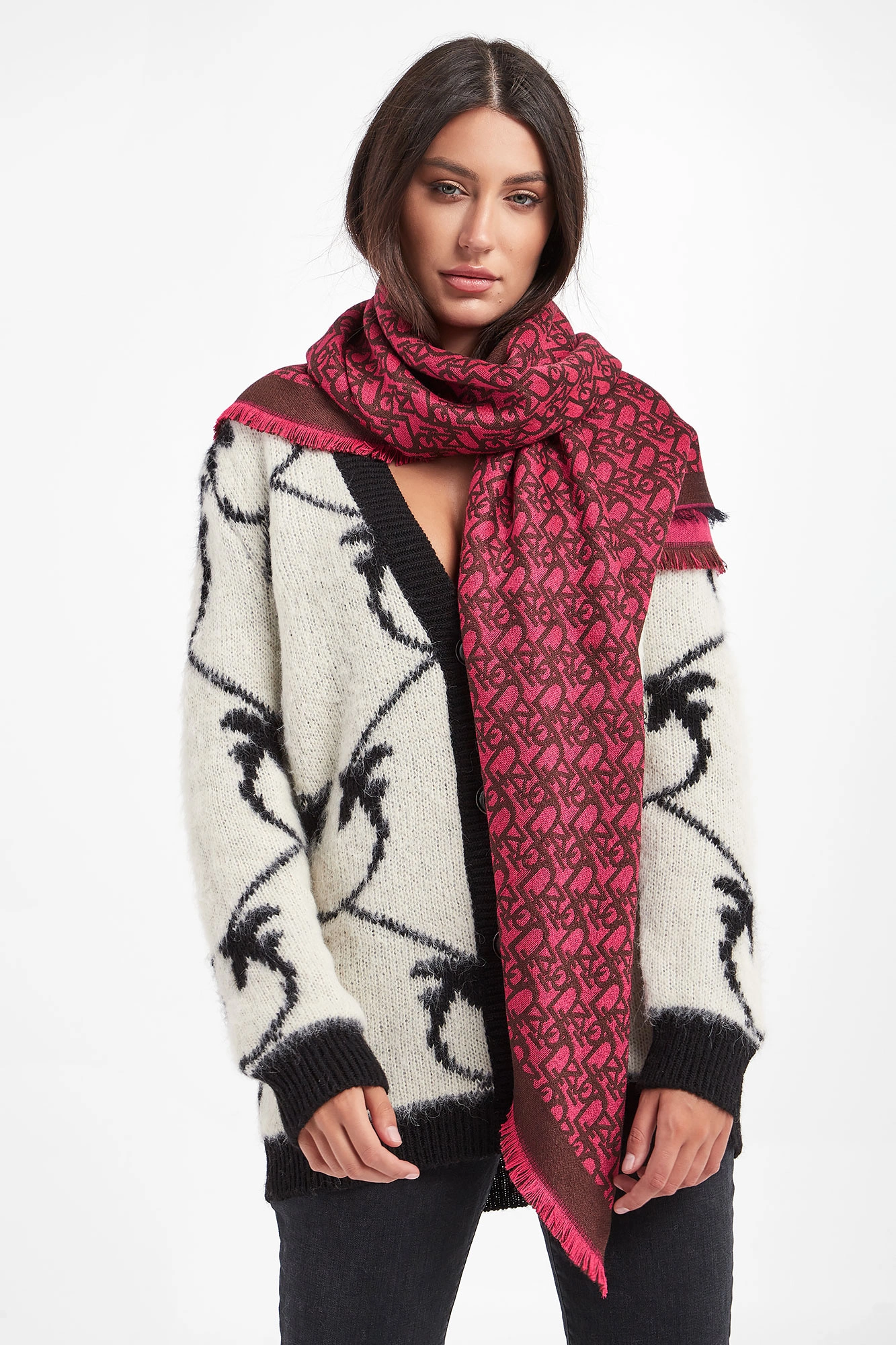 Wełniany szal marki Pinko, model Sarata. W brązowo-różowym kolorze. Na całości nadruk w postaci nazwy marki. Wykończone ozdobnym strzępieniem. Wykonany z mieszanki wełny i modalu.