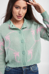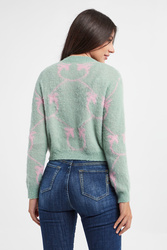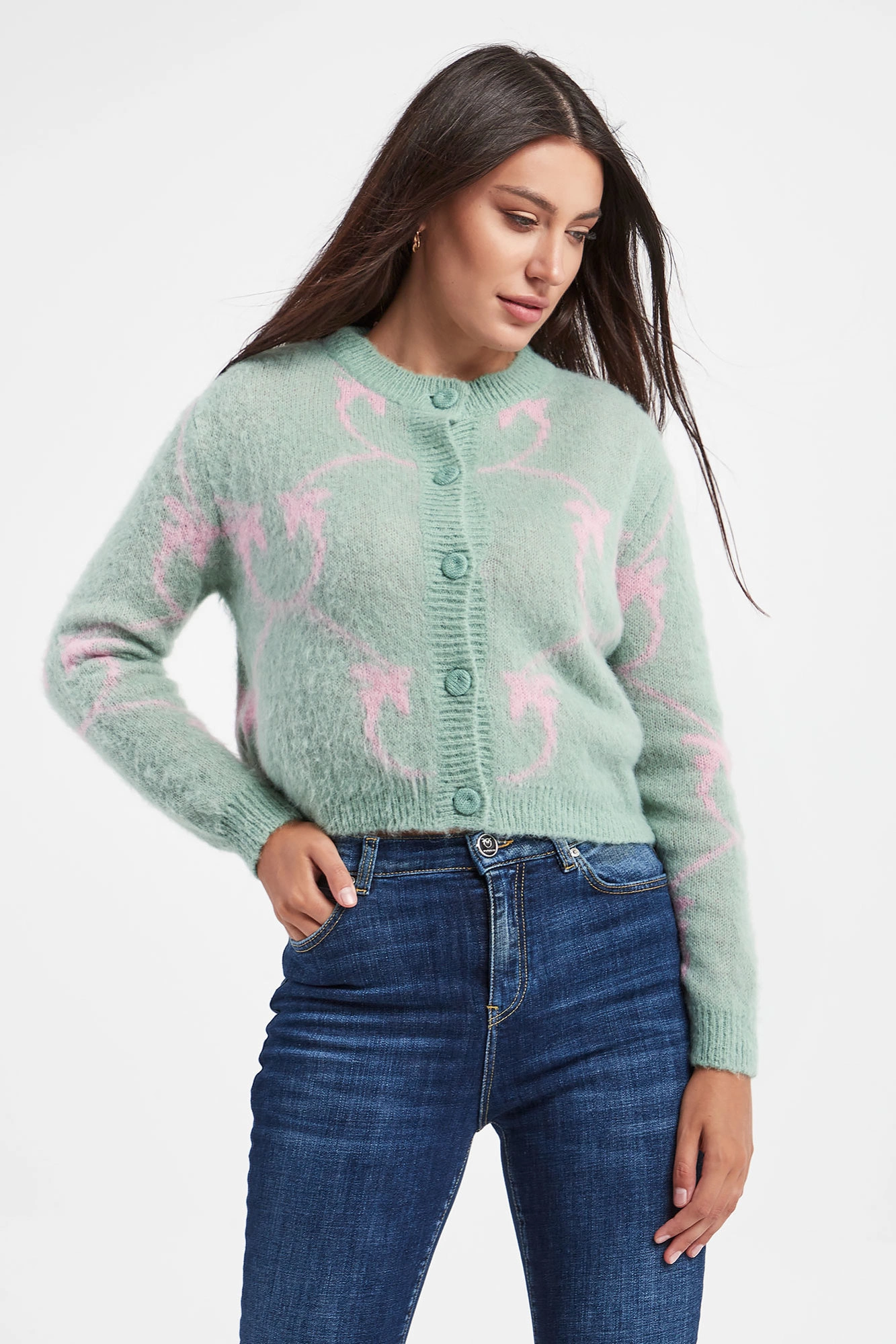 Kardigan marki pinko w miętowym kolorze. Zapinany na guziki. Na całości wzór w postaci logo marki w kontrastowym, różowym kolorze. Dekolt o-neck, długie rękawy i dół zakończone ściągaczem prążkowanym. Sweter o przyjemnym w dotyku, włochatym wykończeniu. Nieco krótszy fason regular fit.