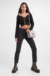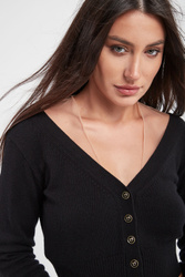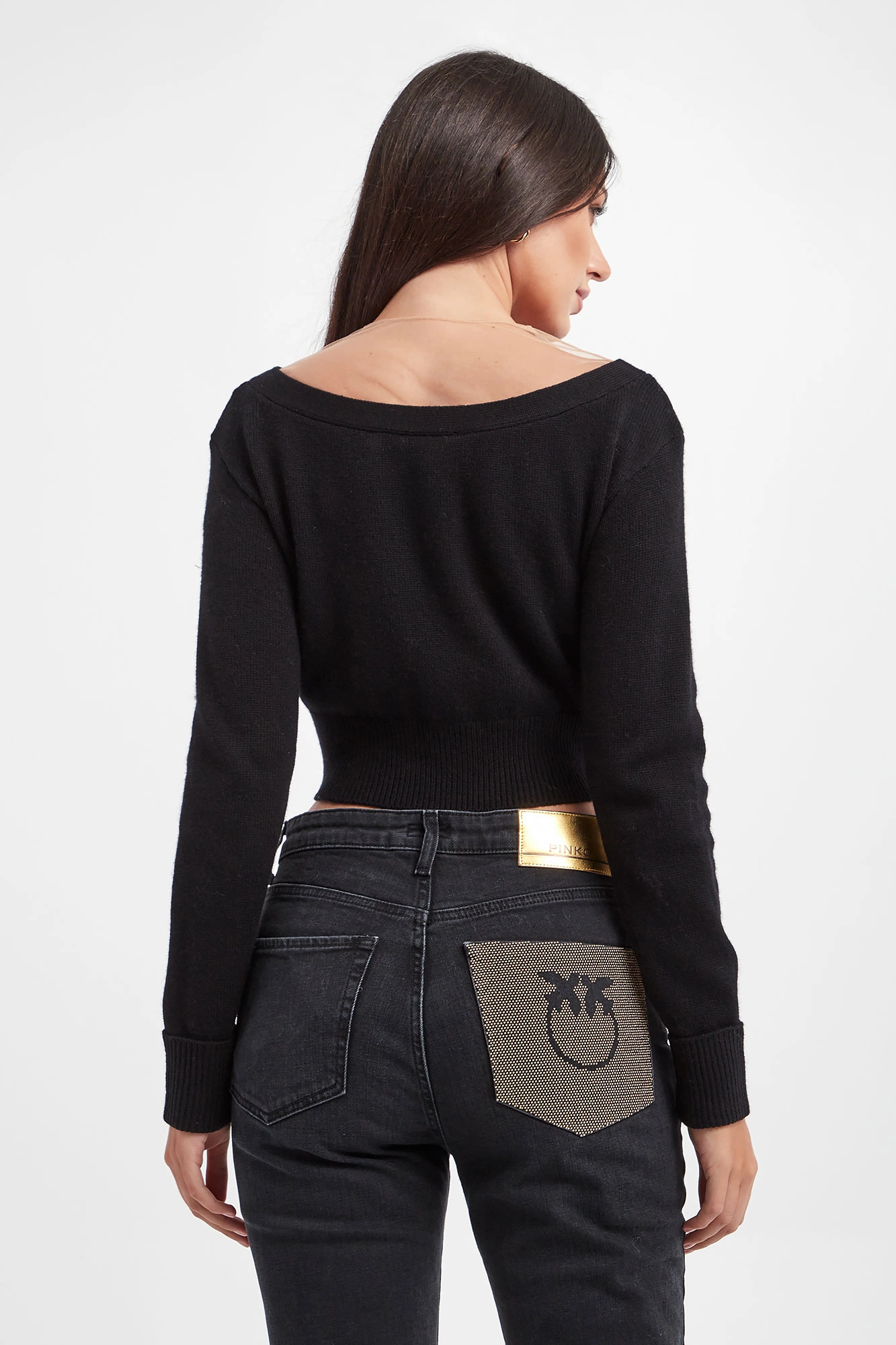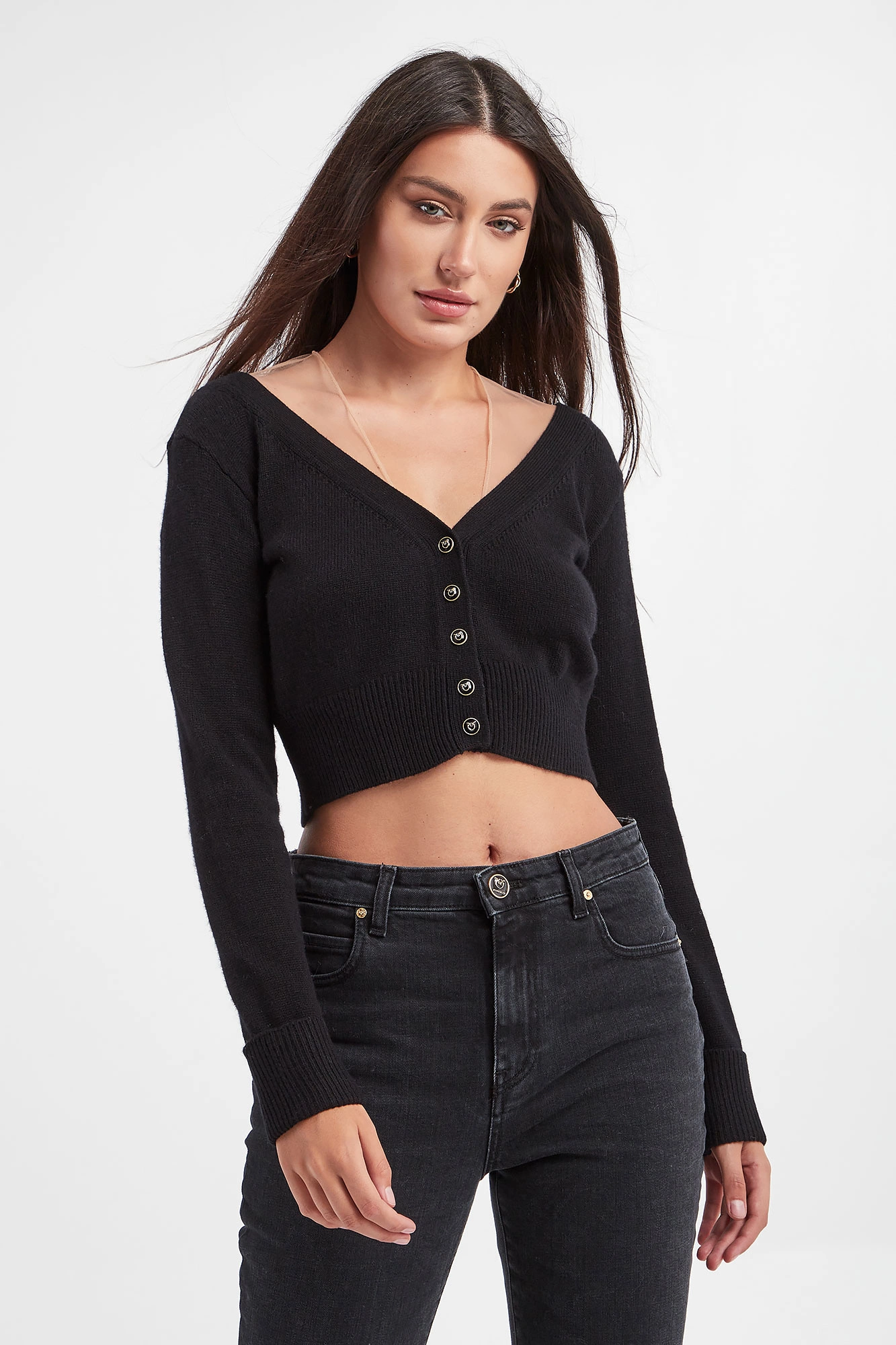 Kardigan marki Pinko w czarnym kolorze. Zapinany na czarno-złote zatrzaski sygnowane logo marki. Przy dekolcie beżowa drobna siateczka. Dekolt typu v-neck. Długie rękawy i dół wykończone ściągaczem prążkowanym. fason typu cropped.