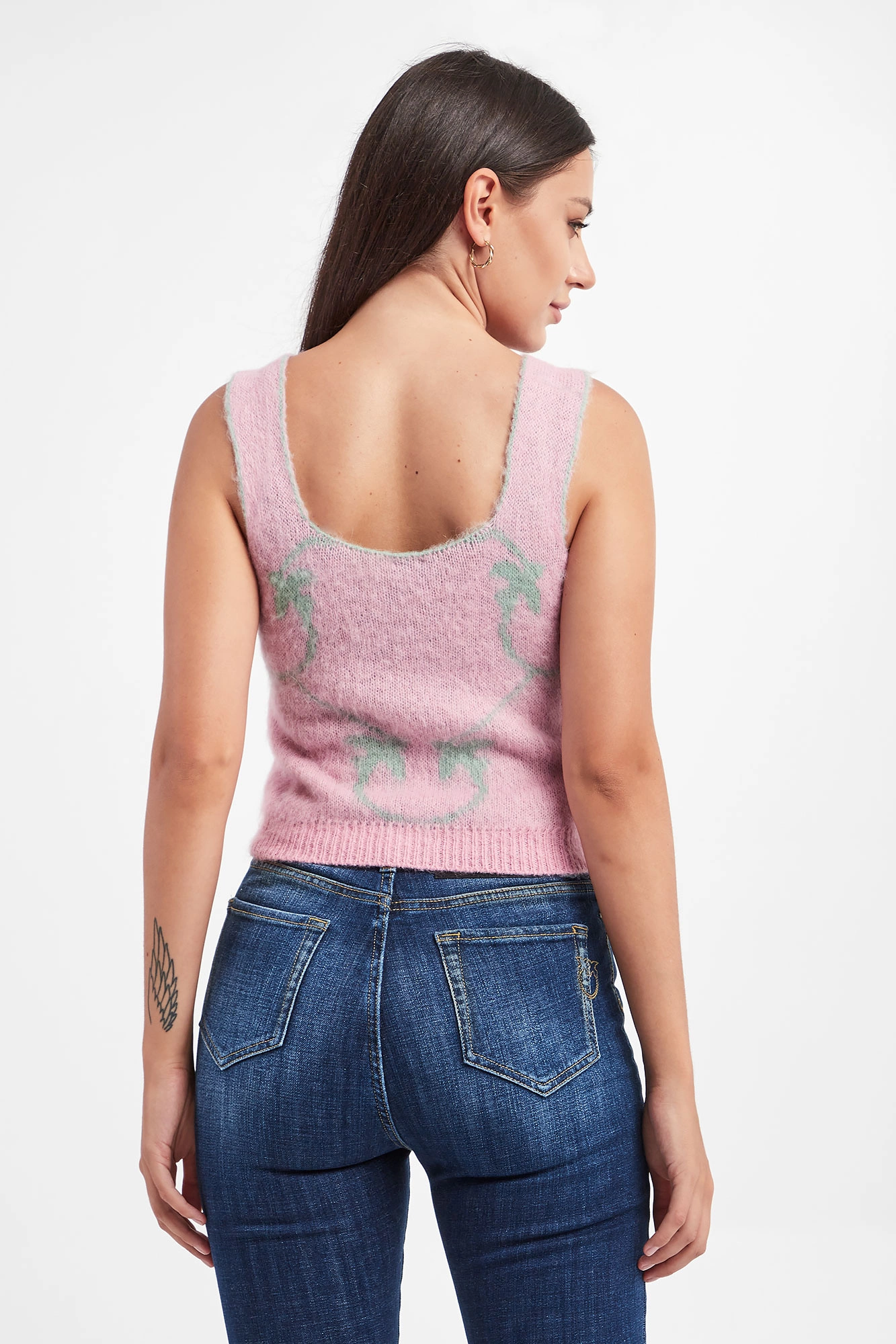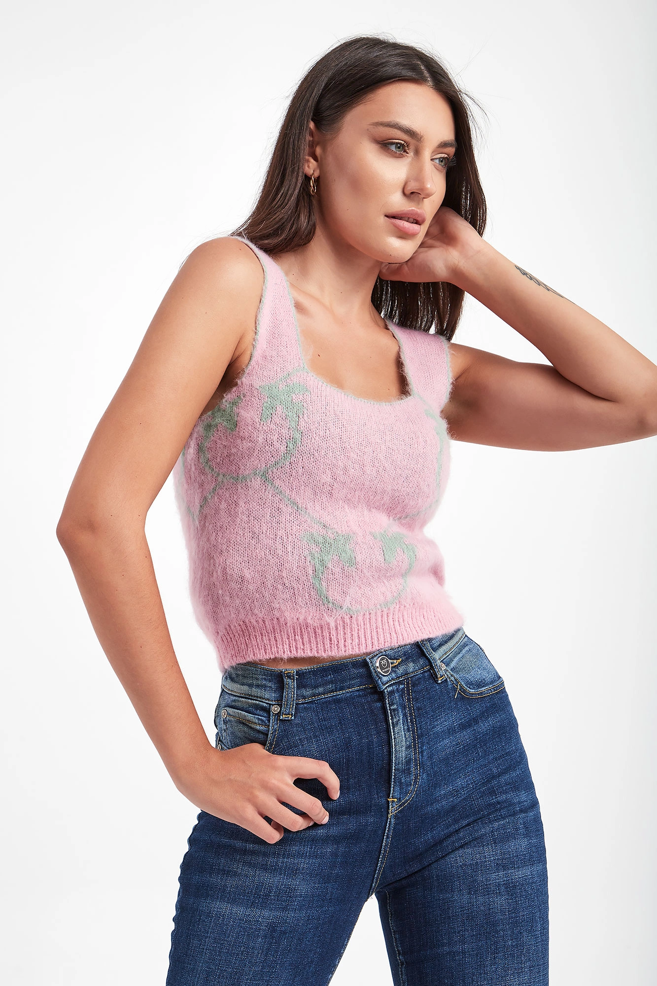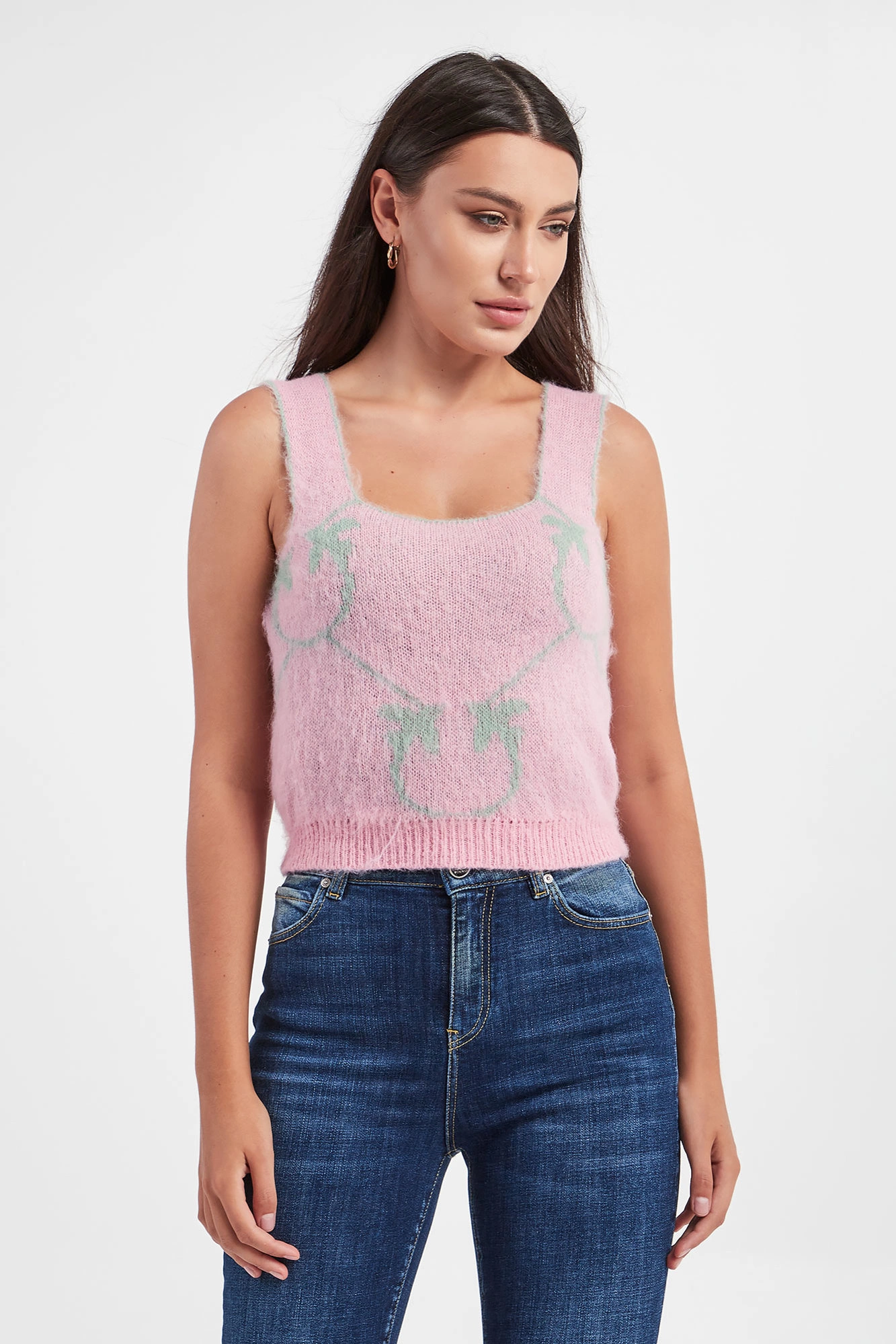 Dzianinowy top marki Pinko w różowym kolorze. Na całości wzór w postaci logo marki w kontrastowym kolorze. Dół wykończony ściągaczem prążkowanym. Top przyjemny w dotyku o włochatym wykończeniu. Fason typu regular fit.