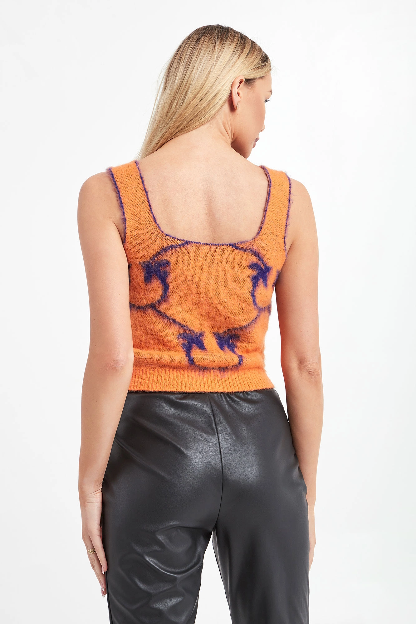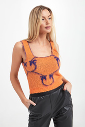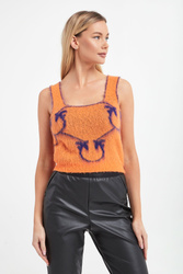 Dzianinowy top marki Pinko w pomarańczowym kolorze. Na całości wzór w postaci logo marki w kontrastowym, fioletowym kolorze. Dół wykończony ściągaczem prążkowanym. Top przyjemny w dotyku o włochatym wykończeniu. Fason typu regular.