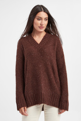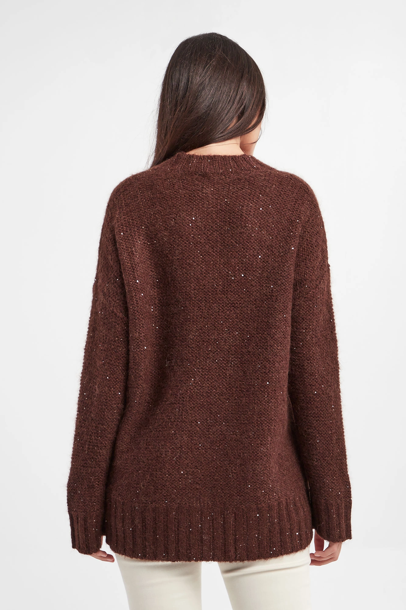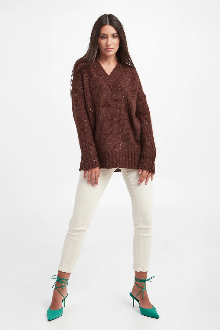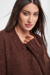 Sweter marki Marella Monochrome w brązowym kolorze. Na całości widoczny splot przeplata się z nieregularnie rozmieszczonymi cekinami. Dekolt w kształt litery V. Rękawy, dół i dekolt zakończone ściągaczem prążkowanym. W skład wchodzą niezwykle ciepłe włókna moheru i alpaki. Fason relaxed.