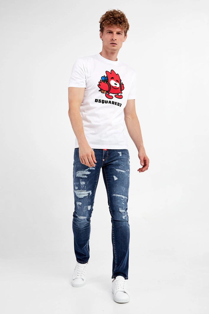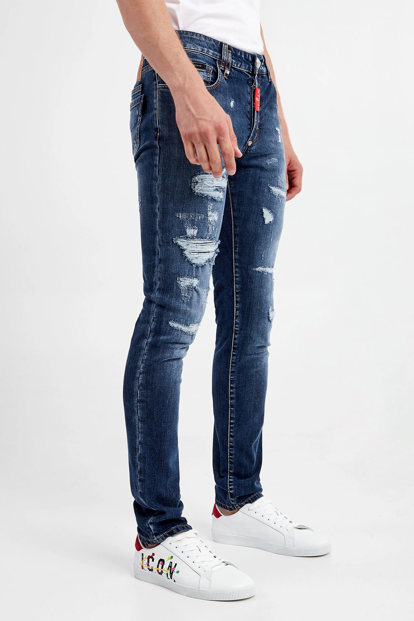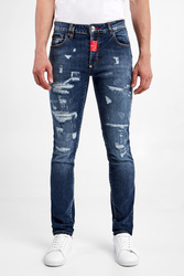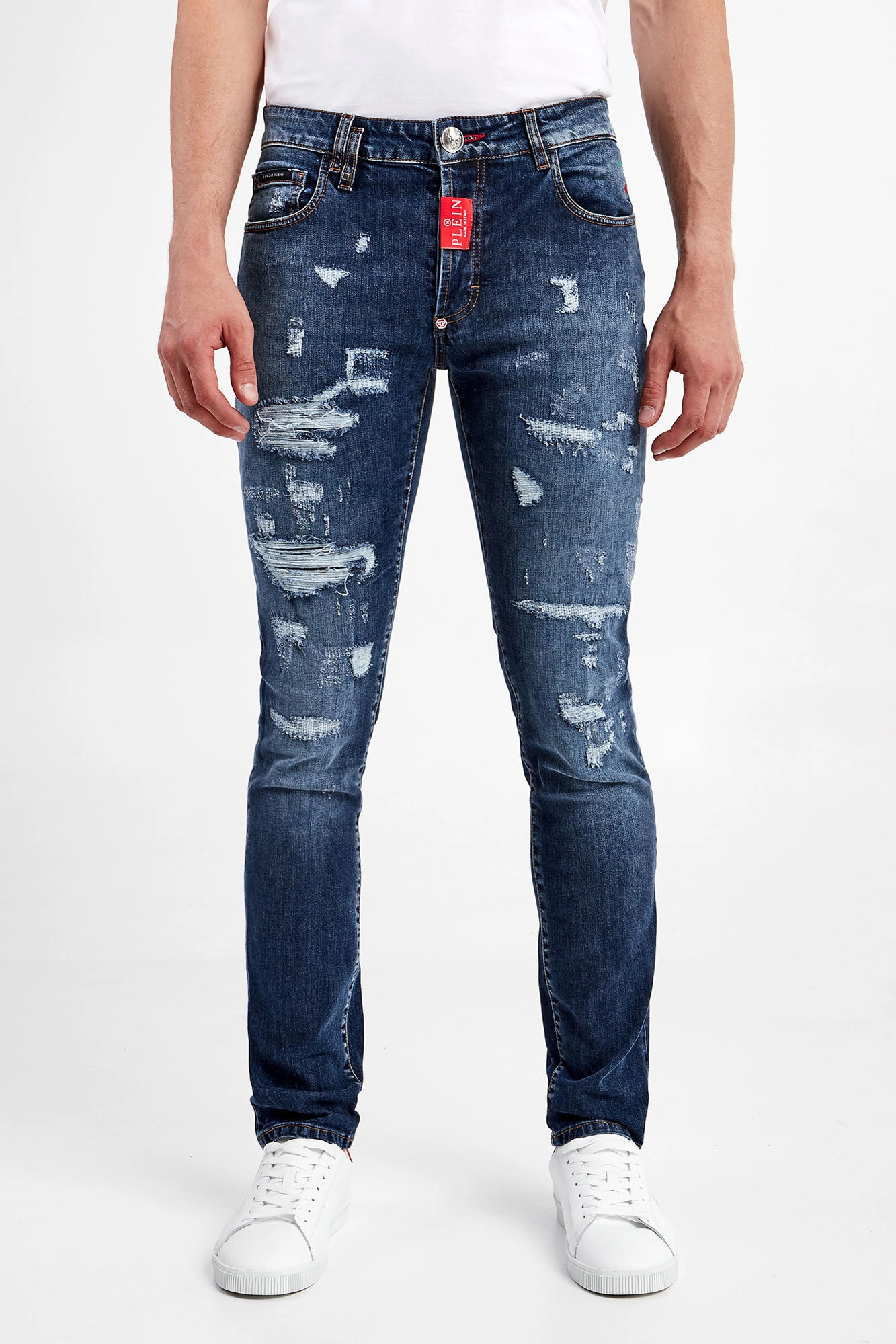 Jeansy marki Philipp Plein w granatowym kolorze. Zapinane sygnowanych, srebrnych guzików. Na całości przetarcia oraz dziury. Model z sześcioma kieszeniami. Z przodu na klapie kryjącej zapięcie czerwona naszywka z nazwą marki w białym kolorze. Z tyłu, przy prawej kieszeni naszywka w postaci nazwy marki oraz sygnowana naszywka w kolorze brązowo-czerwonym. W pasie szlufki. Z przodu przy szlufce ozdobny dżet srebrny. Wykonane z bawełnianej tkaniny z domieszką elastycznych włókien. Fason super straight cut.