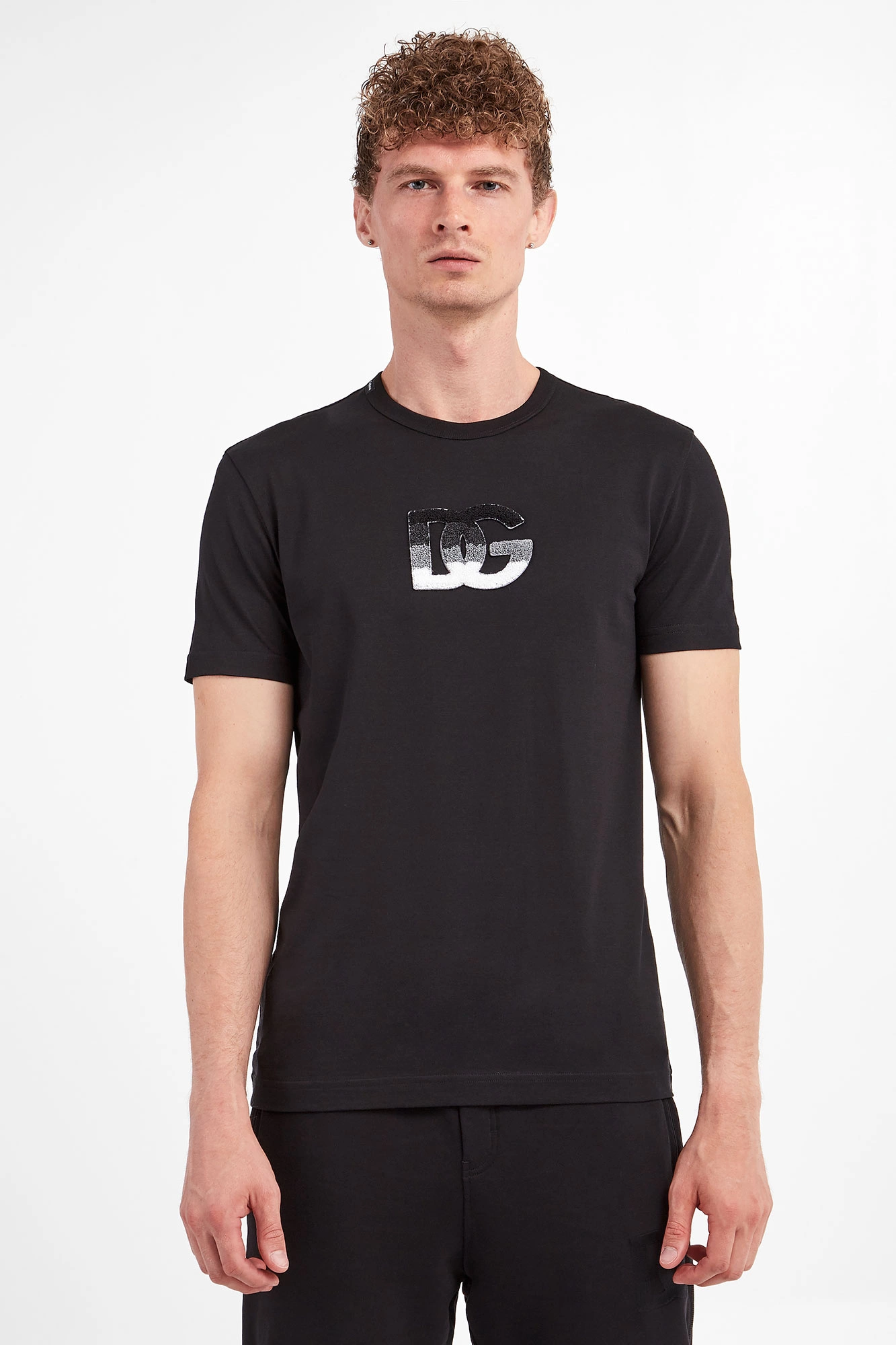 T-shirt marki Dolce & Gabbana w czarnym kolorze. Z przodu naszywka z monogramem marki. Krótkie rękawy wykończone przeszyciem. Okrągły dekolt typu o-neck wykończony elastycznym ściągaczem. Fason typu regular fit. Wykona ze stuprocentowej bawełny.