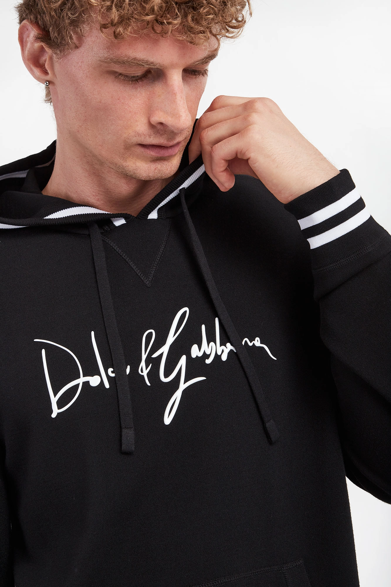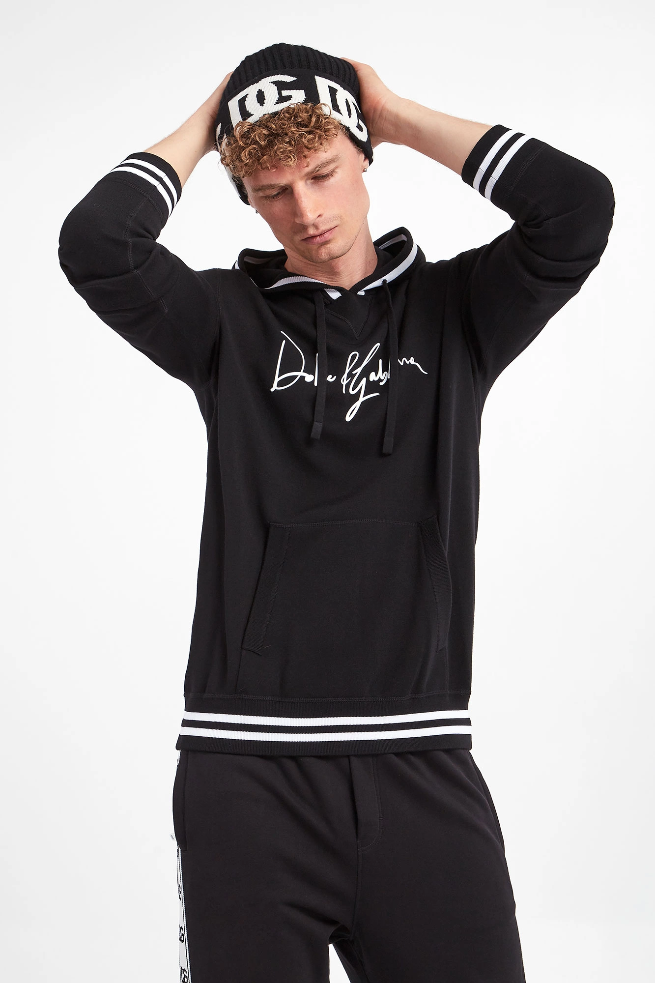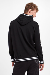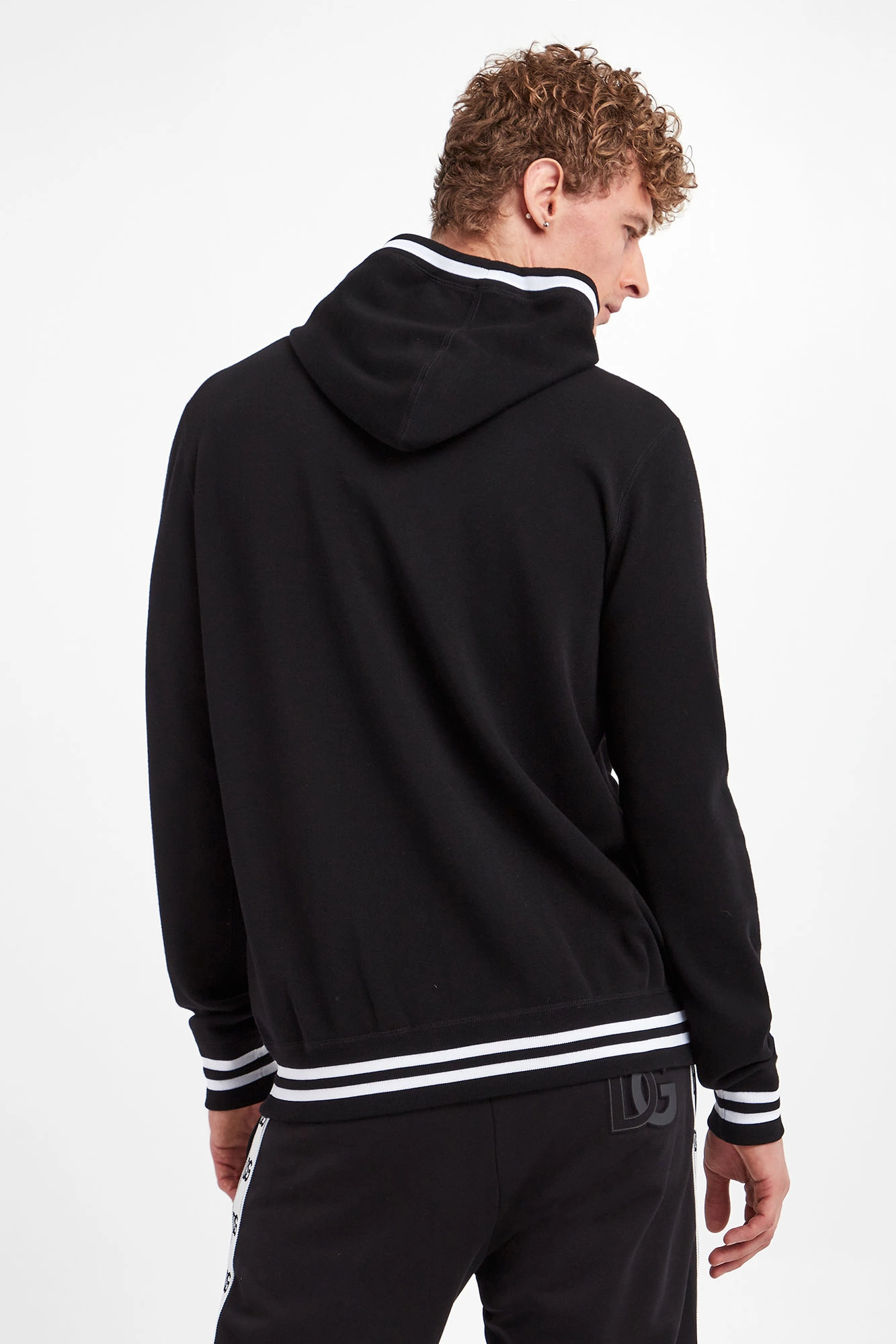 Wełniana bluza z kapturem marki Dolce & Gabbana w czarnym kolorze. Długie rękawy i dół zakończone ściągaczami. Z przodu kieszeń typu kangurek. Kaptur regulowany za pomocą troczków. Fason regular fit. Z przodu nadruk z nazwą marki w kontrastowym, białym kolorze. Kaptur, rękawy i dół zakończone białym lampasem.