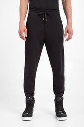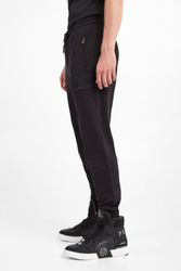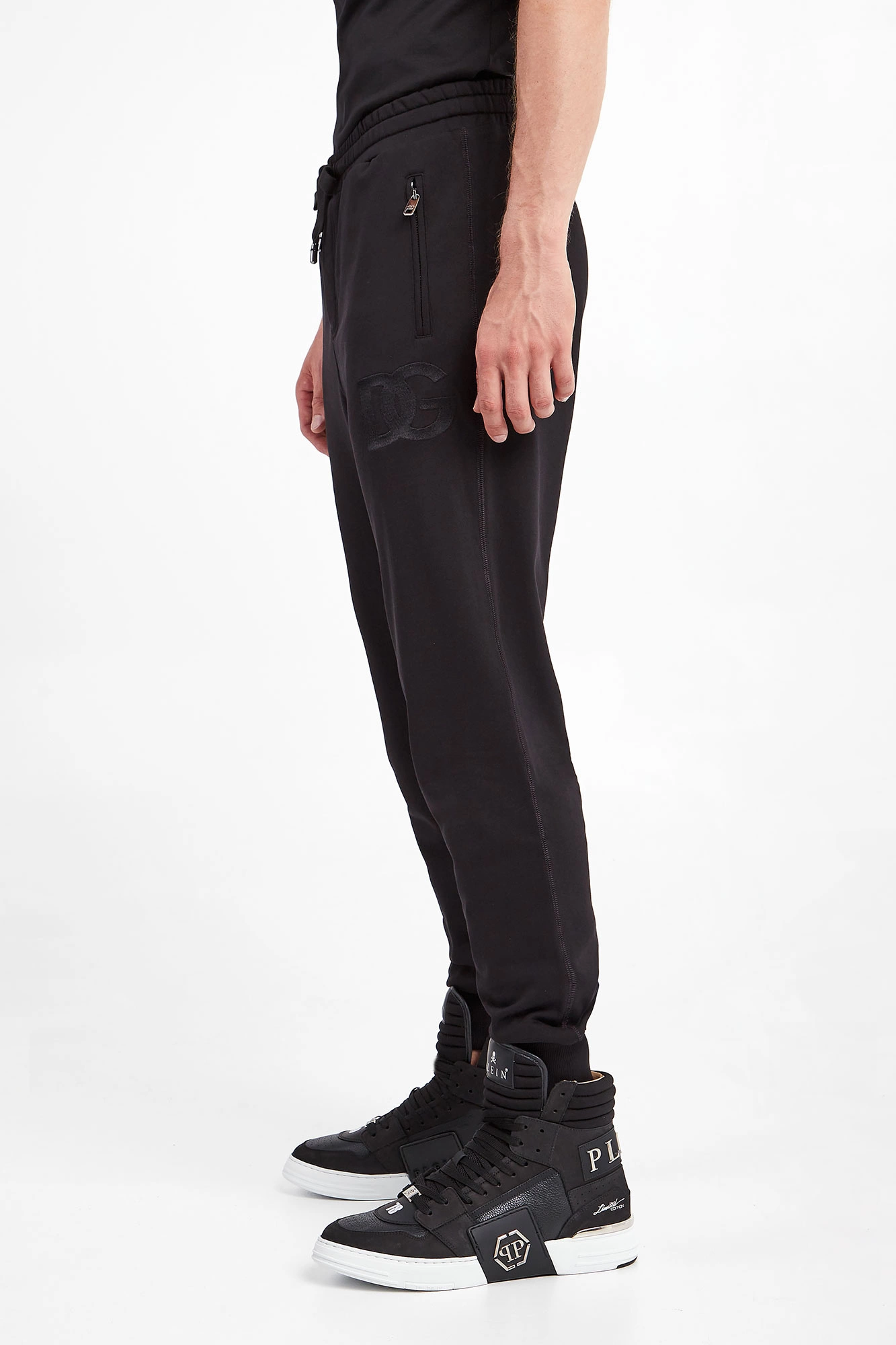 Spodnie dresowe marki Dolce & Gabbana w czarnym kolorze. W pasie elastyczny ściągacz regulowany dodatkowo za pomocą troczków zakończonych grafitowymi stoperami. Model z trzema kieszeniami. Dwie z przodu po bokach oraz jedna z tyłu zapinane na grafitowy zamek z sygnowanymi zawieszkami. Na lewej nogawce czarny haft w postaci logo marki. Nogawki wykończone ściągaczem prążkowanym. Fason typu jogger.