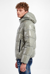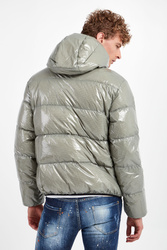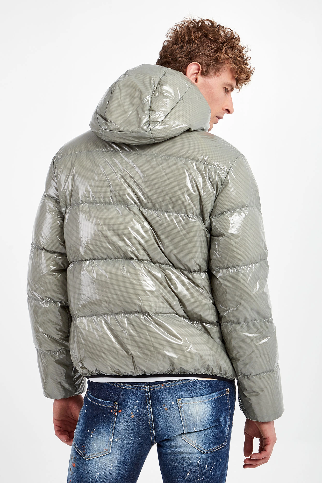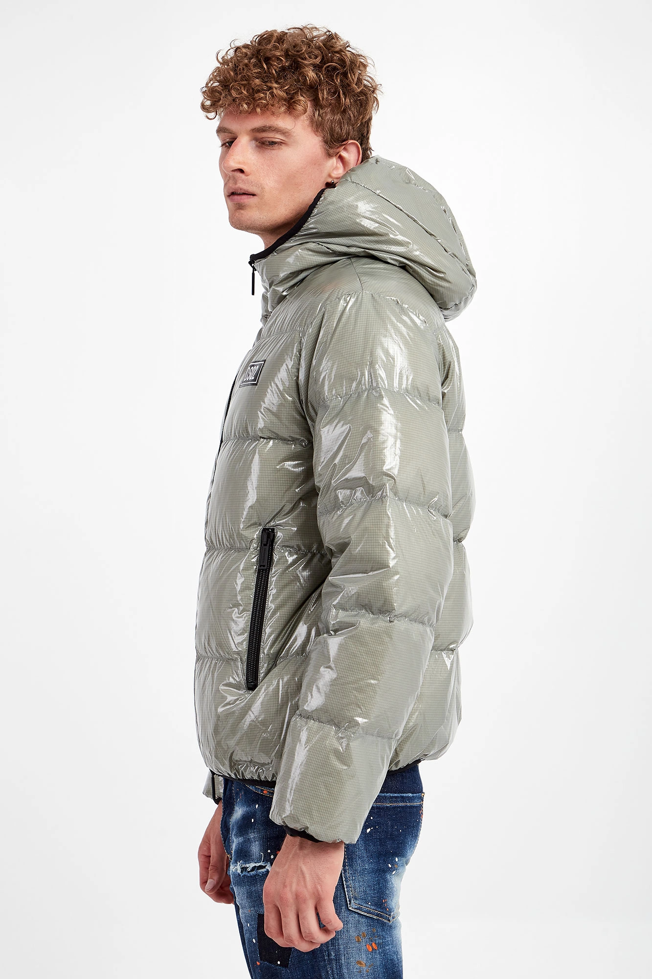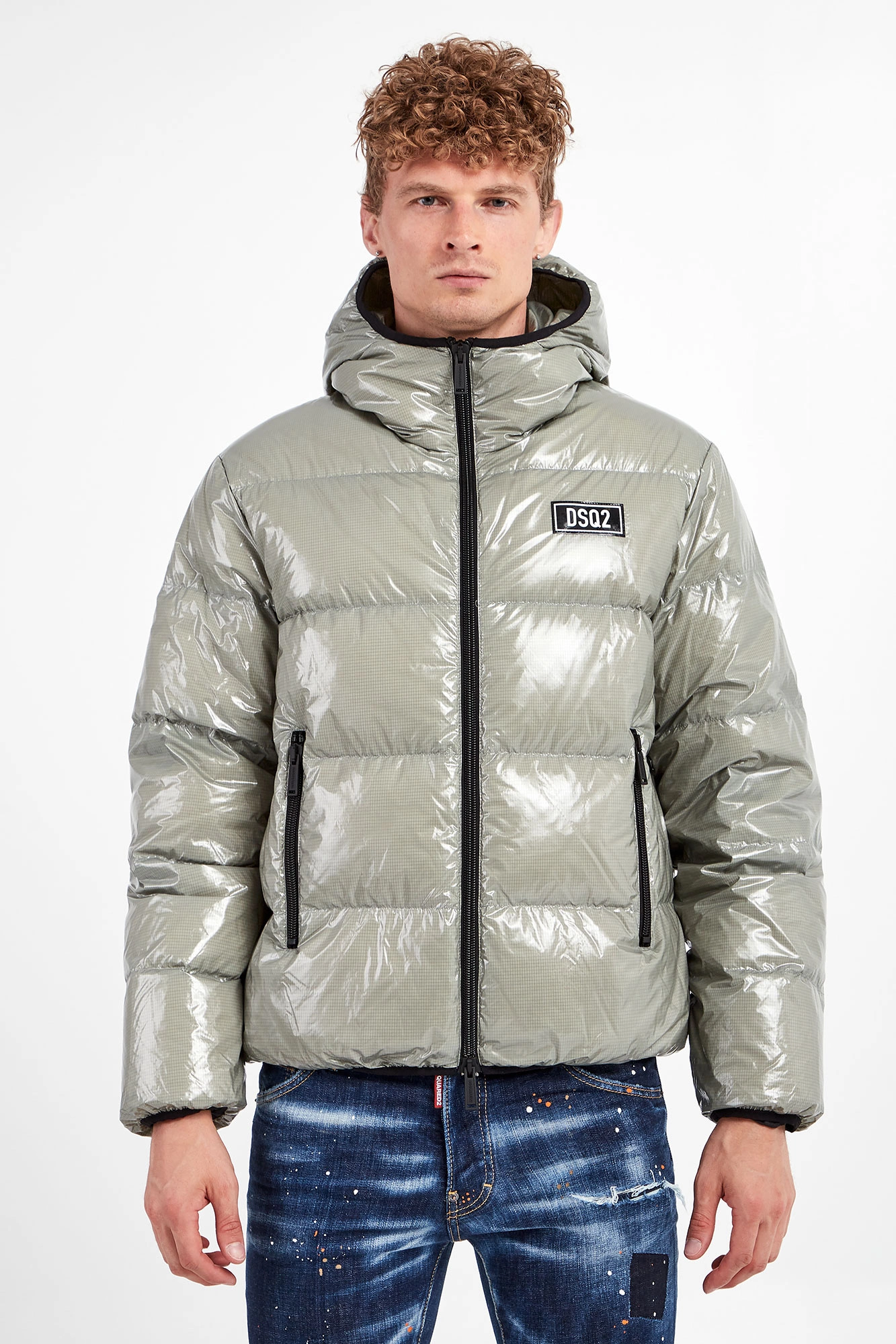Puchowa kurtka z kapturem marki Dsquared2 w jasnoszarym kolorze. Zapinana na podwójny zamek z sygnowaniem. Na całości poziome pikowania i wzór w postaci drobnej kratki. Model z dwiema kieszeniami na froncie i jedną wewnętrzną. Na piersi naszywka z logo marki. Rękawy i dół wykończone wąskim ściągaczem. Fason typu relaxed fit.