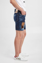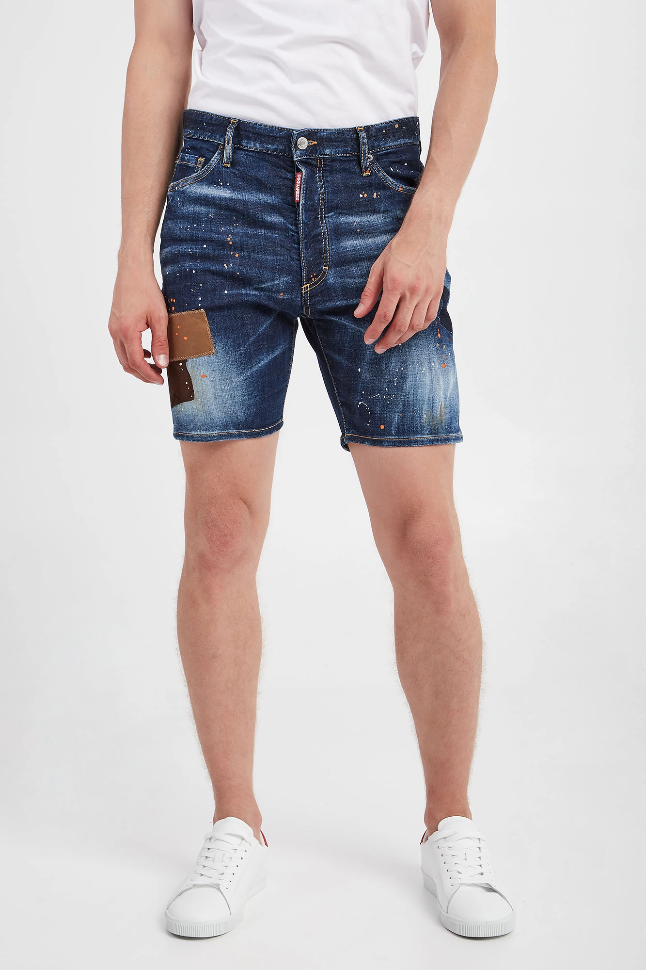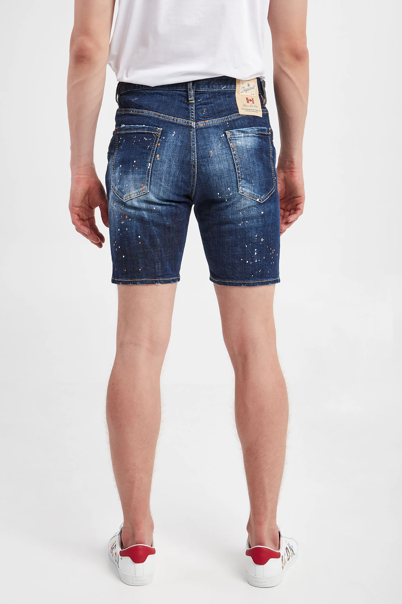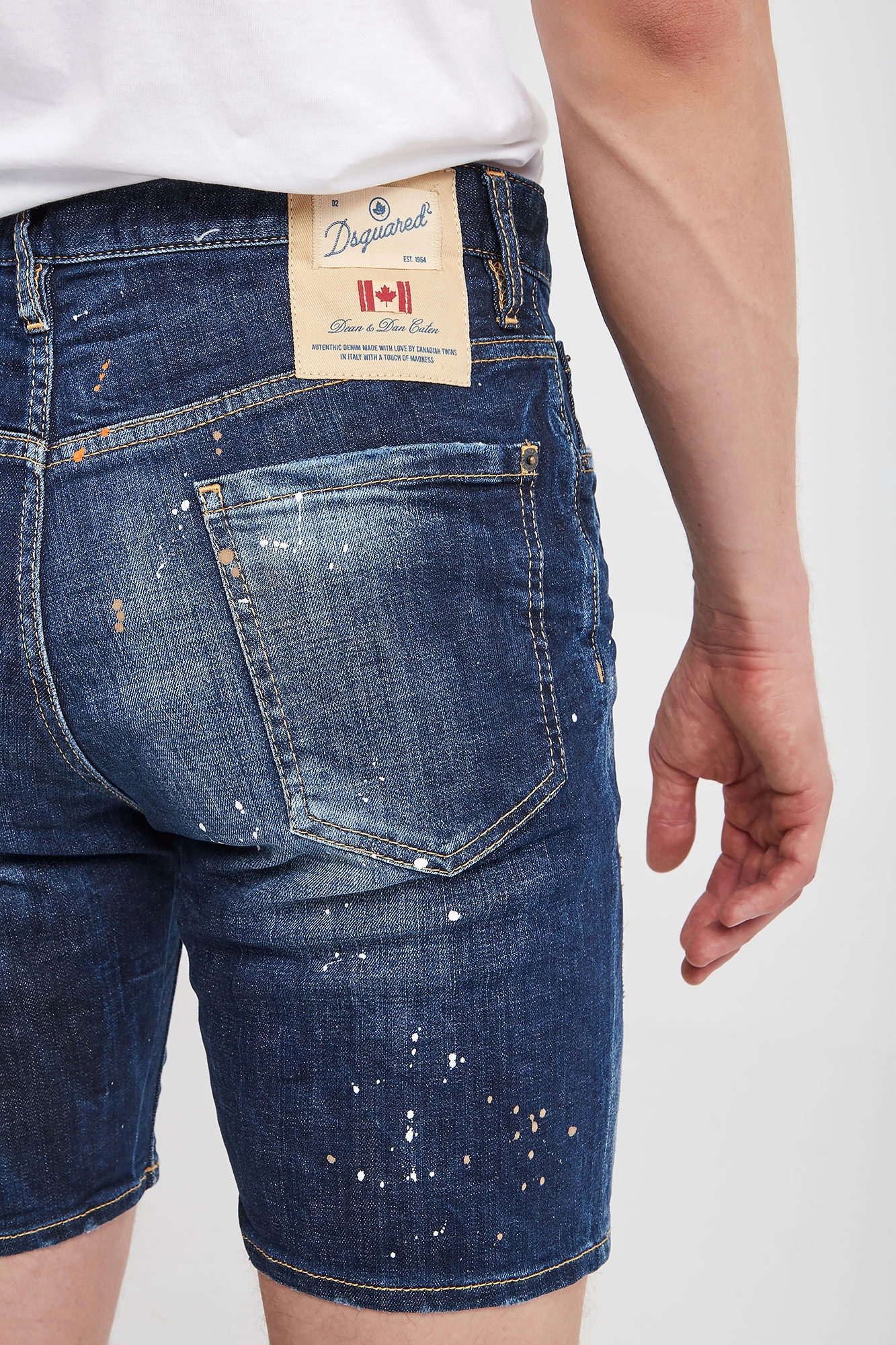 Spodenki jeansowe marki Dsquared2 granatowym kolorze. Autorski fason marine short typu slim. Model z pięcioma kieszeniami. Na całości ozdobny efekt plam farby. Z przodu naszywki w brązowym kolorze. W pasie szlufki. Zapinane za pomocą sygnowanych guzików krytych tasiemką. Na całości przetarcia. Z tyłu naszywka w bezowym kolorze z logo i nazwą marki.