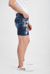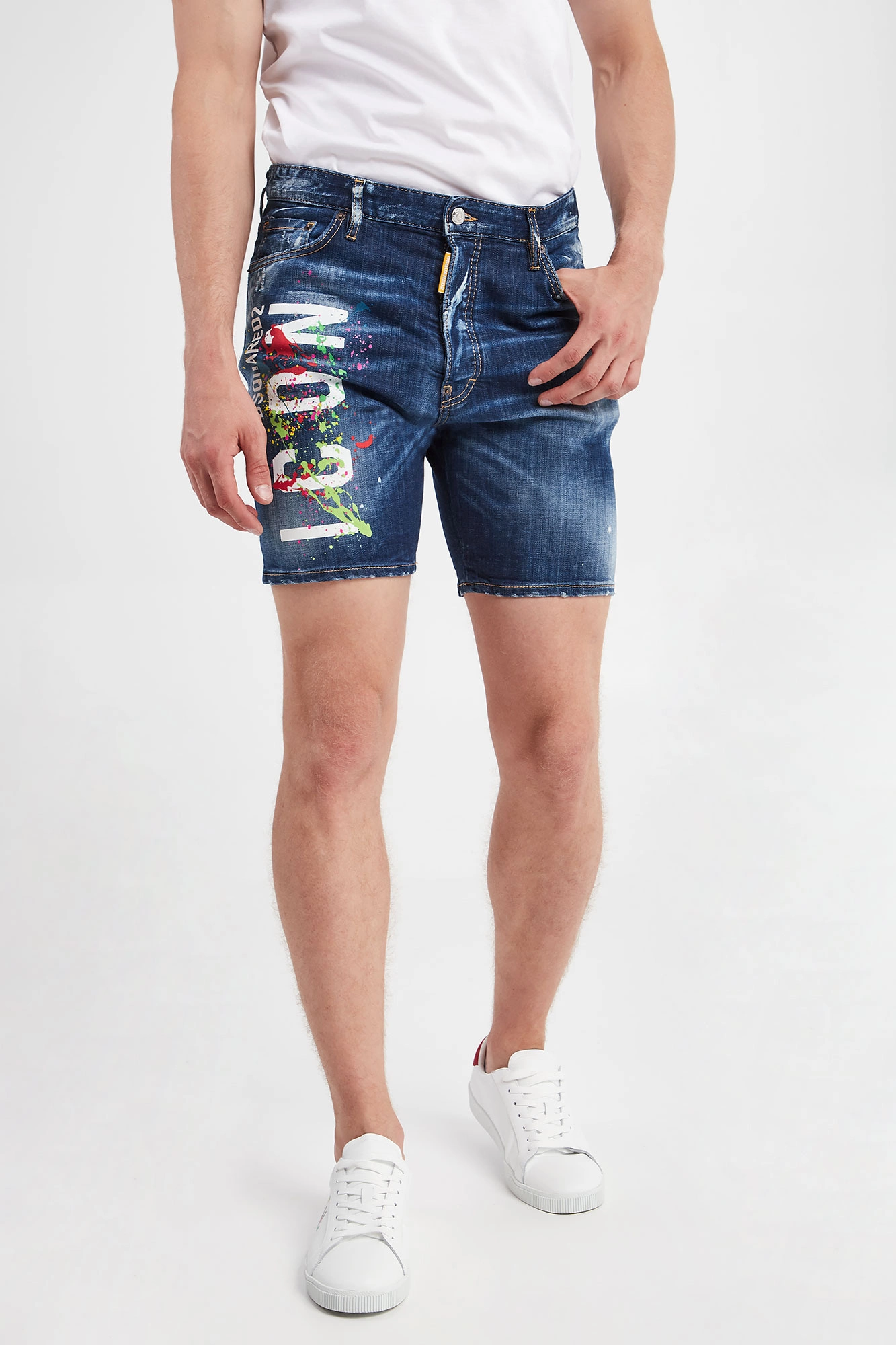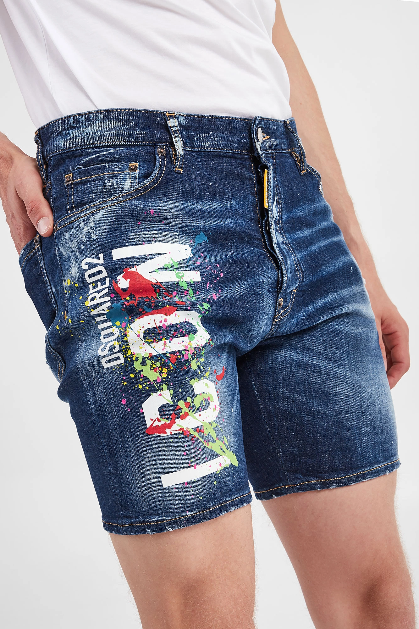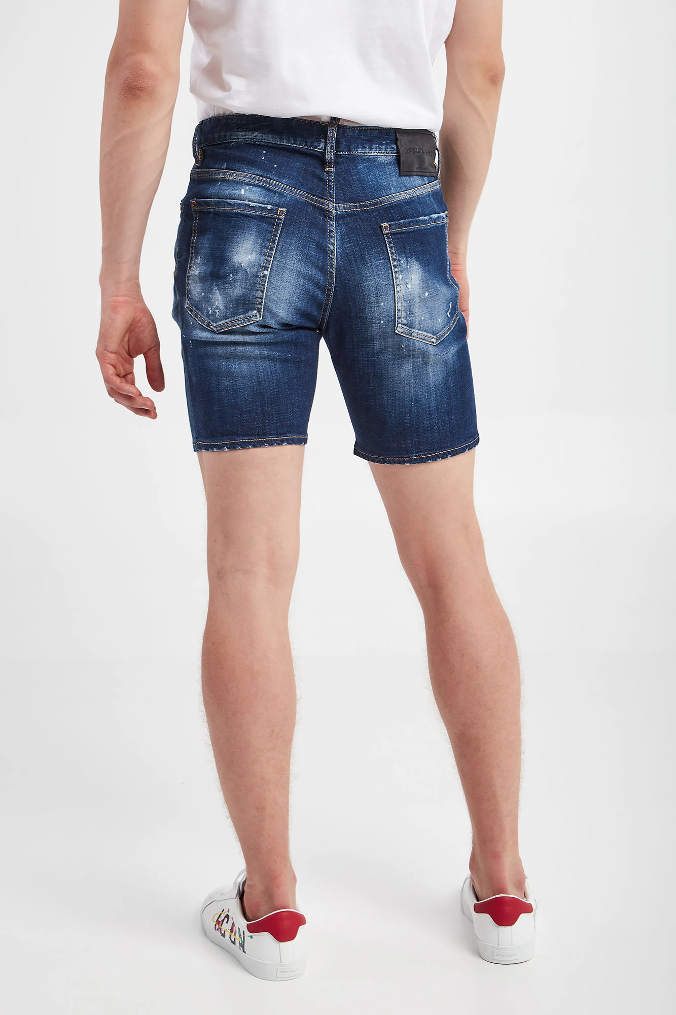 Spodenki jeansowe marki Dsquared2 granatowym kolorze. Autorski fason marine short typu slim. Model z pięcioma kieszeniami. Na całości ozdobne przetarcia i rozdarcia. Z przodu nadruk kolorowy nadruk z nazwą marki. W pasie szlufki. Zapinane za pomocą sygnowanych guzików krytych tasiemką. Na całości przetarcia. Z tyłu naszywka w czarnym kolorze z logo i nazwą marki.