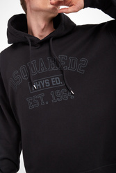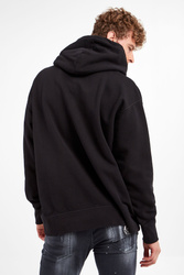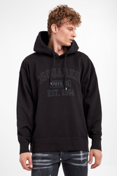 Dzianinowa bluza marki Dsquared2 w czarnym kolorze. Z kapturem regulowanym za pomocą troczków. Z przodu nadruk nazwy marki w szarym kolorze. Fason typu oversize. Długie rękawy i dół wykończone elastycznym ściągaczem. Wykonana z czystej bawełny.