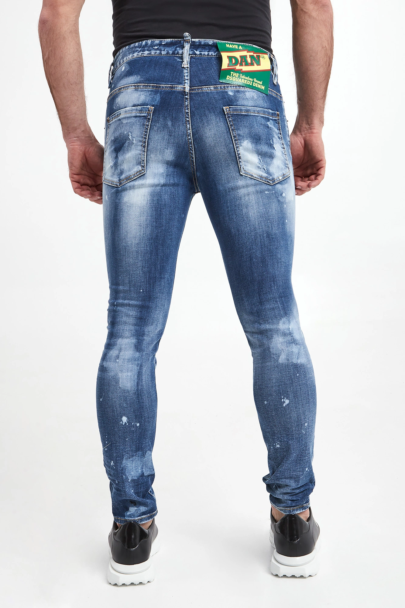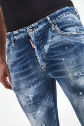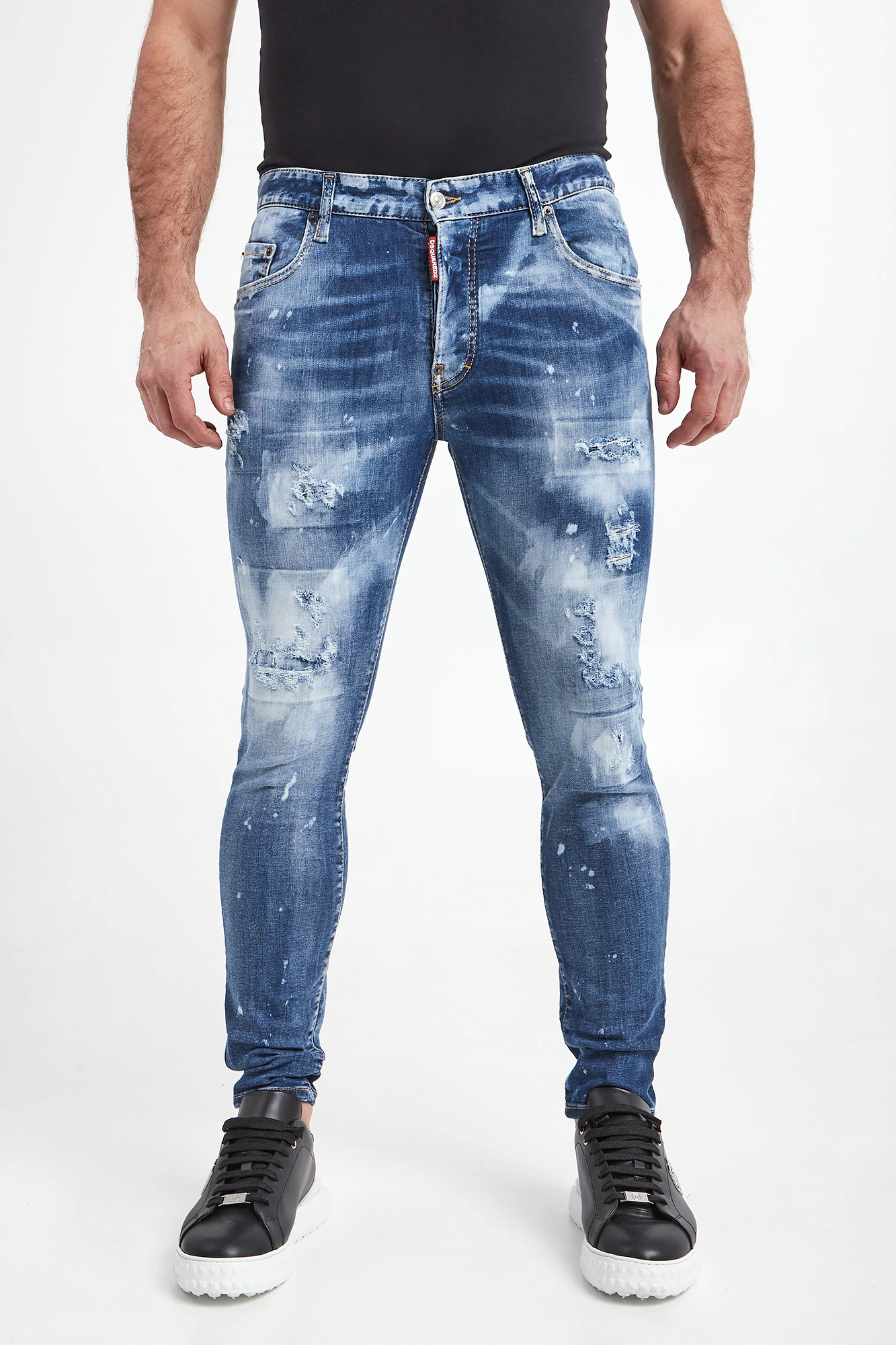 Jeansy marki Dsquared2 w niebieskim kolorze. Dopasowany, autorski fason typu super twinnky jean. Na całości ozdobne rozdarcia, przetarcia i nadruk z efektem plamy z farby. W pasie szlufki. Zapinane za pomocą sygnowanych guzików krytych tasiemką. Z tyłu kolorowa naszywka z logo i nazwą marki.
