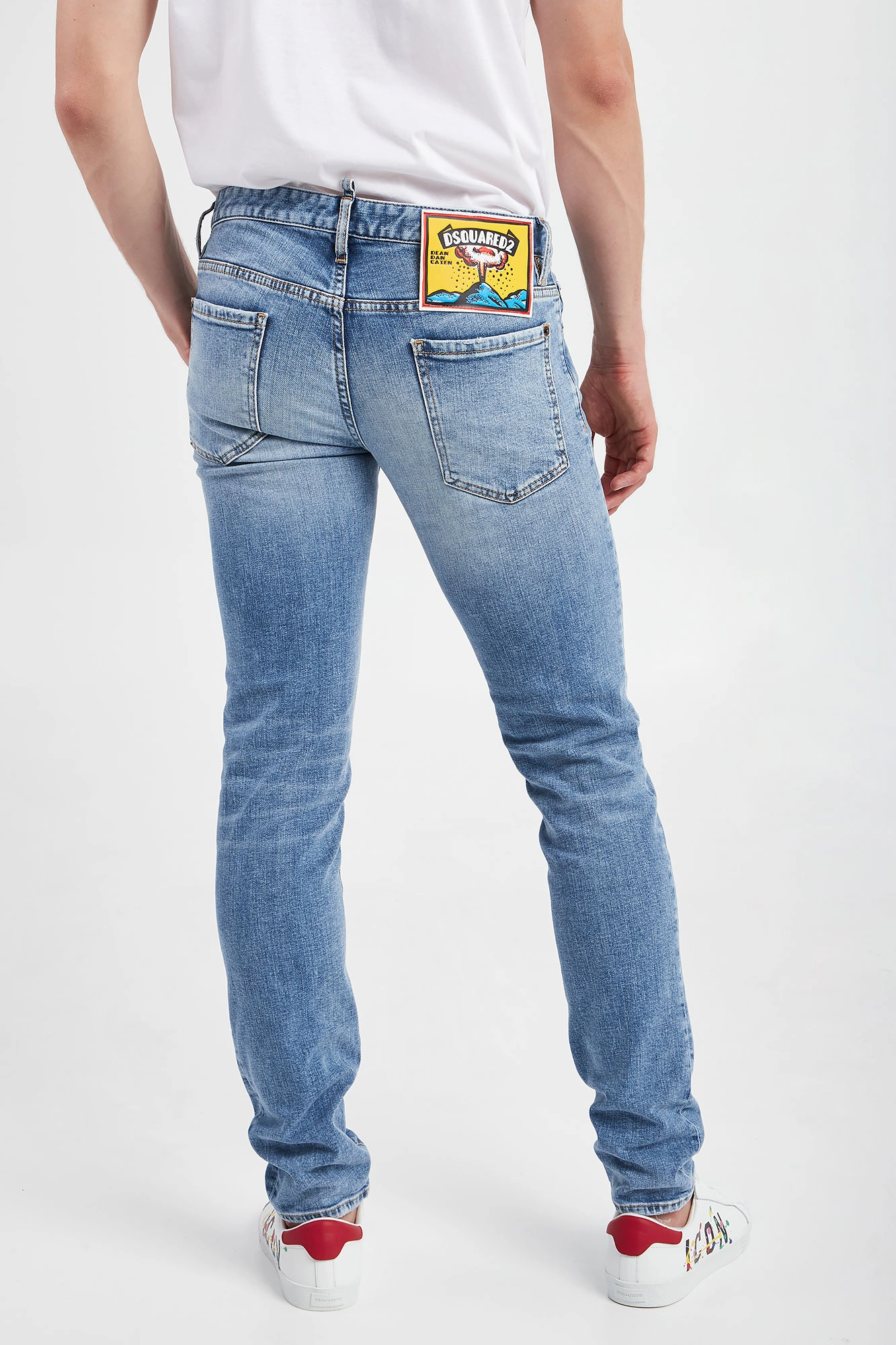 Jeansy marki Dsquared2 w jasnoniebieskim kolorze. Zapinane na trzy sygnowane guziki. Na całości przetarcia. Model z pięcioma kieszeniami. W pasie szlufki. Z tyłu kolorowa aplikacja z logo marki pełniąca rolę szlufki. Fason slim jean.