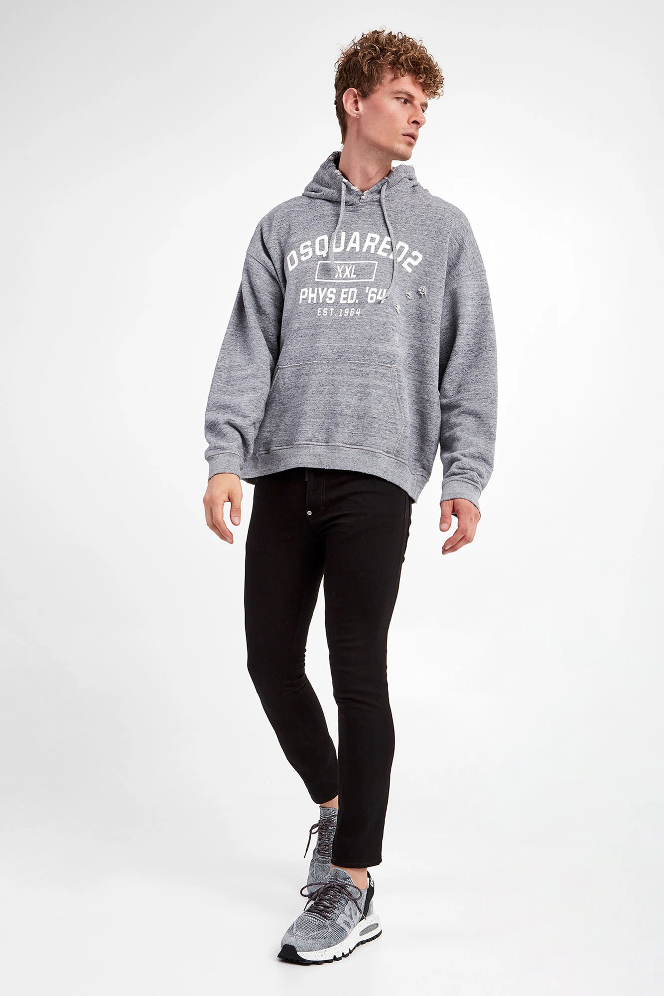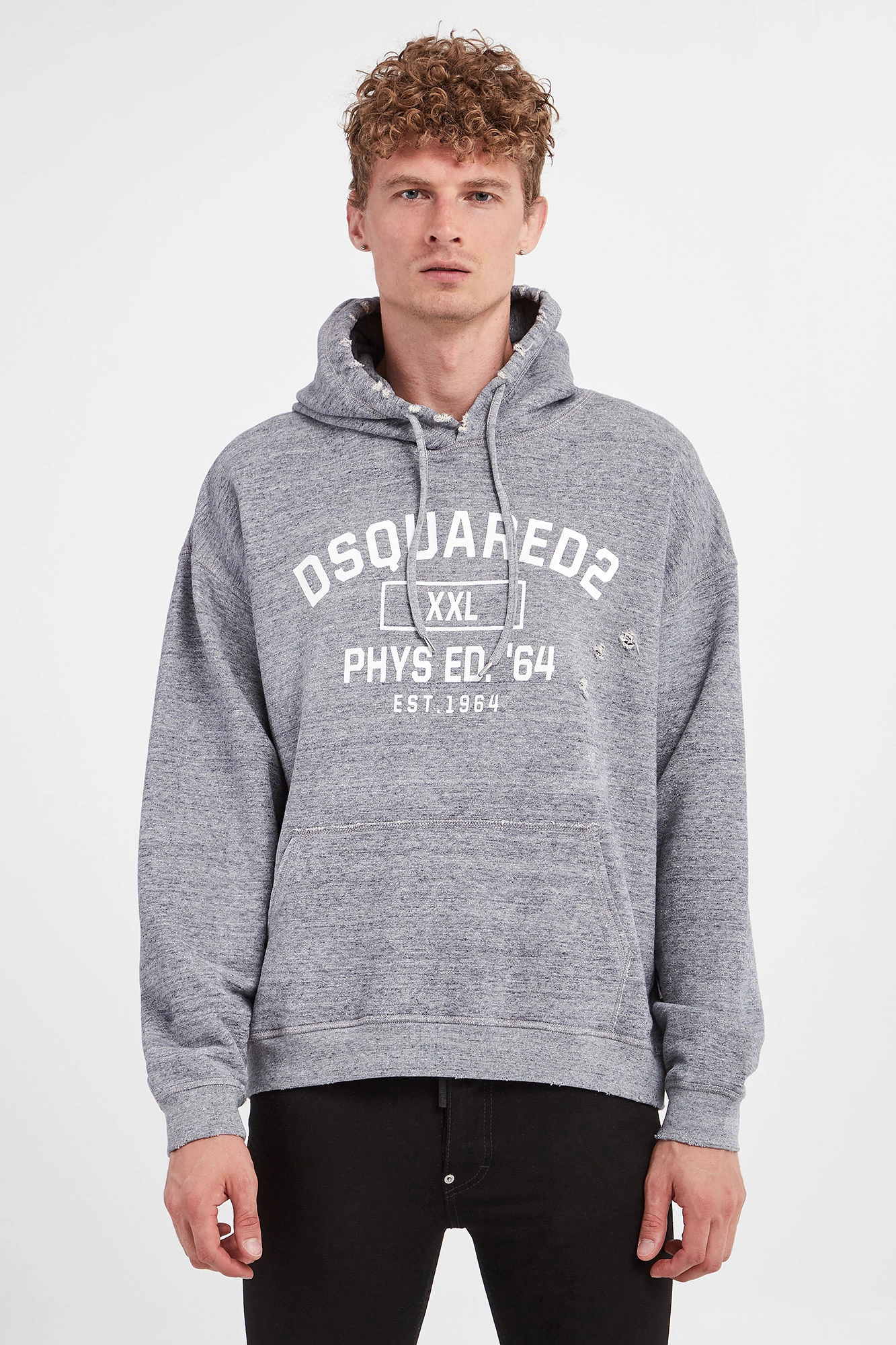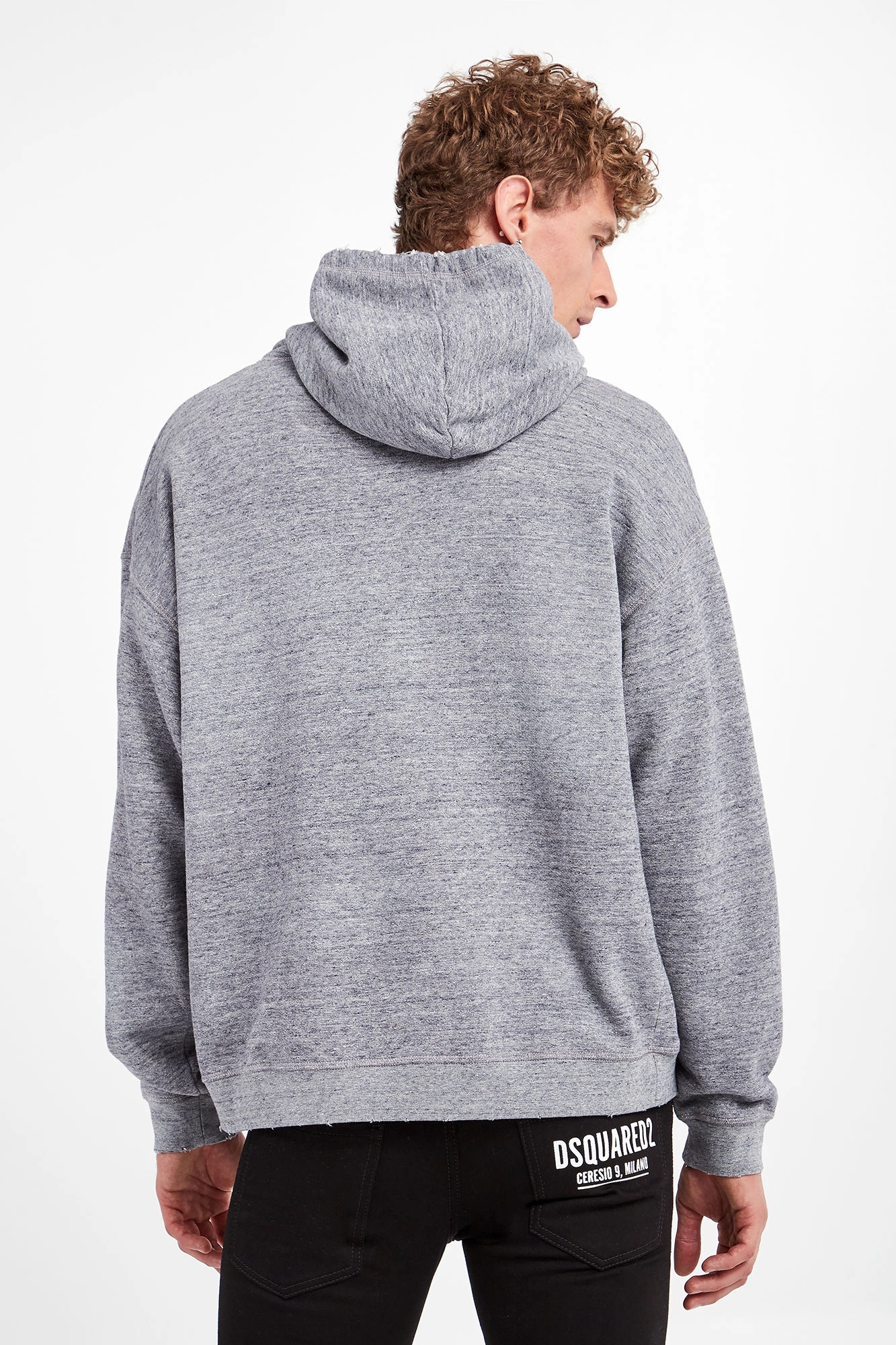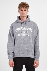 Bluza z kapturem marki Dsquared2 w kolorze szarego melanżu. Kaptur regulowany za pomocą troczków zakończonych srebrną, sygnowaną końcówką. Z przodu duży, biały nadruk z nazwą marki. Dół i rękawy wykończone ściągaczem. Z przodu kieszeń kangurka. Na całości widoczne przetarcia i niewielkie dziurki. W całości wykonana z tkaniny bawełnianej. Fason typu relaxed.