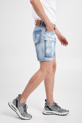Spodenki jeansowe marki Dsquared2 w jasnoniebieskim kolorze. Autorski fason marine short. Na całości przetarcia i przebarwienia. W pasie szlufki. Model z pięcioma kieszeniami. Zapinane za pomocą sygnowanych guzików w srebrnym kolorze. Z przodu ozdobny zamek błyskawiczny. Na całości przetarcia i strzępienia. Z tyłu skórzana naszywka z nazwą marki w brązowym kolorze. W całości wykonane z tkaniny bawełnianej.