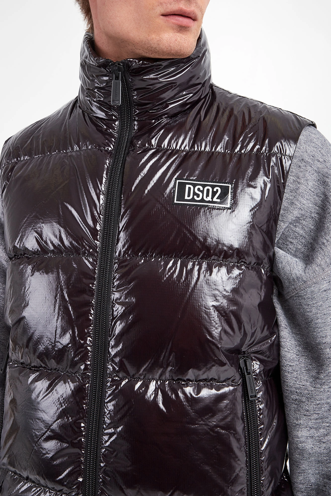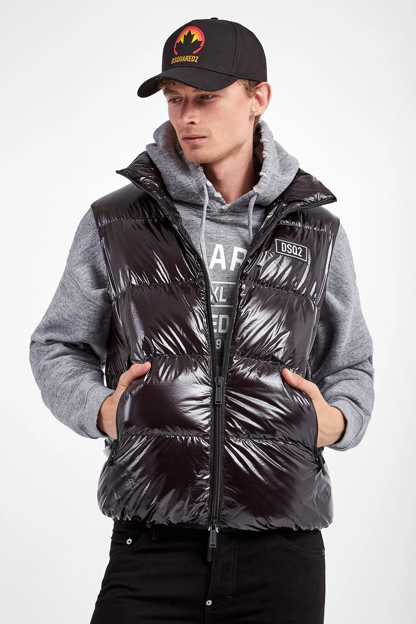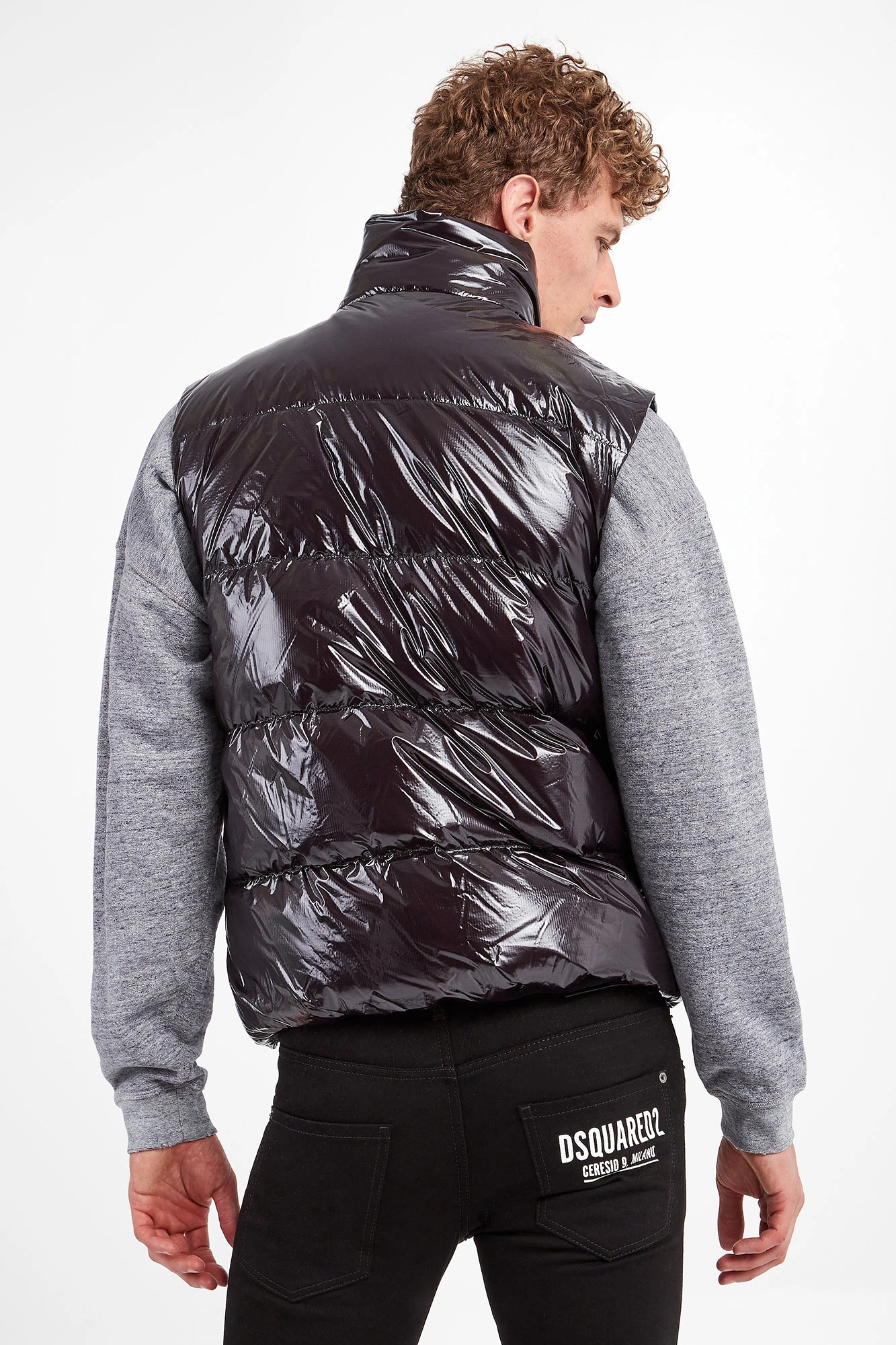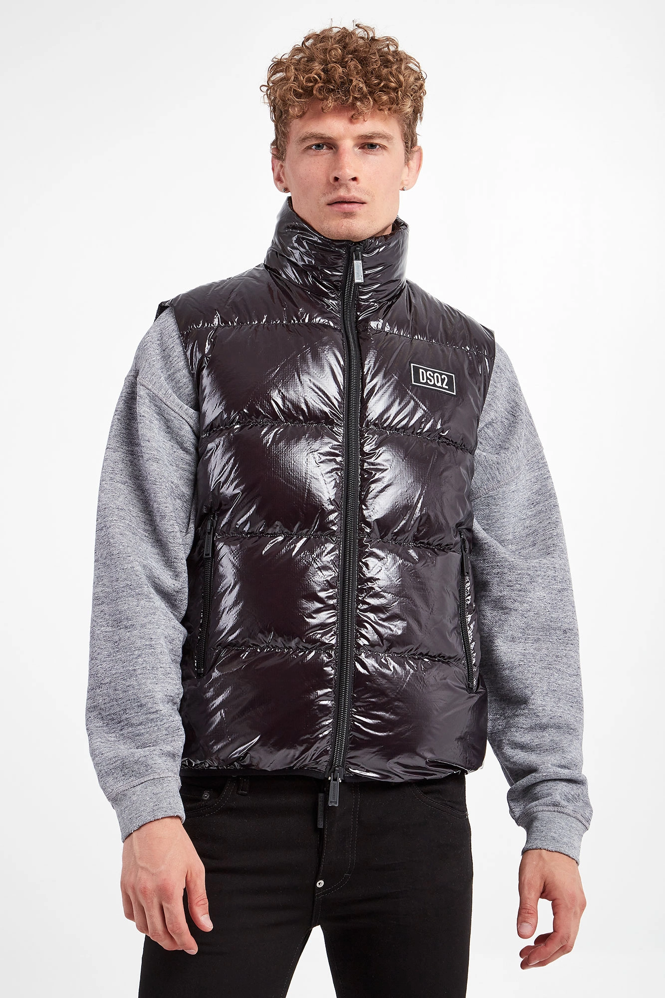 Puchowa kamizelka ze stójką marki Dsquared2 w czarnym kolorze. Z połyskującego materiału. Na całości poziome pikowania. Na piersi naszywka z logo marki. Kamizelka zapinana na podwójny zamek. Model z dwiema kieszeniami zapinanymi na zamek. Zamki z sygnowanymi zawieszkami. Fason relaxed fit.