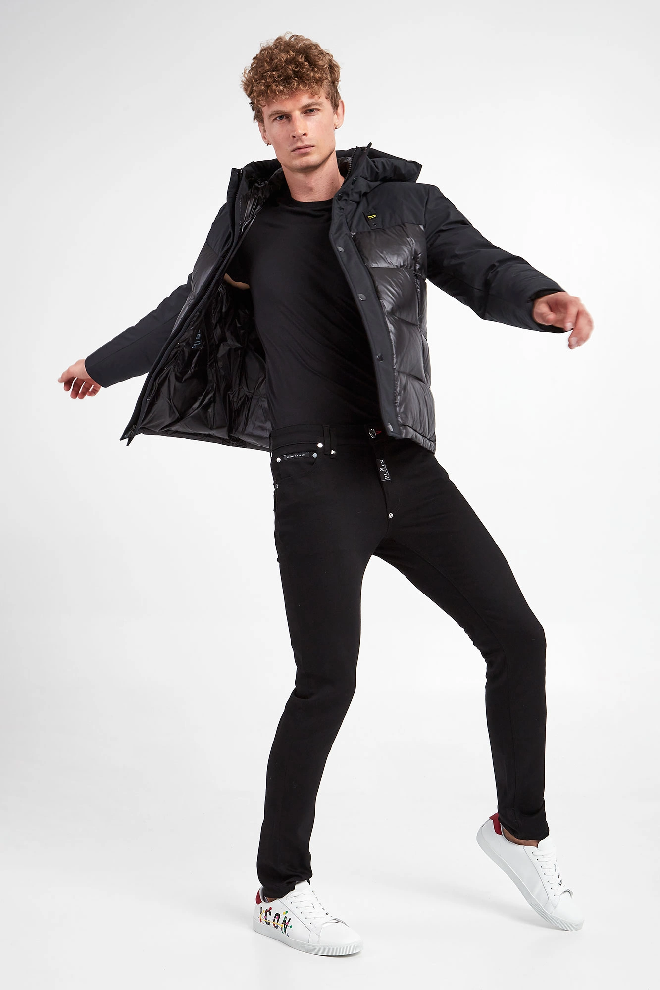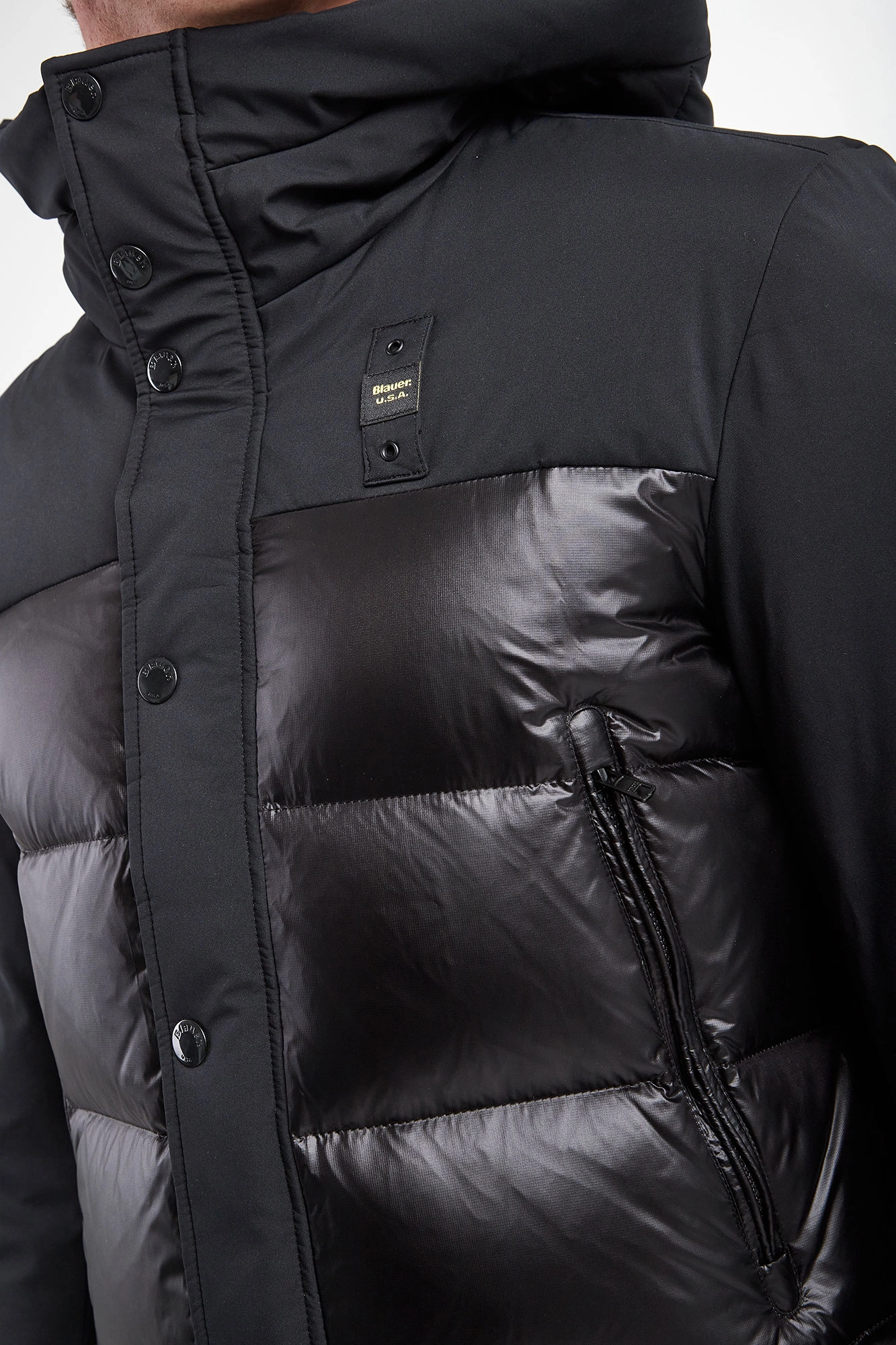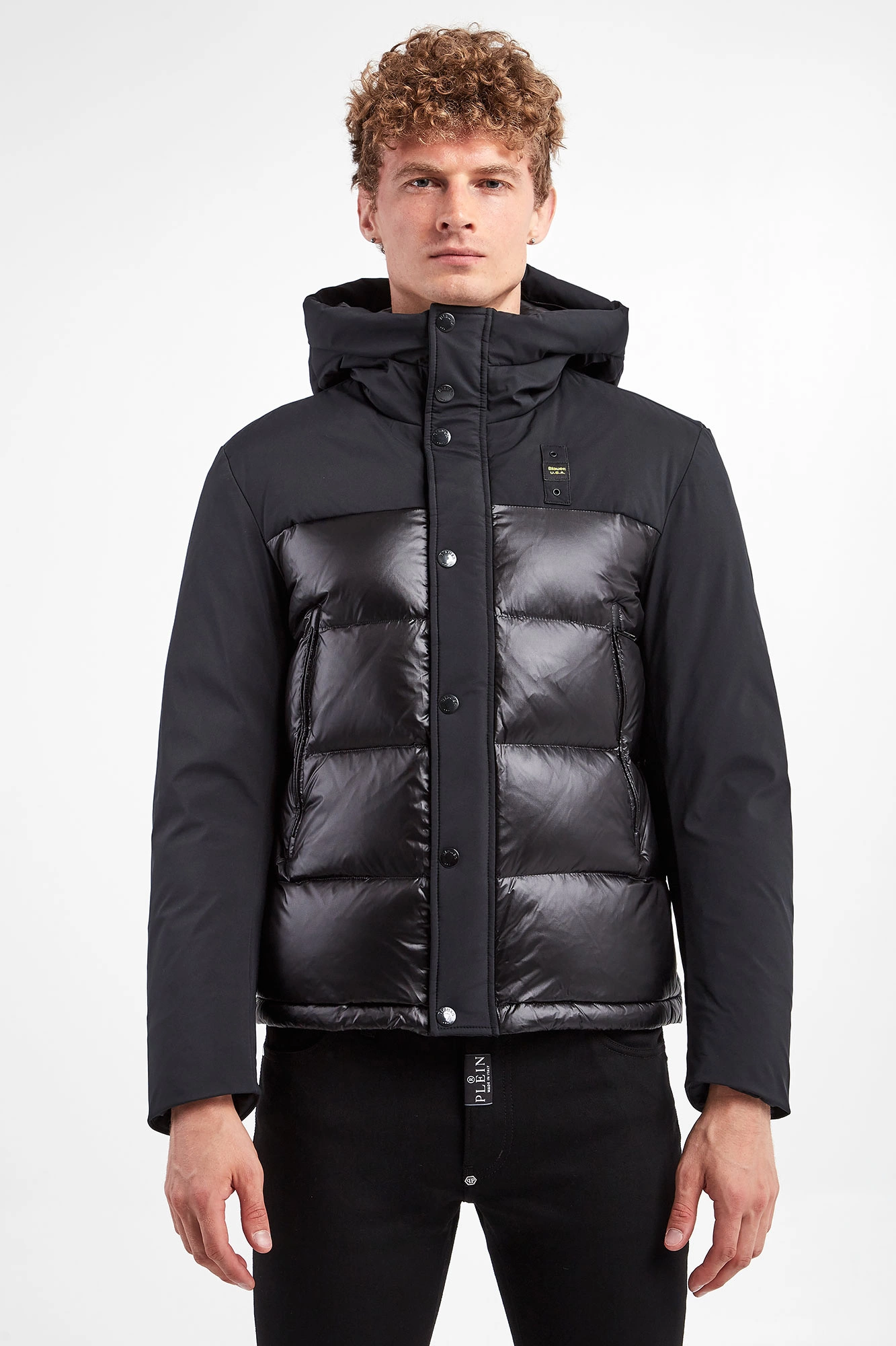 Kurtka z kapturem marki Blauer w czarnym kolorze. Zapinana na podwójny zamek i napy. Dolna część kurtki pikowana, rękawy i góra gładkie. Dwie kieszenie na froncie i dwie wewnętrzne. Rękawy ze ściągaczami wewnętrznymi, które zapobiegają przedostaniu się zimnego powietrza do wewnątrz. Na piersi sygnowana szlufka. Wypełnienie z puchu i pierza białej kaczki. Regularny fason.