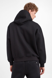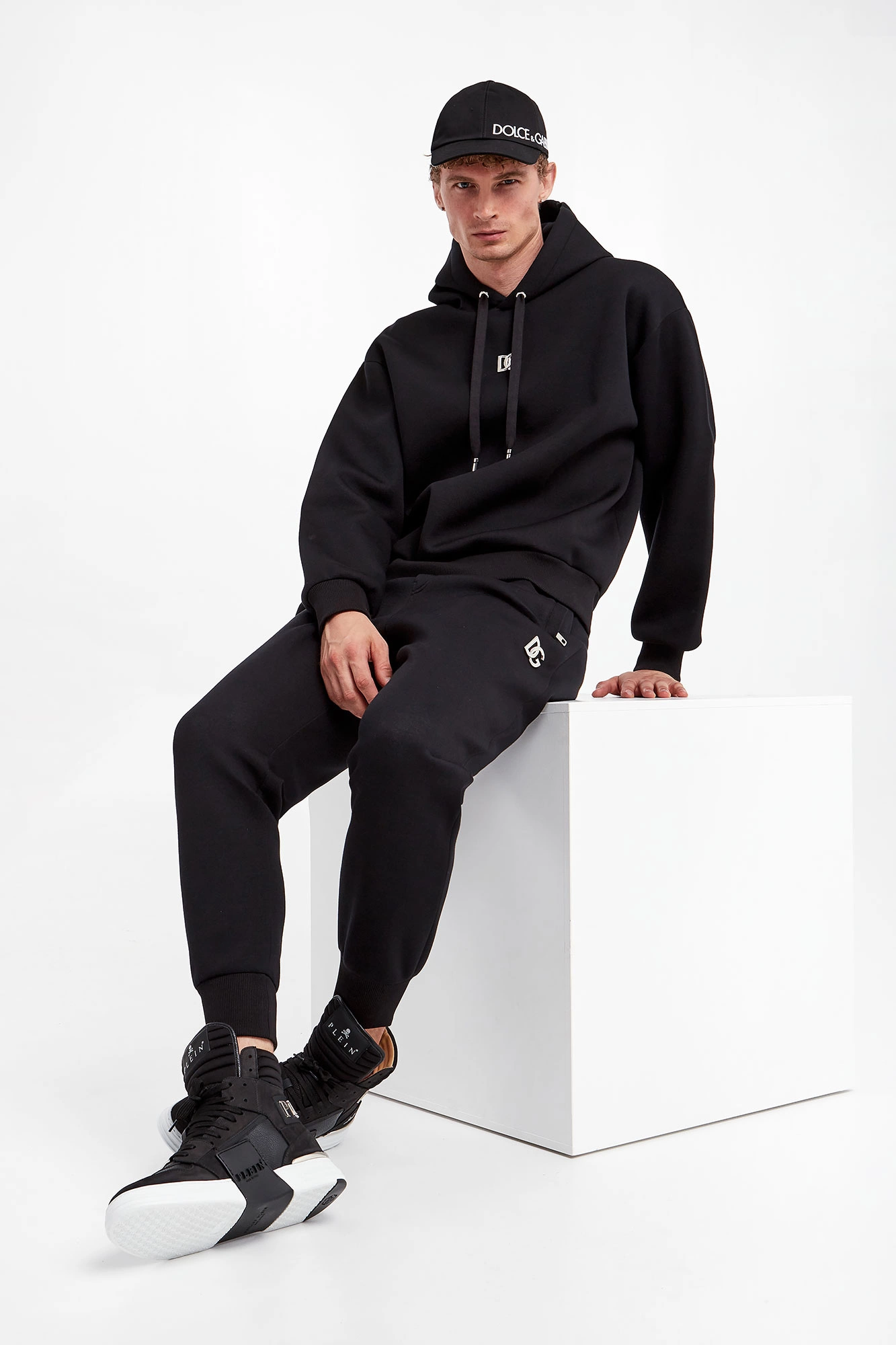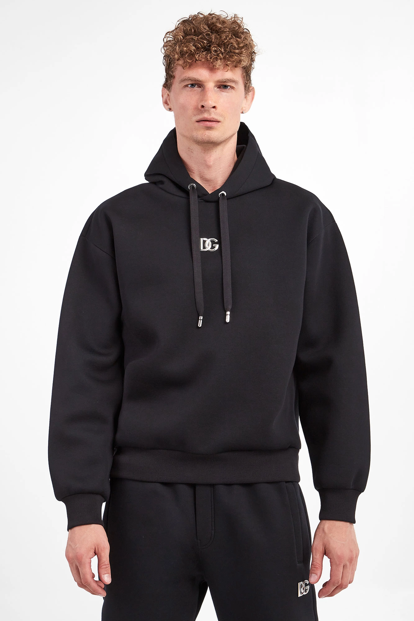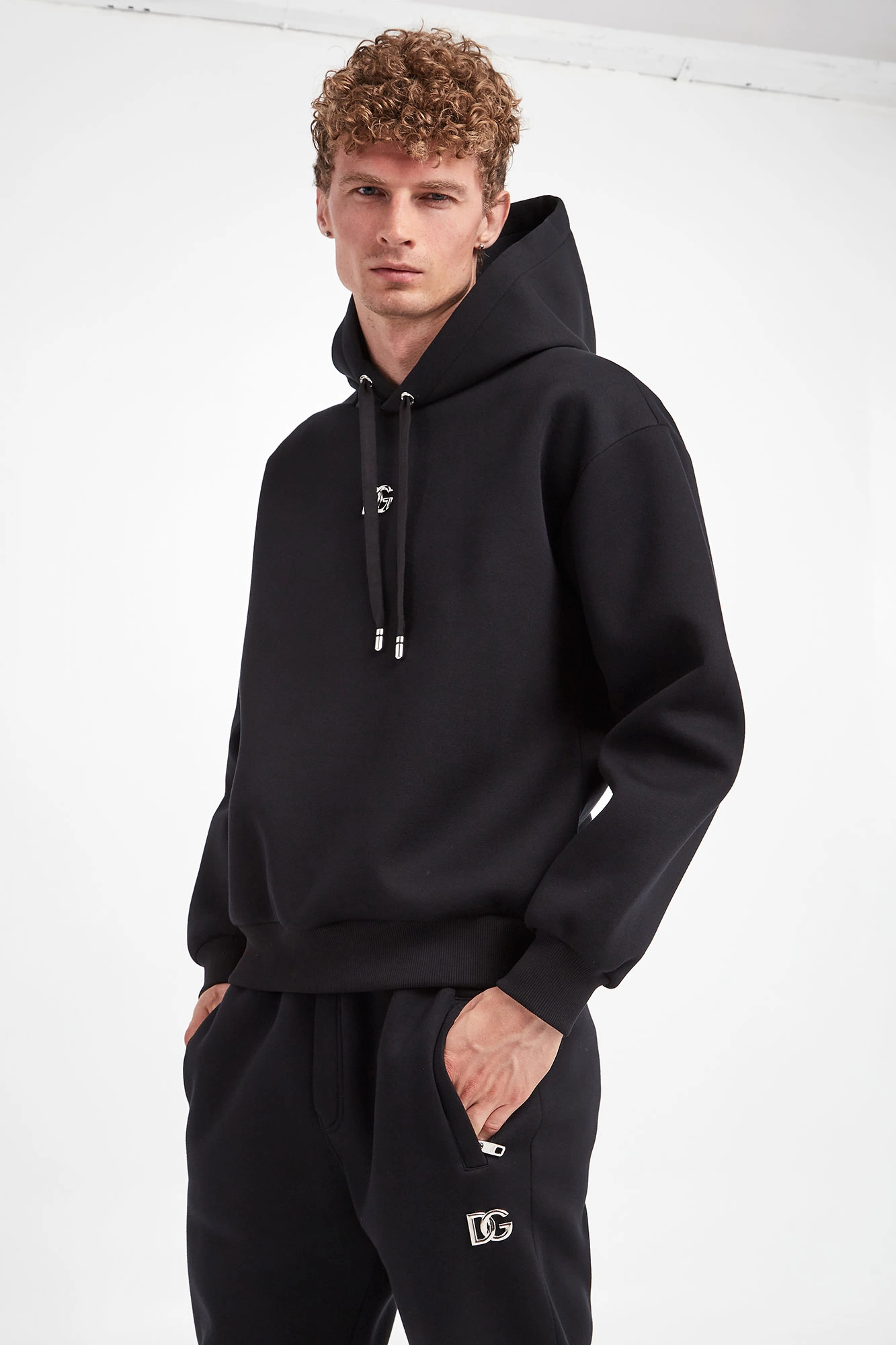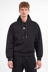 Bluza z kapturem marki Dolce & Gabbana w kolorze czarnym. Na froncie aplikacja w postaci srebrnego logo marki. Przy kapturze troczki z sygnowaną zawieszką. Długie rękawy i dół wykończone elastycznym ściągaczem prążkowanym. Fason typu relaxed fit.