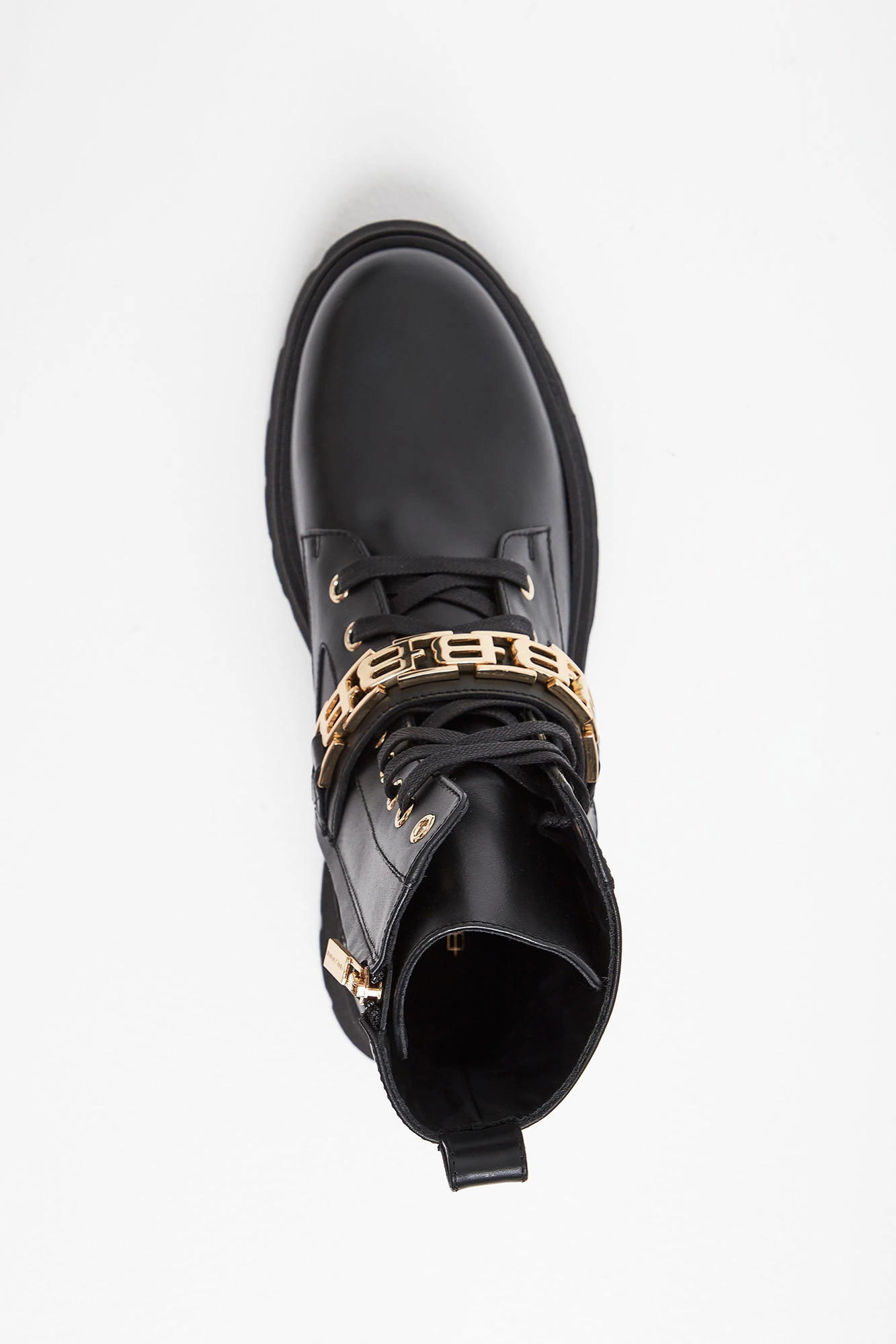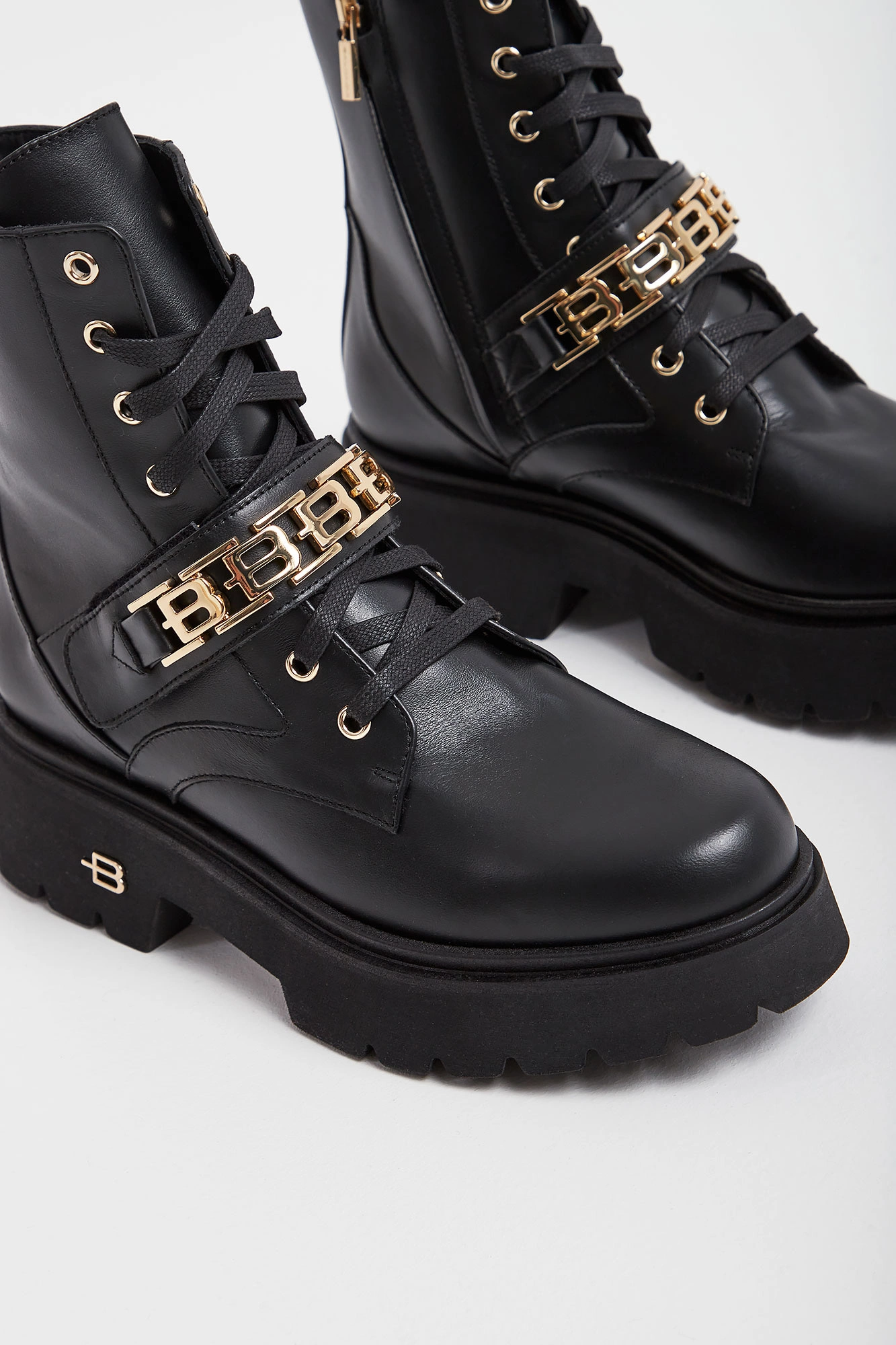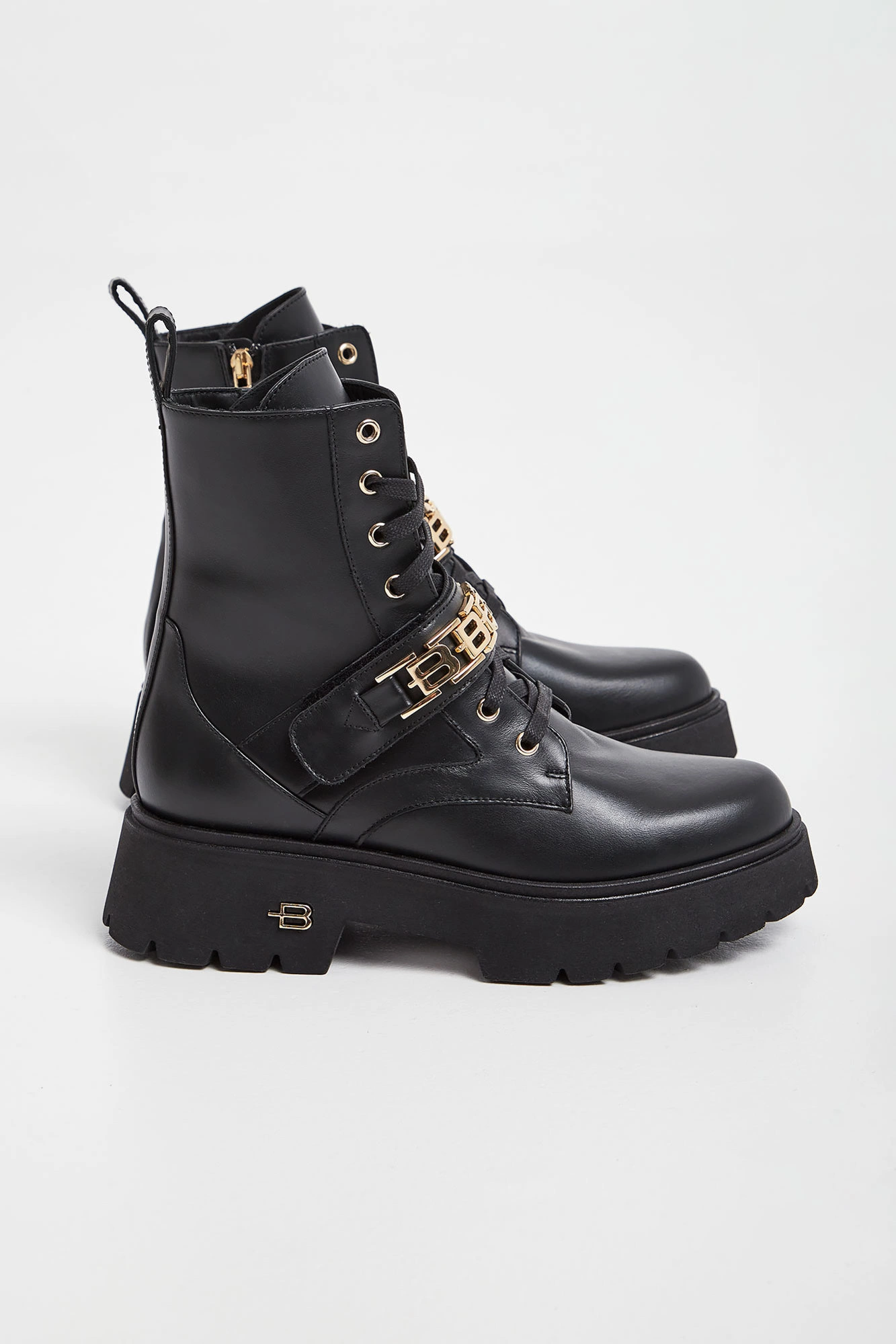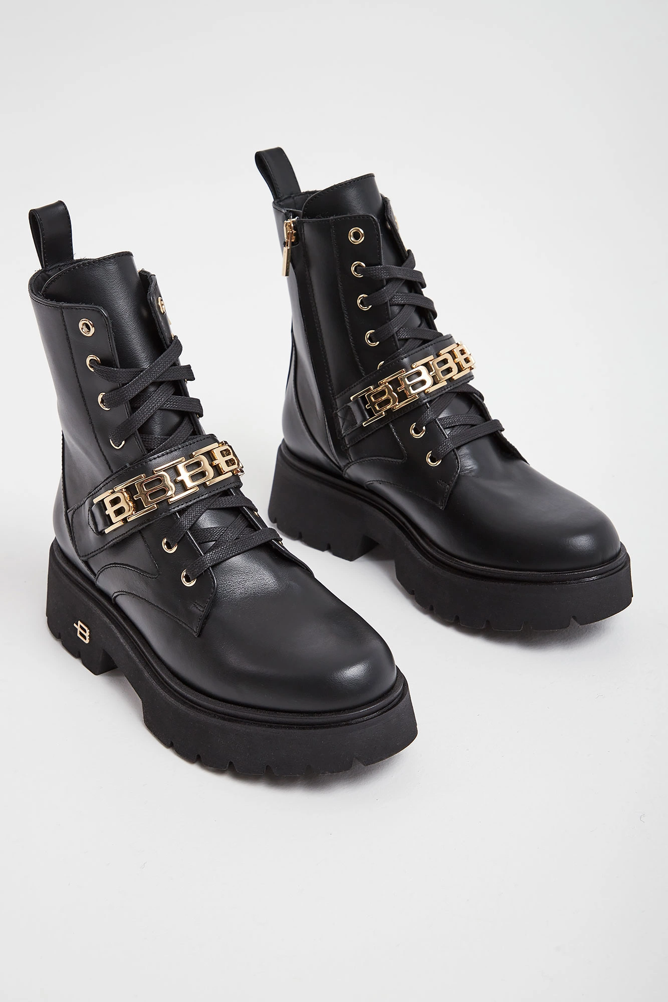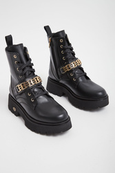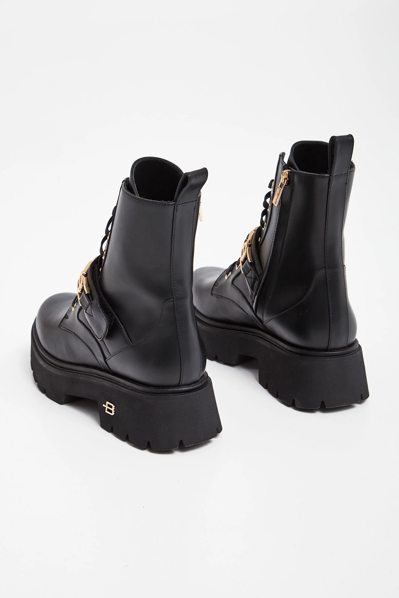 Trapery marki Baldinini w kolorze czarnym. Wiązane i zapinane na sygnowany zamek. Na przodzie ozdobny pasek zapinany na rzep, z aplikacją w postaci łańcucha w kształcie monogramu marki. Gruba, sygnowana podeszwa. Wszystkie elementy ozdobne w kolorze złotym. Buty wykonane ze skóry naturalnej.