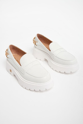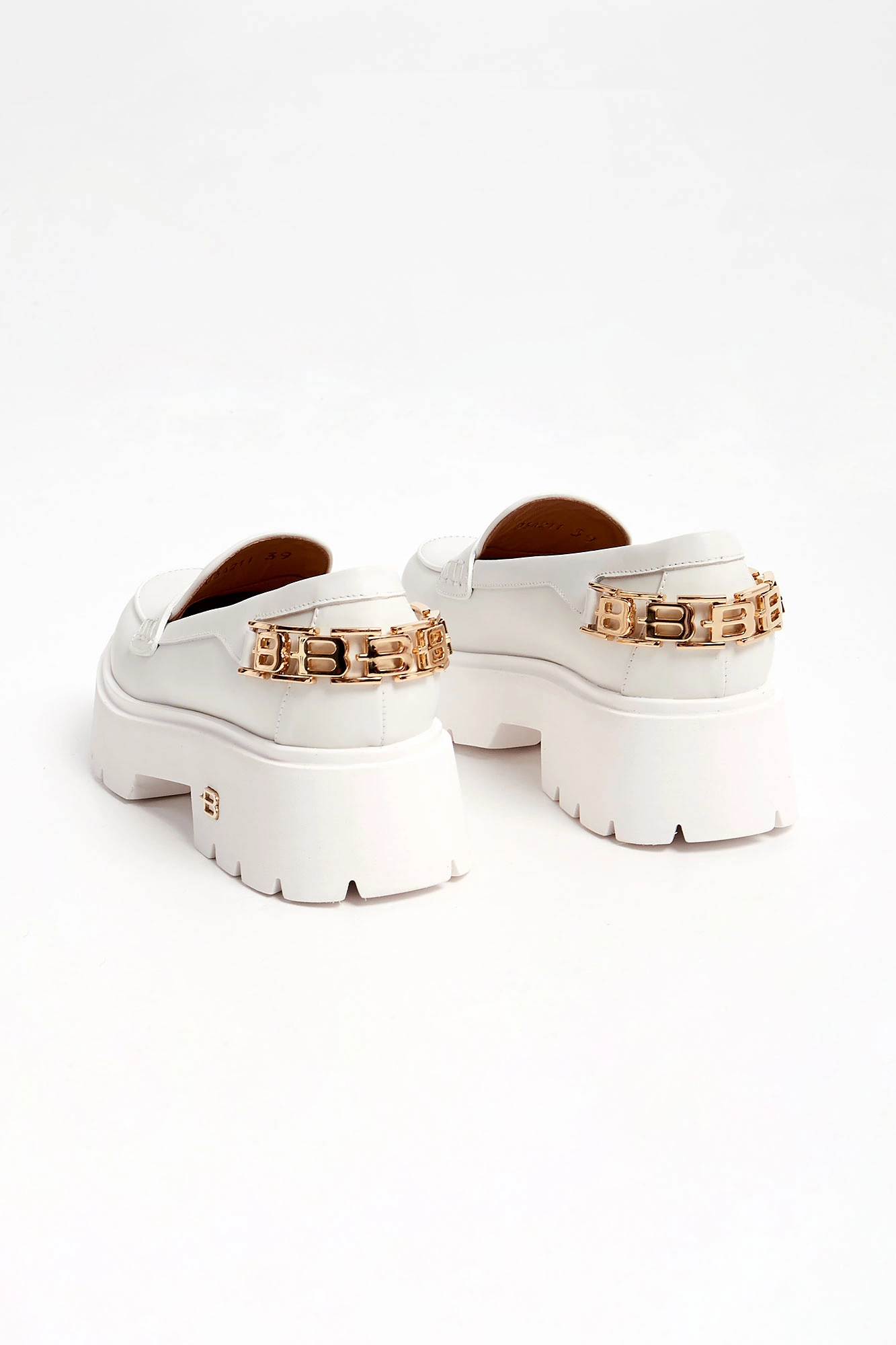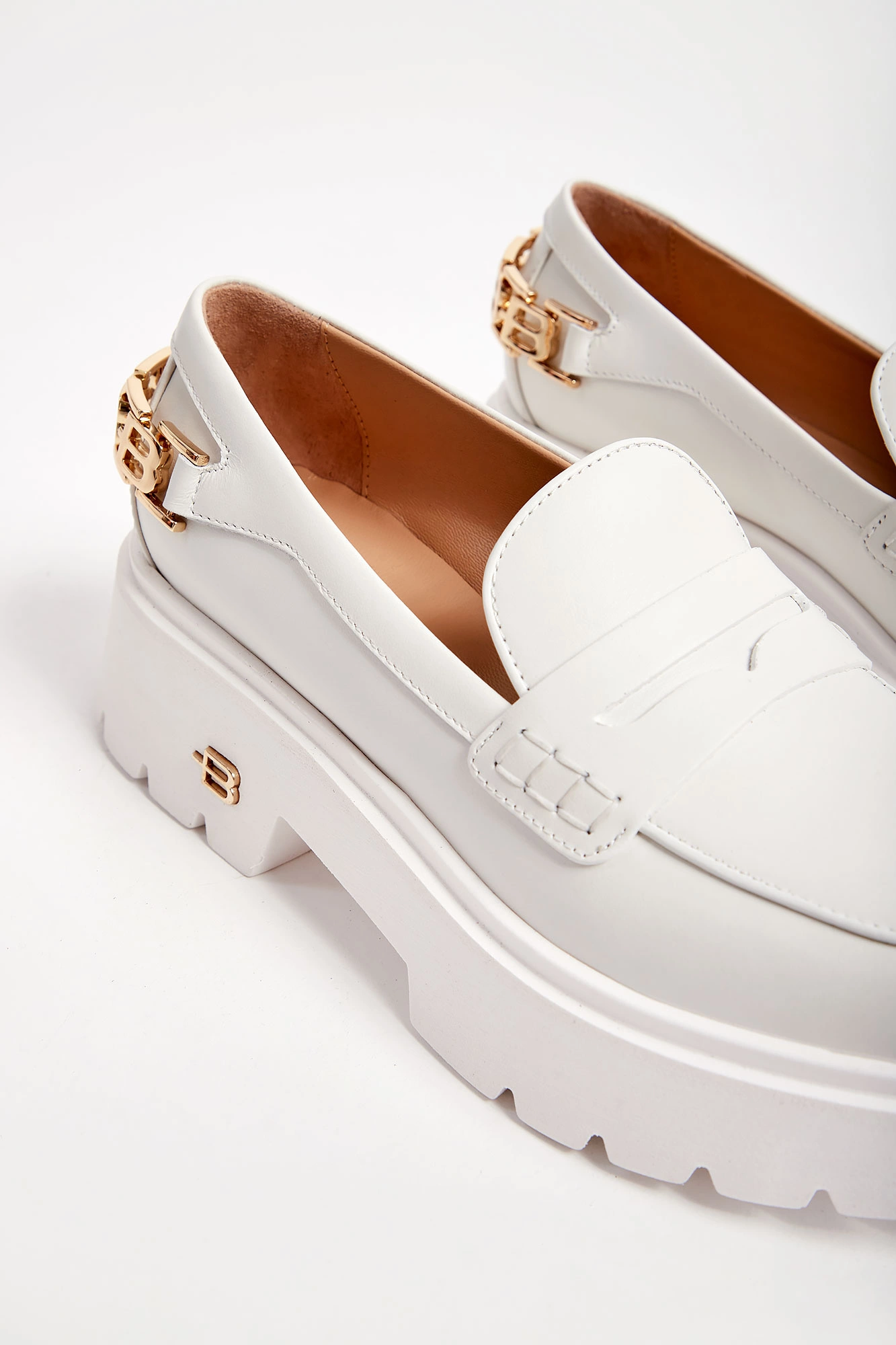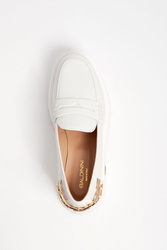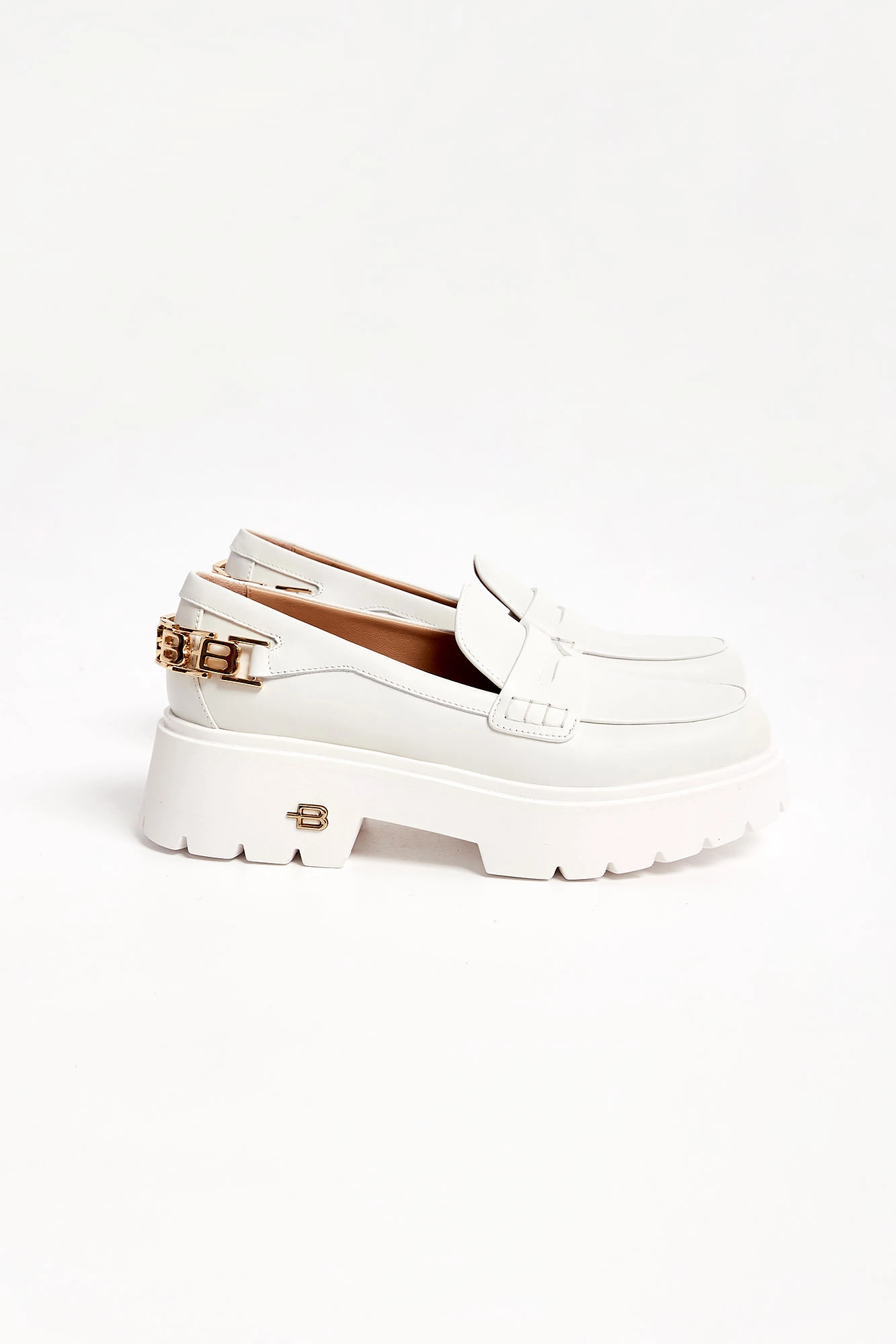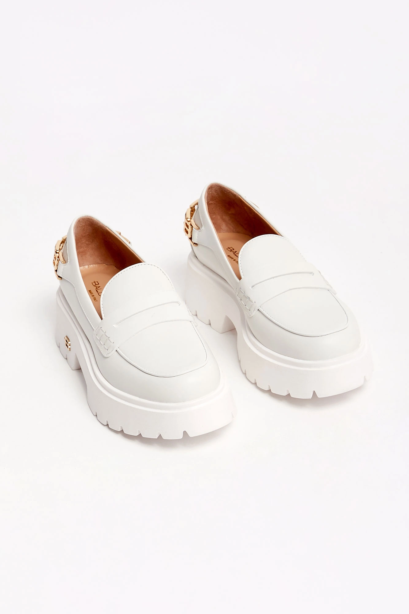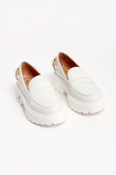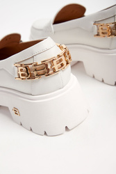 Skórzane półbuty marki Baldinini w białym kolorze. Loafersy. Wsuwane. Z przodu skórzany pasek. Z tyłu złota, metalowa aplikacja z monogramami marki. Wysoka podeszwa, logowana złotym monogramem.