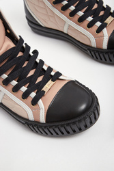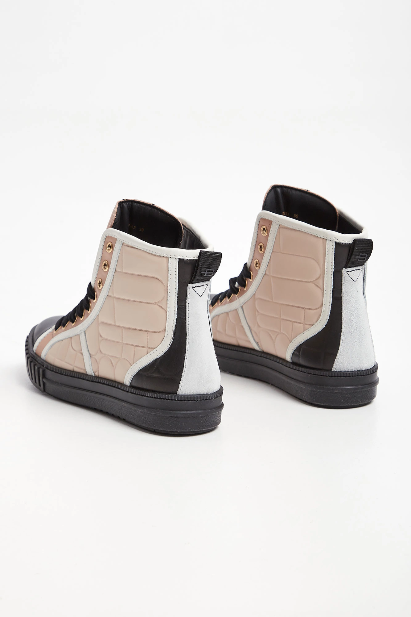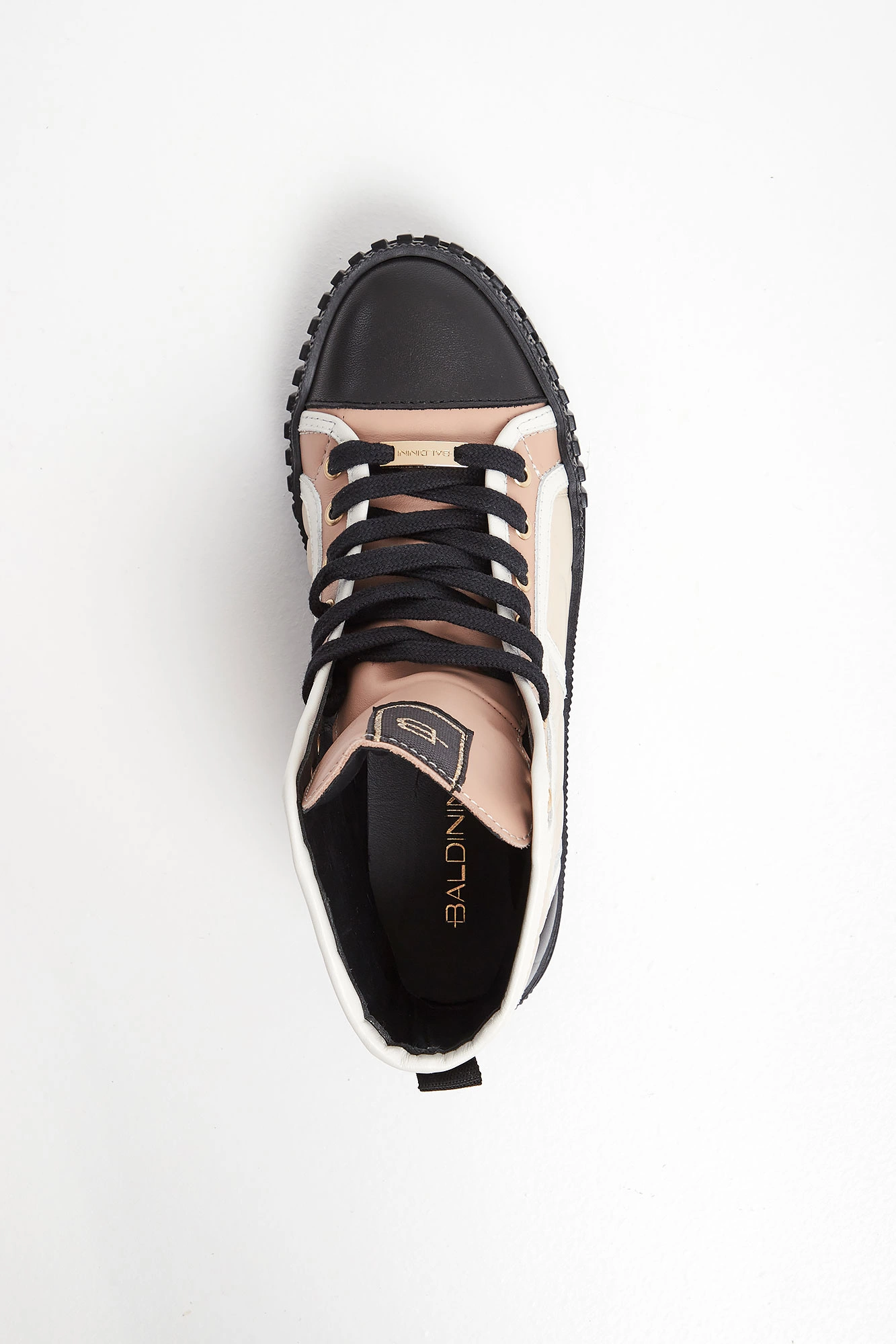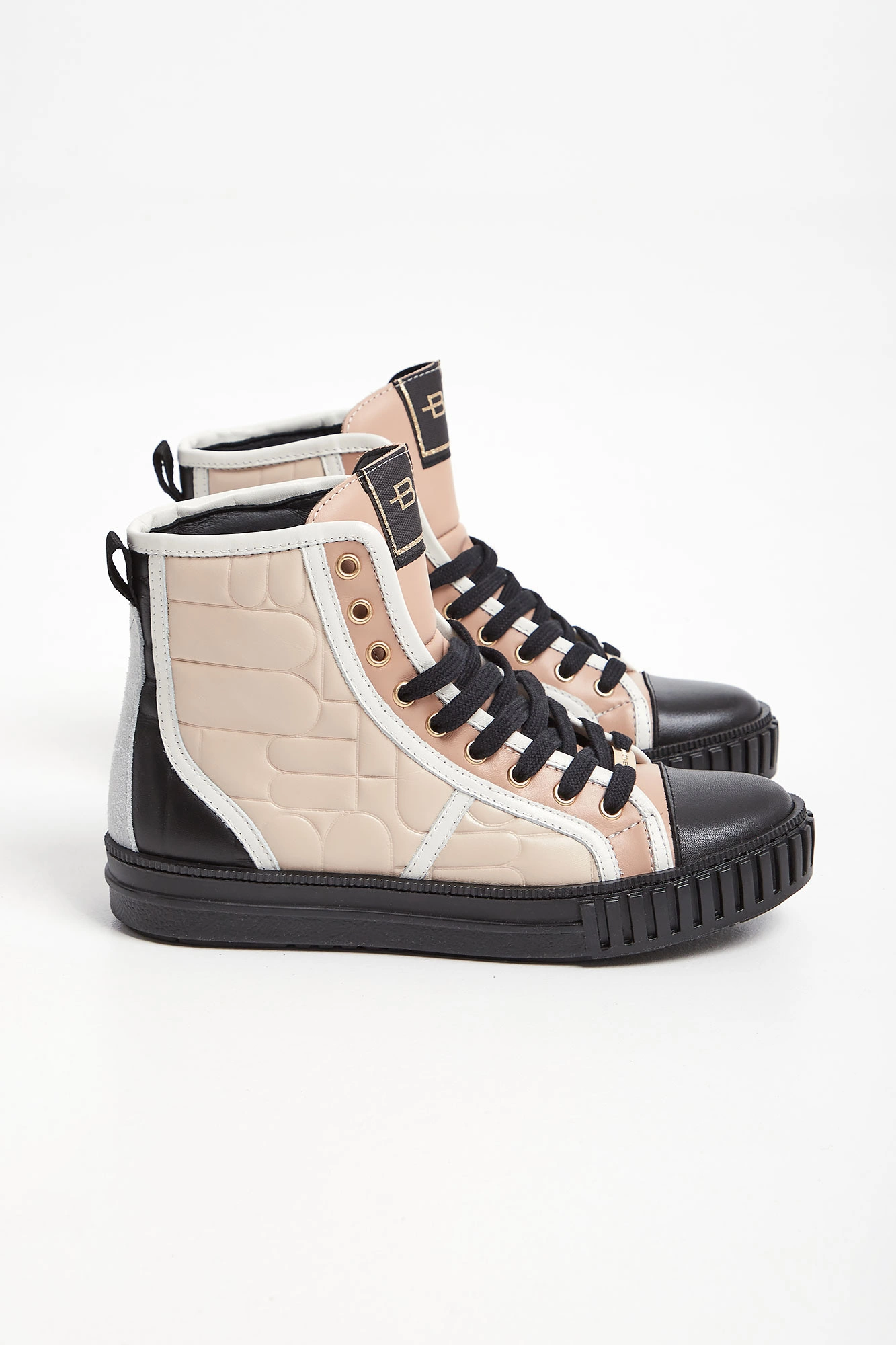 Skórzane sneakersy marki Baldinini w beżowo-czarnym kolorze. Wyższa cholewka. na całości łączony monogram marki. Wiązane za pomocą sznurówek w czarnym kolorze, ze złotą aplikacją. Na języku naszywka z haftem monogramu marki w złotym kolorze. Z tyłu wstawka szarej zamszowej skóry i pętelka ułatwiająca zakładanie. Klasyczna, gumowana podeszwa w czarnym kolorze.