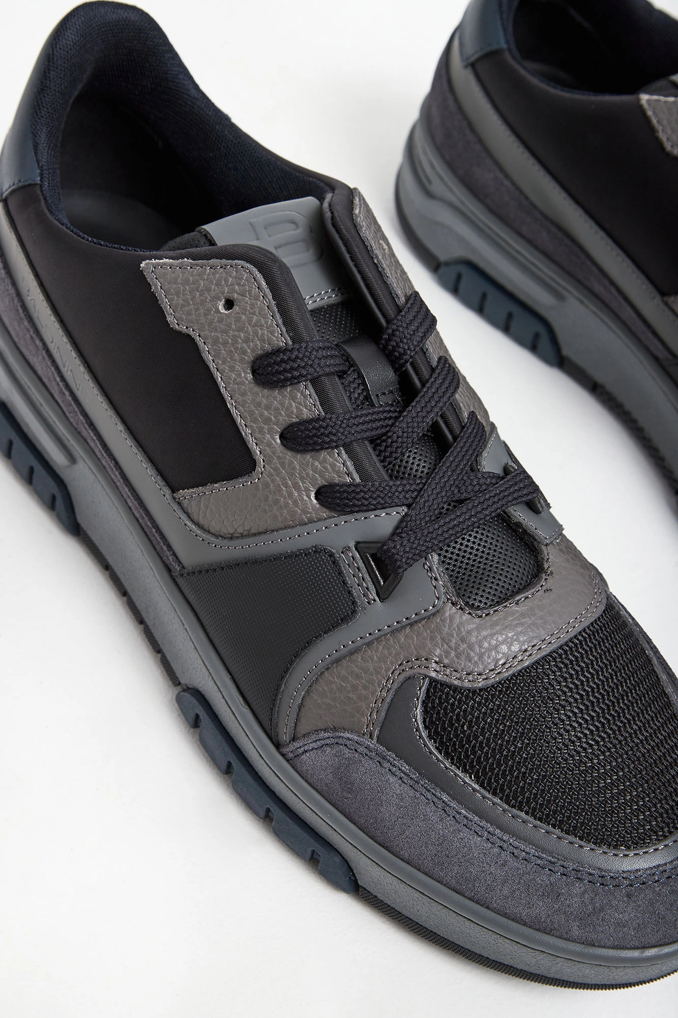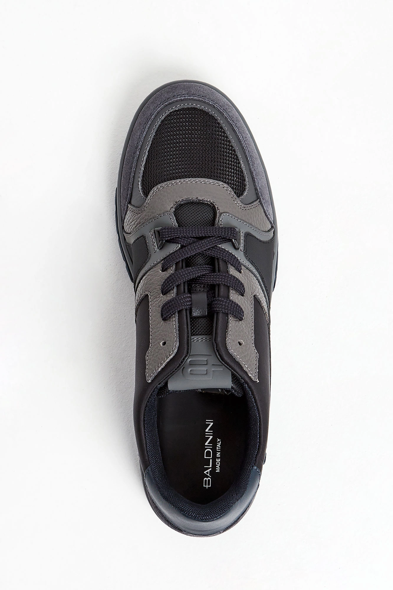 Sneakersy marki Baldinini w kolorze grafitowym. Na całości liczne przeszycia skórzane i siateczkowe. Wiązane na materiałowe sznurówki. Na języku naszyta aplikacja z nazwą marki. Po zewnętrznej stronie logo marki. Wnętrze buta sygnowane, wykonane ze skóry naturalnej. Szaro-grafitowa, rowkowana podeszwa.