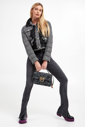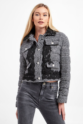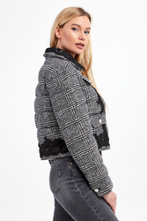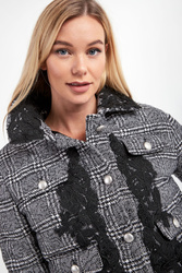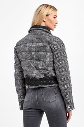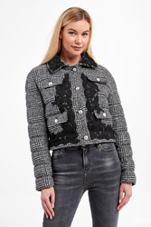 Pikowana kurtka marki Ermanno Firenze. Na całości wzór w postaci czarno-białej kratki i czarne, połyskujące cekiny. Dekolt wykończony klasycznym kołnierzem z ozdobną koronką. Zapinana za pomocą sygnowanych guzików w srebrnym kolorze. Z przodu cztery patki z guzikami imitujące kieszenie. Na całości wstawki koronki w czarnym kolorze. Długie rękawy zakończone zapinanymi mankietami. Fason typu relaxed.