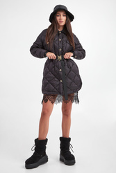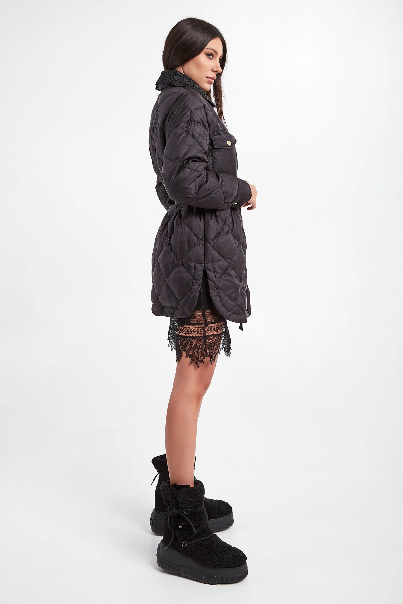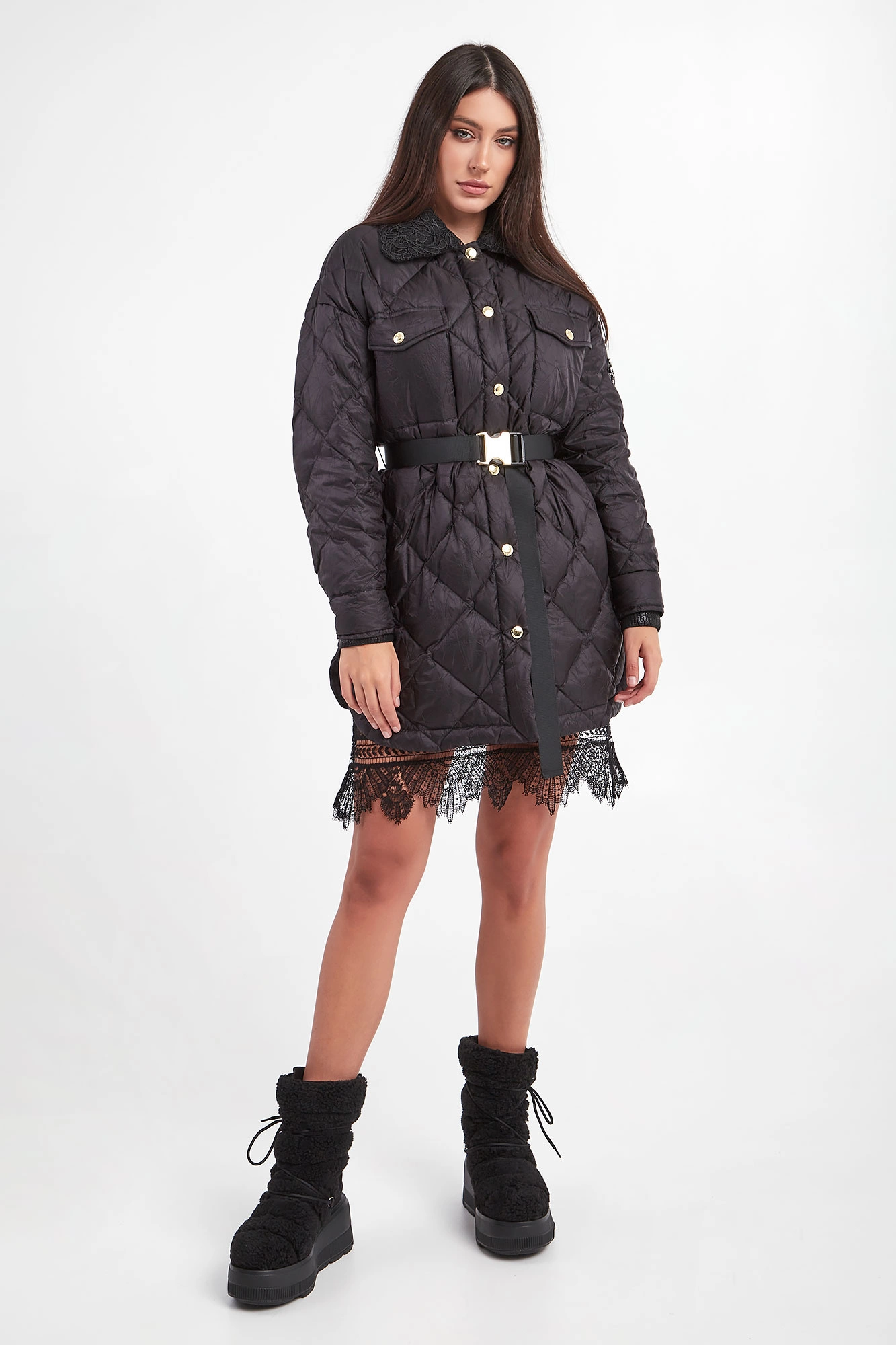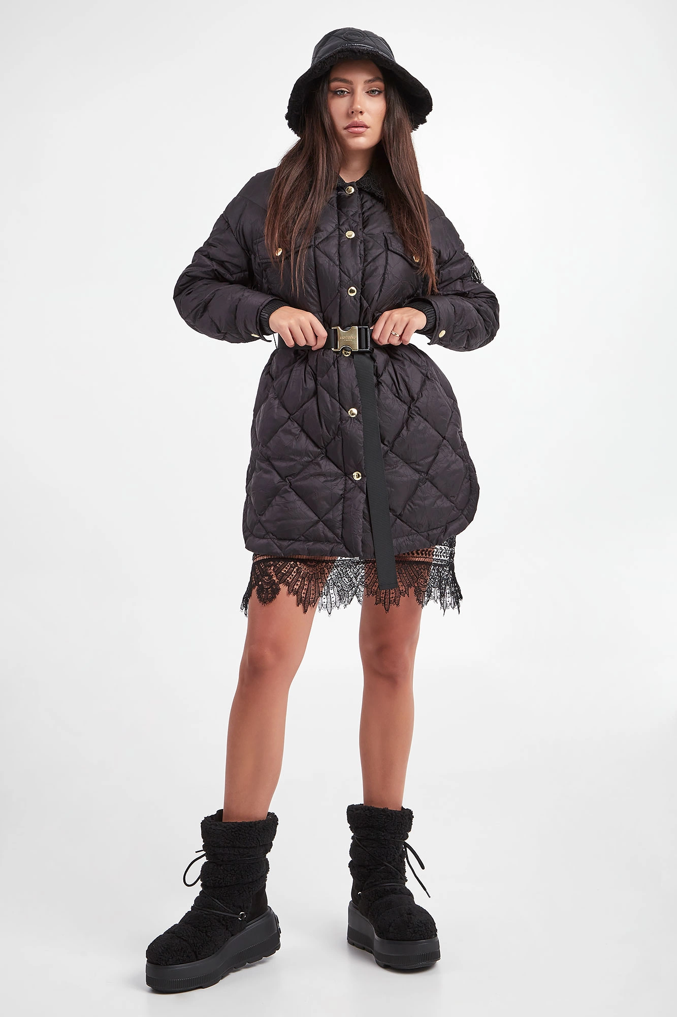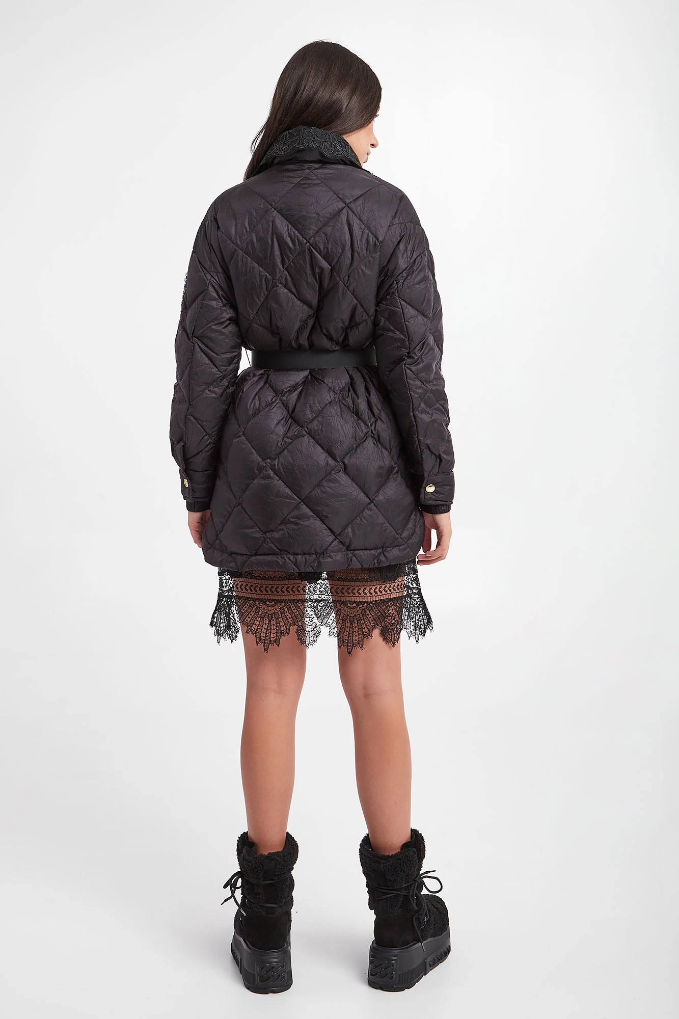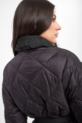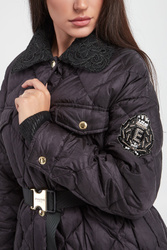 Pikowana kurtka marki Ermanno Firenze w czarnym kolorze. Z kołnierzem wykończonym ozdobną koronką. Obniżona linia ramion. Rękawy wykończone mankietem zapinanym za pomocą sygnowanych nap. Model z czterema kieszeniami zapinanymi za pomocą nap i zamka. W talii szlufki i pasek zapinany za pomocą złotej, sygnowanej klamry. Zapinana za pomocą sygnowanych nap w złotym kolorze. Na rękawie ozdobne logo marki wykonane z kryształków i koralików. Fason regular. Naturalne wypełnienie.