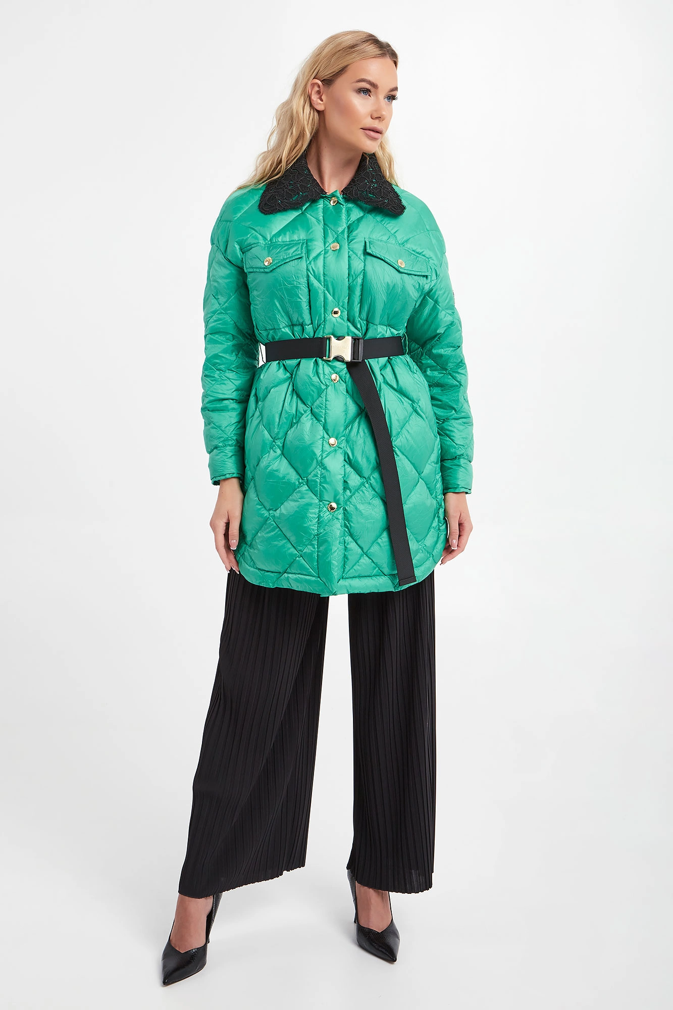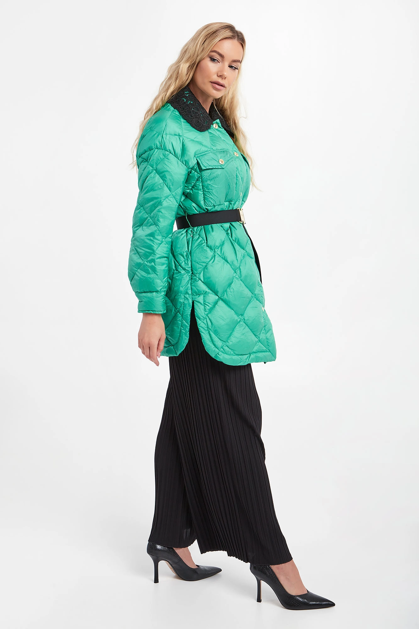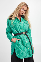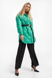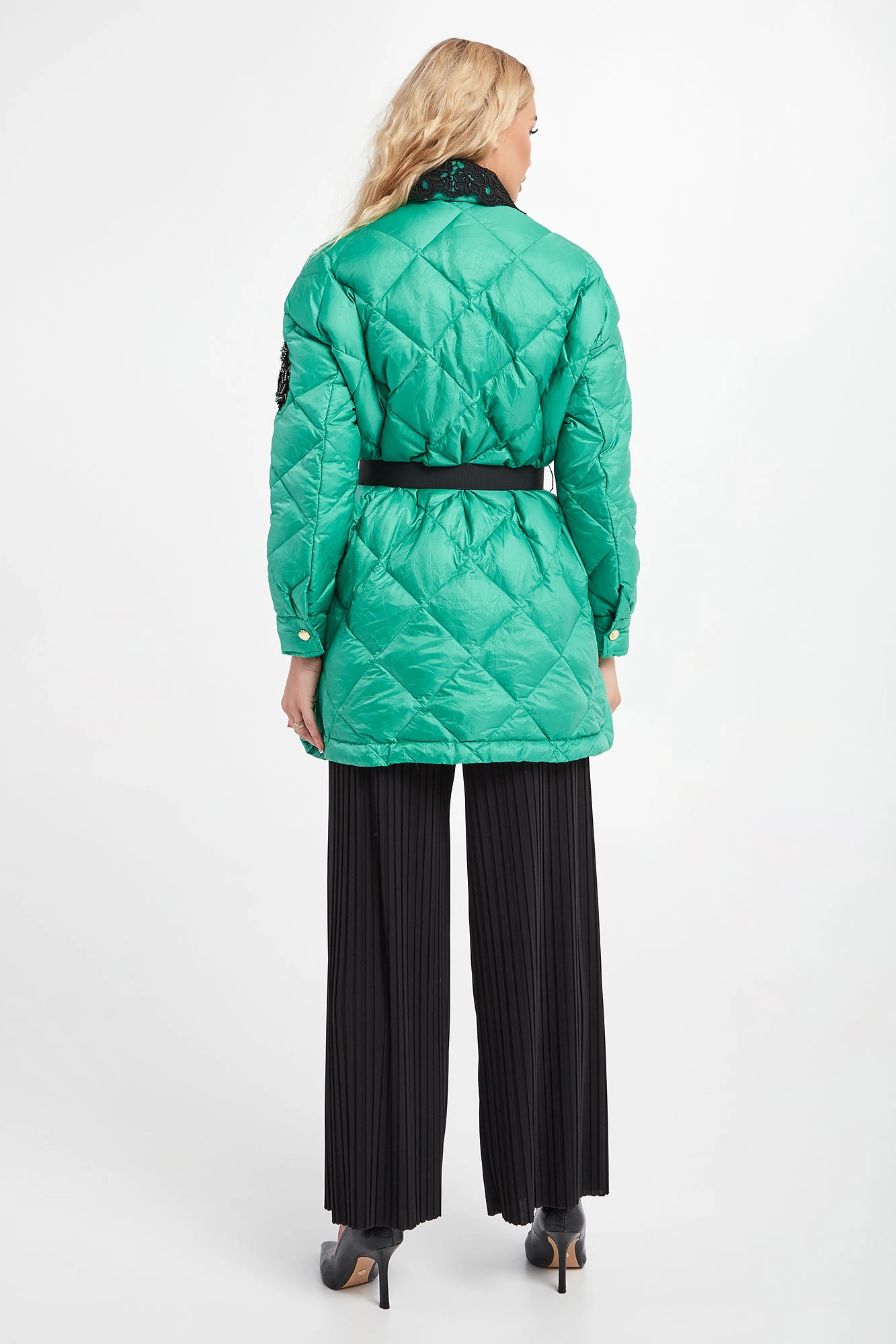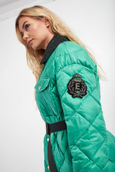 Puchowa kurtka marki Ermanno Firenze w zielonym kolorze. Pikowana. Zapinana za pomocą sygnowanych, złotych nap. z Na rękawie czarne logo wykonane z kryształków i koralików. Kołnierz ozdobiony czarną, odpinaną, koronkową wstawką. Model z czterema zamykanymi kieszeniami. Rękawy zakończone zapinanymi mankietami. Zaokrąglony dół z rozcięciami po bokach. Dodatkowo czarny pasek. Fason regular.