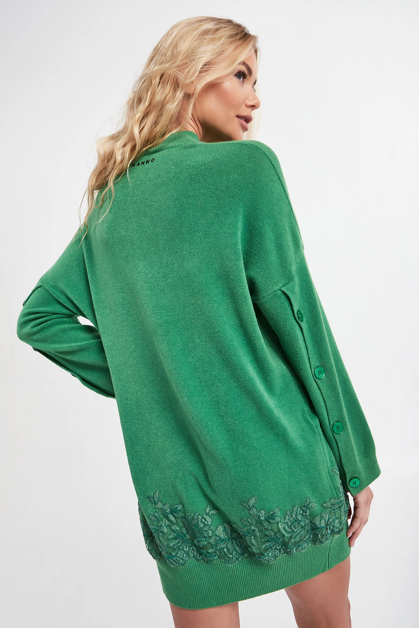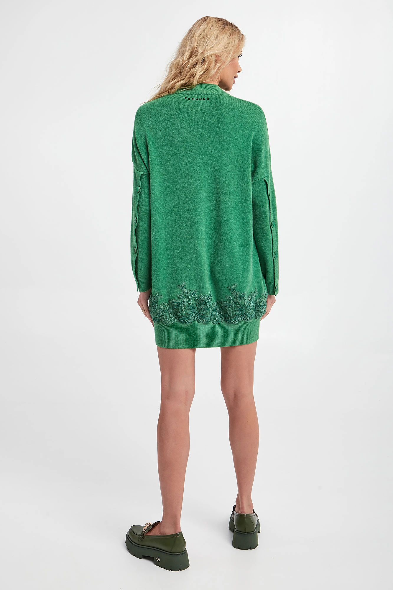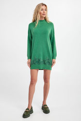 Dzianinowa sukienka marki Ermanno Firenze w zielonym kolorze. Dekolt z półgolfem. Dół wykończony ściągaczem i koronką w kwiatowy wzór. Obniżona linia ramion. Rękawy ze ściągaczami zapinane z tyłu za pomocą opalizujących guzików. Na linii karku czarny nadruk z nazwą marki. Fason relaxed, długość mini.