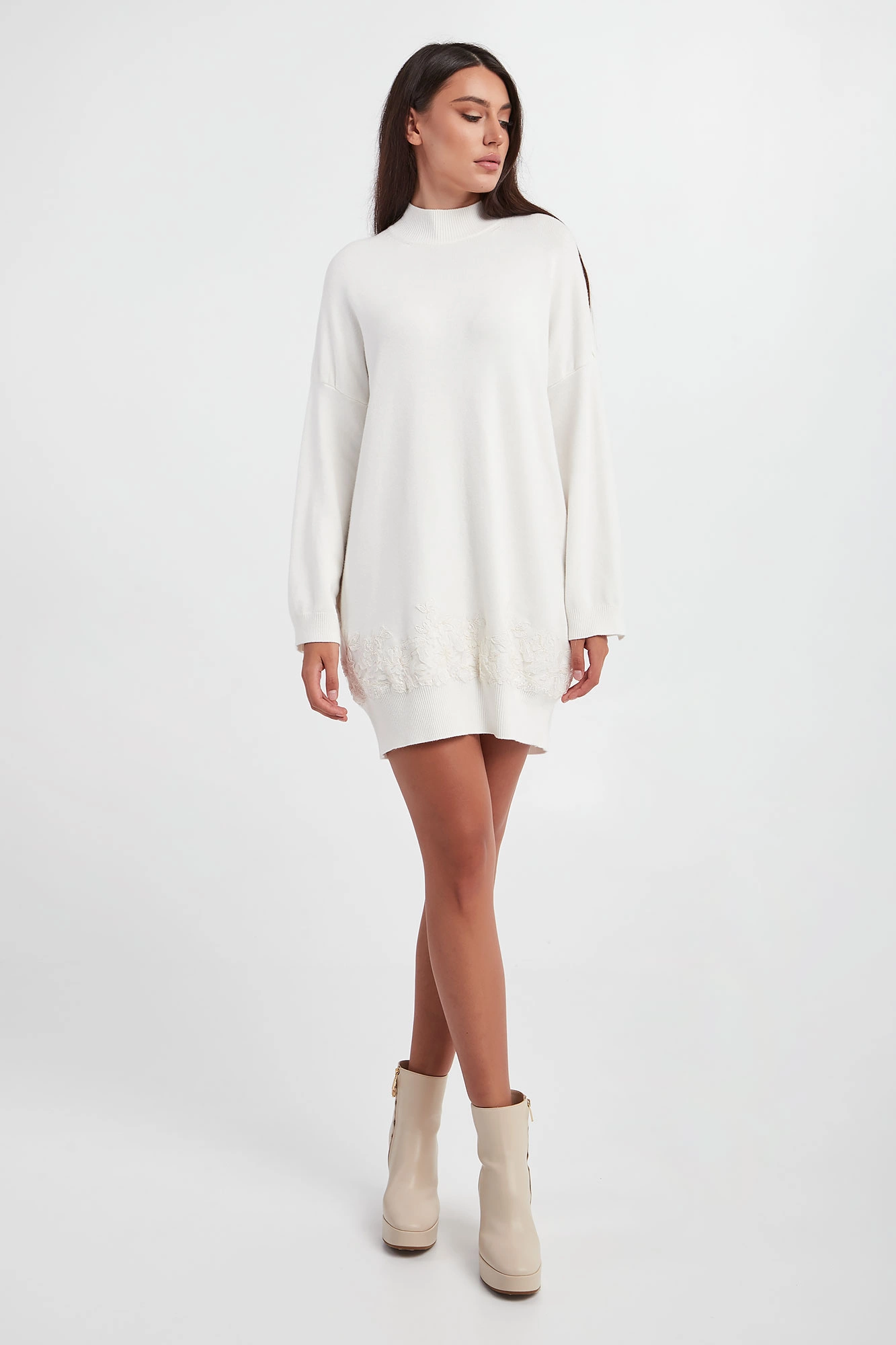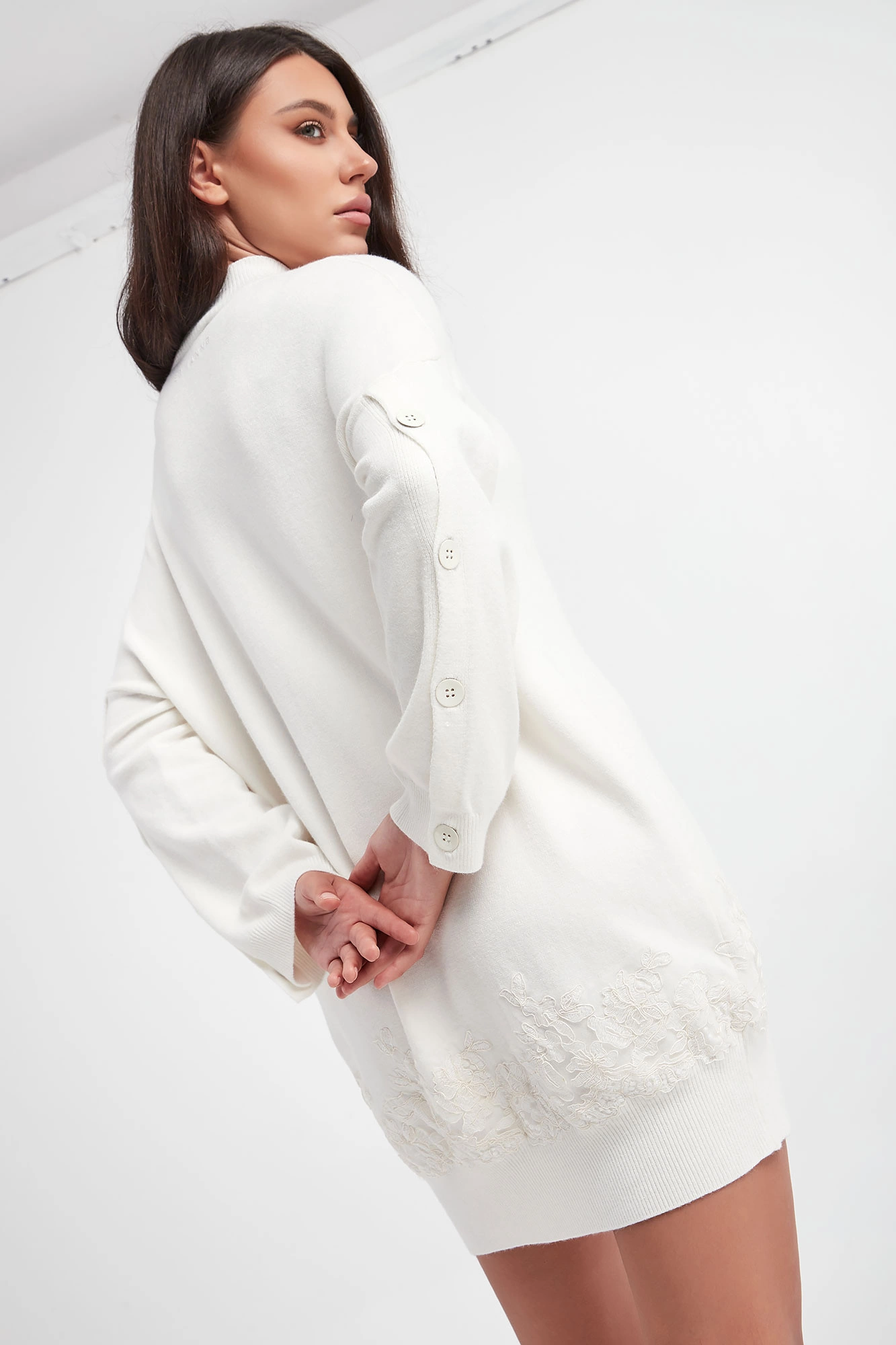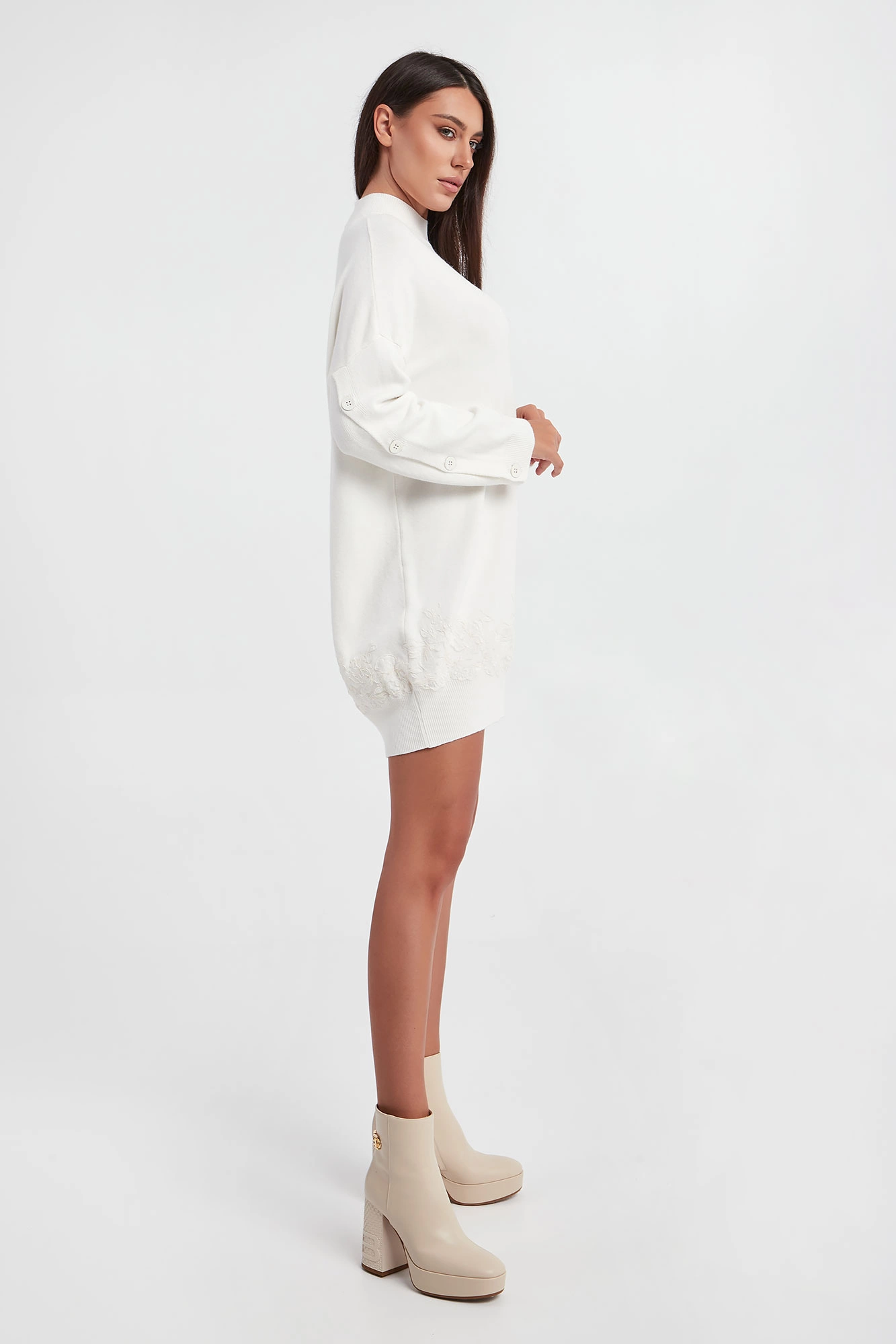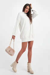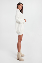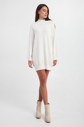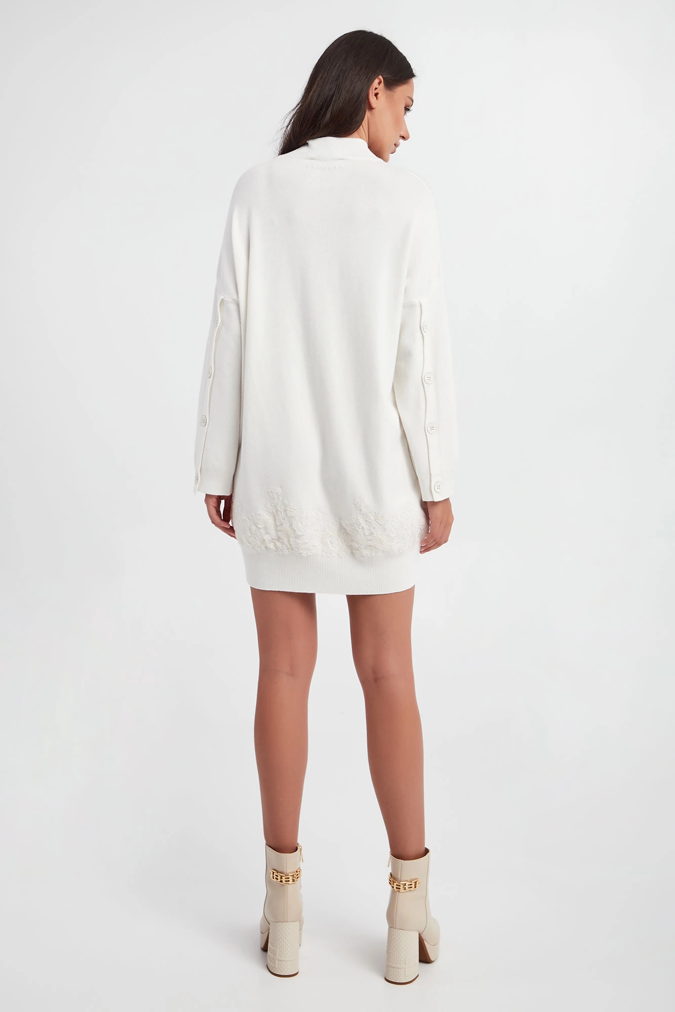 Dzianinowa sukienka marki Ermanno Firenze w kolorze złamanej bieli. Dekolt z półgolfem. Dół wykończony ściągaczem i koronką w kwiatowy wzór. Obniżona linia ramion. Rękawy ze ściągaczami zapinane z tyłu za pomocą opalizujących guzików. Na linii karku biały nadruk z nazwą marki. Fason relaxed, długość mini.