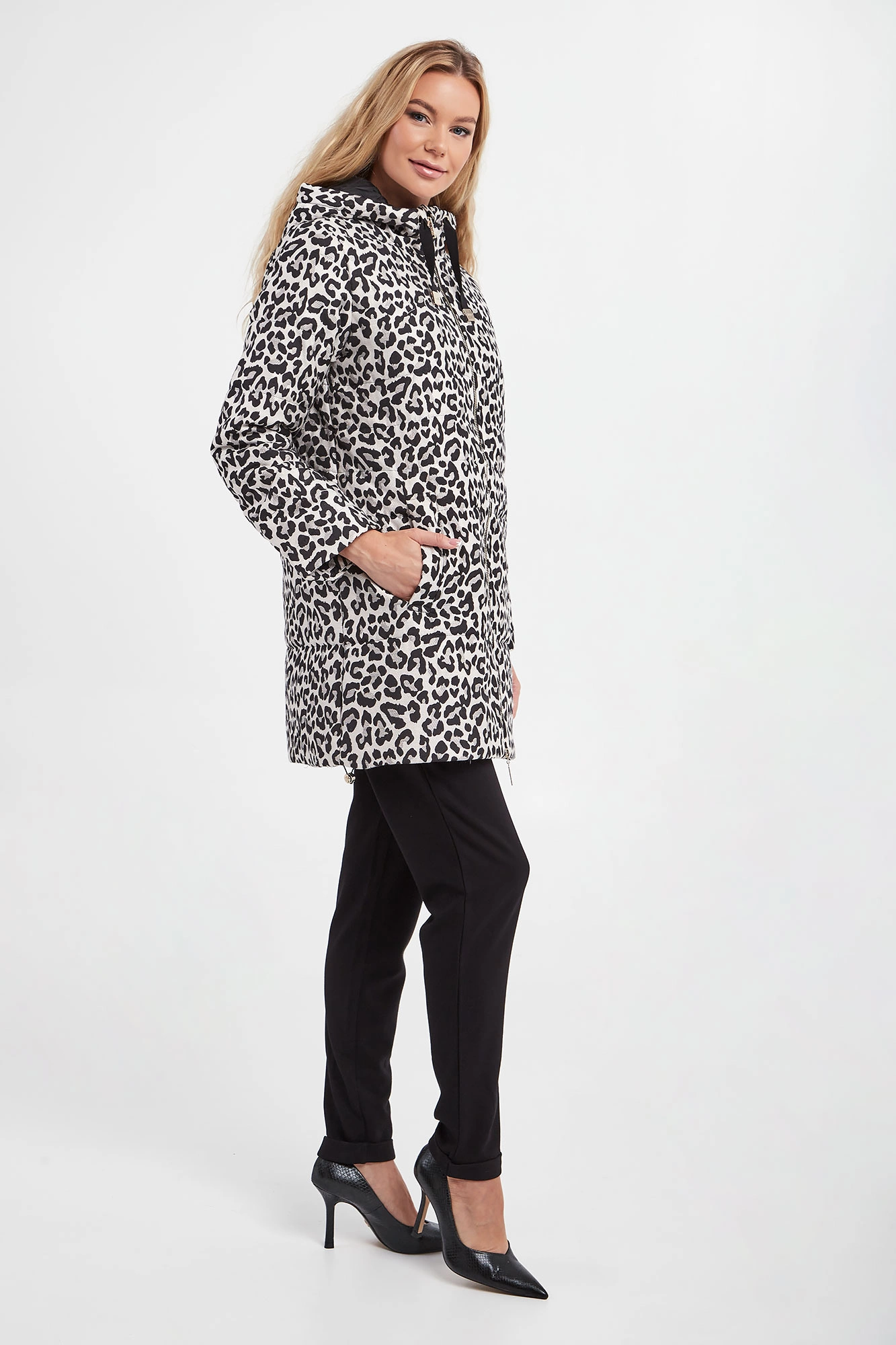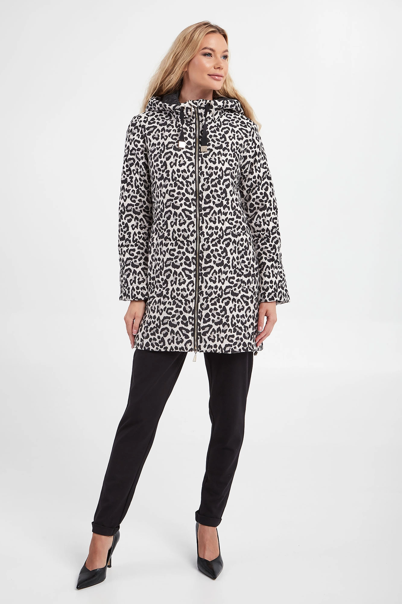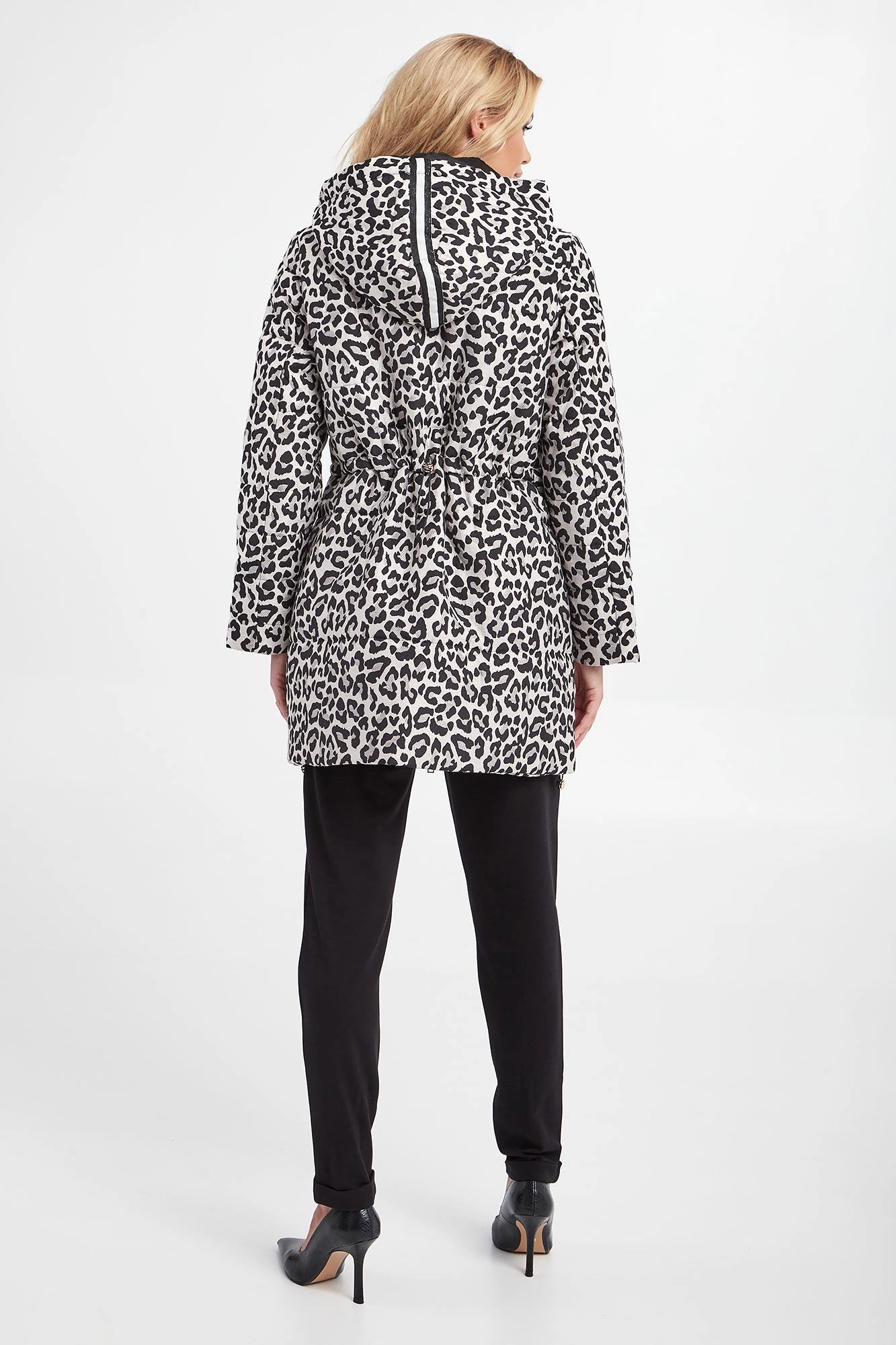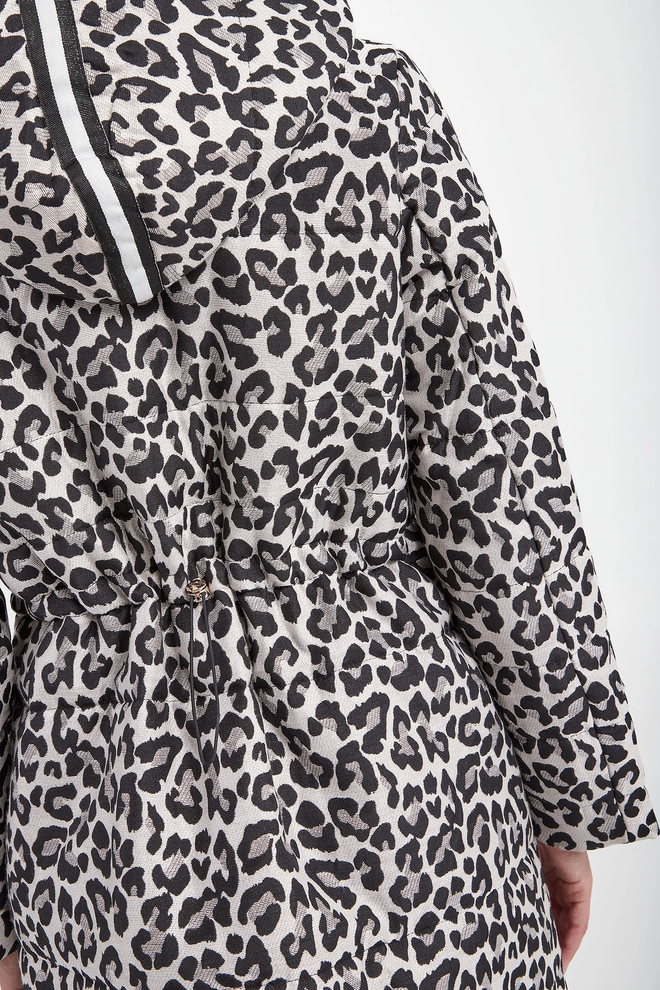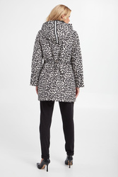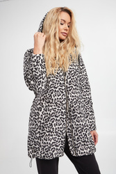 Pikowana kurtka z kapturem marki Liu Jo w kolorze jasnoszarym. Zapinana na podwójny zamek z sygnowanymi zawieszkami. Na całości zwierzęcy print i metalizowana nić. Model z dwiema kieszeniami. Przy kapturze troczki. U dołu ściągacz ze stoperami, umożliwiającymi regulację. Fason typu relaxed fit.