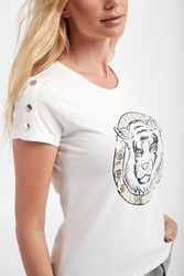 T-shirt marki Liu Jo w białym kolorze. Na froncie nadruk w postaci wizerunku lwa i logo marki. Na krótkich rękawach sygnowane aplikacje w złotym kolorze. Dekolt o-neck wykończony gładkim ściągaczem. Regularny, nieco krótszy fason. T-shirt wykonany z bawełny z dodatkiem elastycznych włókien.