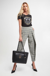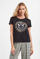 T-shirt marki Liu Jo w czarnym kolorze. Na froncie nadruk w postaci wizerunku lwa i logo marki. Na krótkich rękawach sygnowane aplikacje w złotym kolorze. Dekolt o-neck wykończony gładkim ściągaczem. Regularny, nieco krótszy fason. T-shirt wykonany z bawełny z dodatkiem elastycznych włókien.