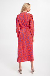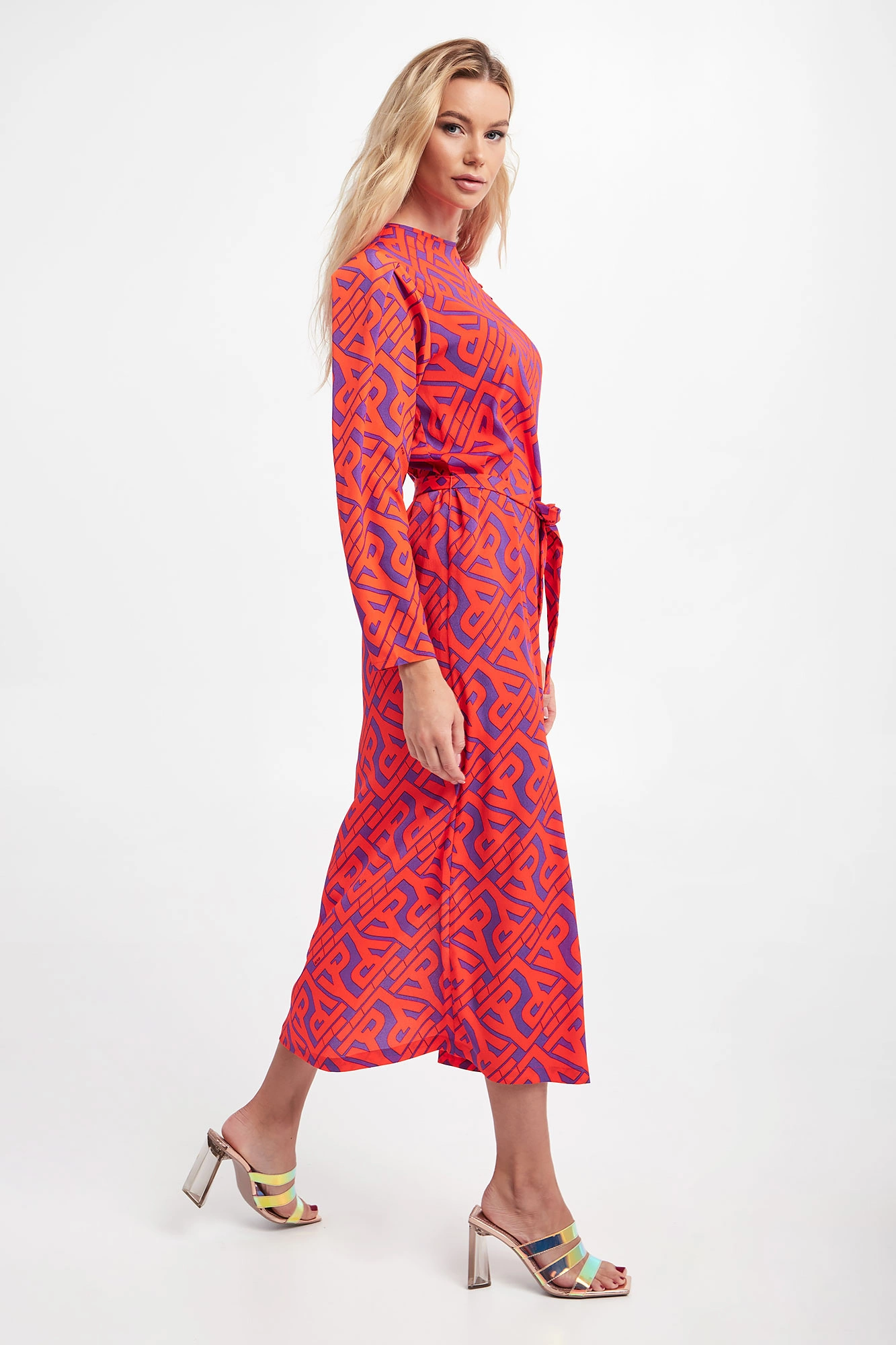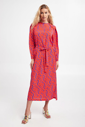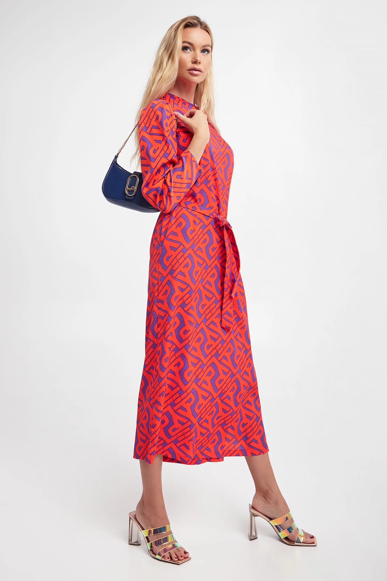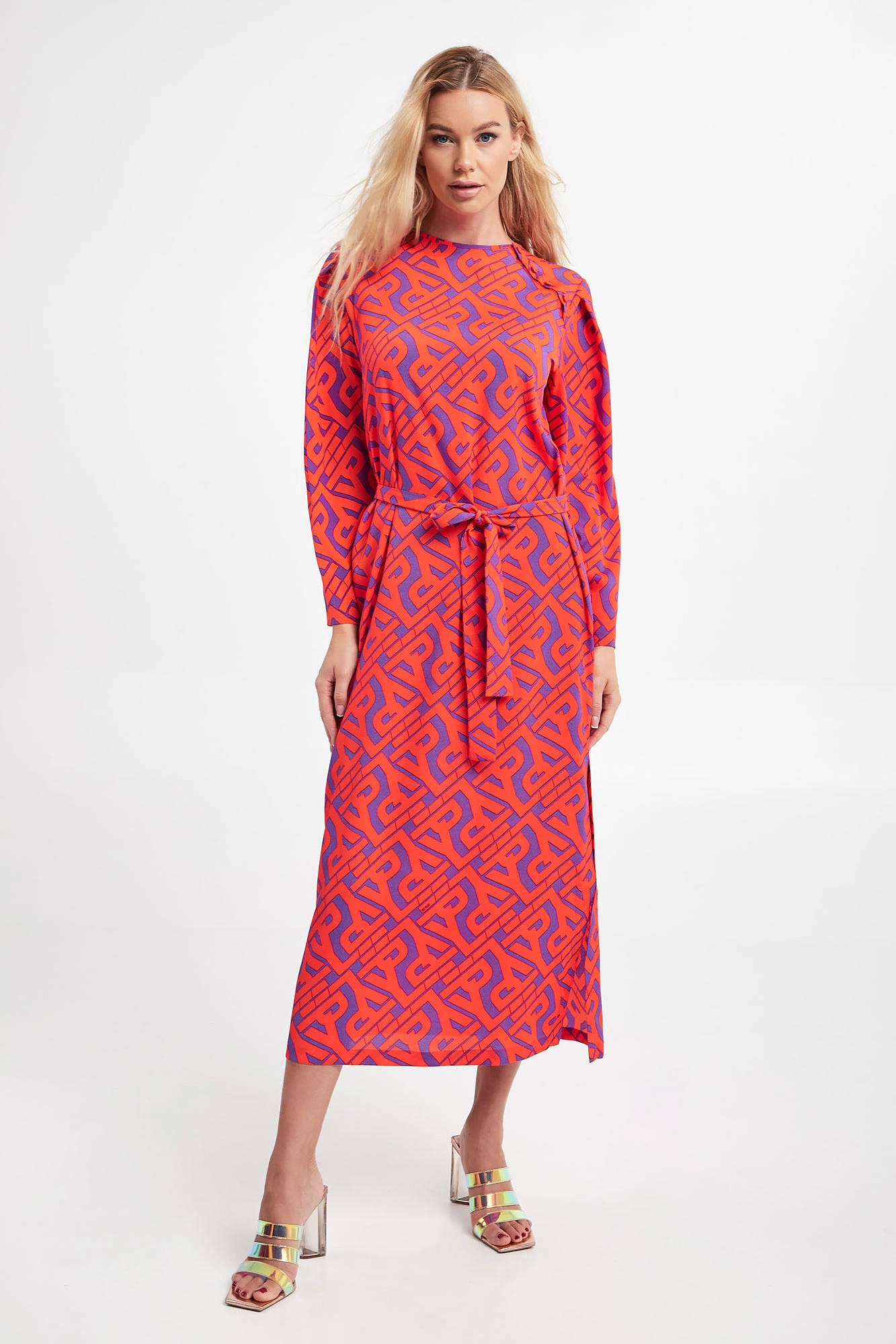 Sukienka marki Ice Play w pomarańczowym kolorze. Na całości wzór w postaci multiplikacji nazwy marki. Przy dekolcie rozcięcie zapinane na guziki. Dekolt typu o-neck. Materiałowy pasek do przewiązania w talii. U boku ozdobne rozcięcie. Regularny fason o długości midi.